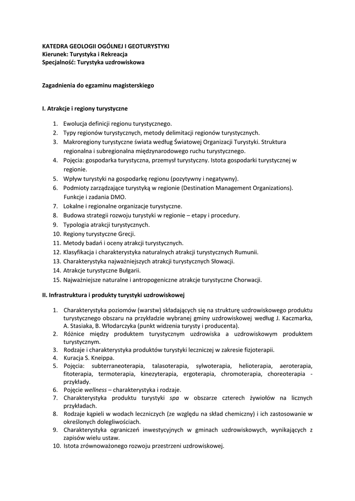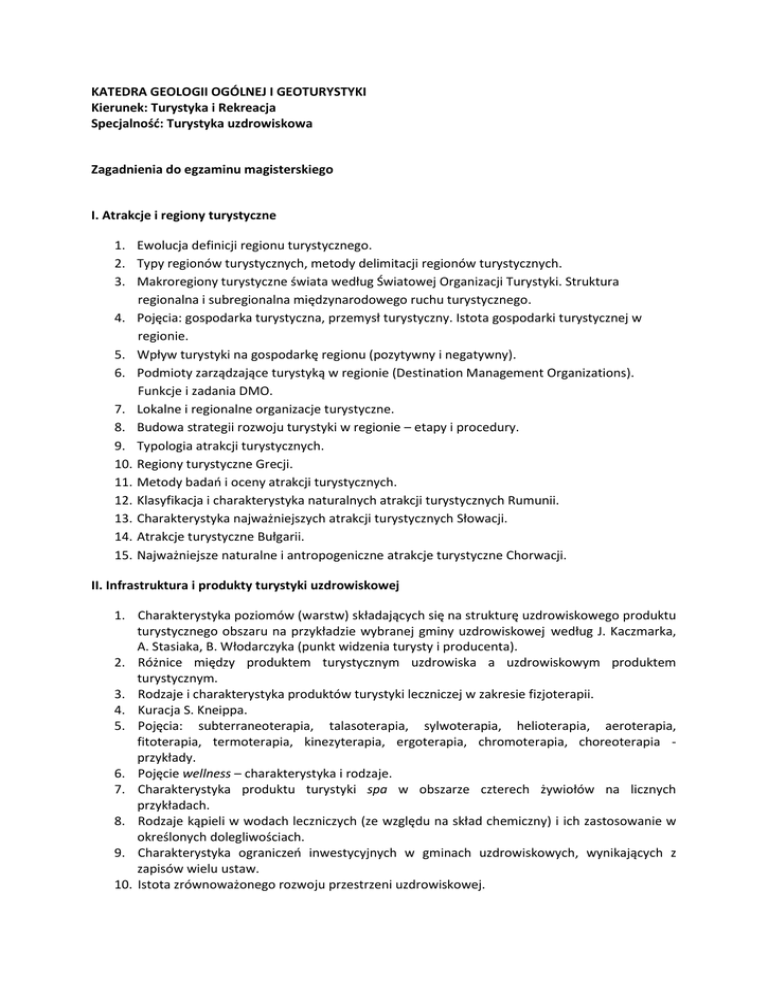 KATEDRA GEOLOGII OGÓLNEJ I GEOTURYSTYKI Kierunek: Turystyka i Rekreacja Specjalność: Turystyka uzdrowiskowa Zagadnienia do egzaminu magisterskiego I. Atrakcje i regiony turystyczne 1. Ewolucja definicji regionu turystycznego. 2. Typy regionów turystycznych, metody delimitacji regionów turystycznych. 3. Makroregiony turystyczne świata według Światowej Organizacji Turystyki. Struktura regionalna i subregionalna międzynarodowego ruchu turystycznego. 4. Pojęcia: gospodarka turystyczna, przemysł turystyczny. Istota gospodarki turystycznej w regionie. 5. Wpływ turystyki na gospodarkę regionu (pozytywny i negatywny). 6. Podmioty zarządzające turystyką w regionie (Destination Management Organizations). Funkcje i zadania DMO. 7. Lokalne i regionalne organizacje turystyczne. 8. Budowa strategii rozwoju turystyki w regionie – etapy i procedury. 9. Typologia atrakcji turystycznych. 10. Regiony turystyczne Grecji. 11. Metody badań i oceny atrakcji turystycznych. 12. Klasyfikacja i charakterystyka naturalnych atrakcji turystycznych Rumunii. 13. Charakterystyka najważniejszych atrakcji turystycznych Słowacji. 14. Atrakcje turystyczne Bułgarii. 15. Najważniejsze naturalne i antropogeniczne atrakcje turystyczne Chorwacji. II. Infrastruktura i produkty turystyki uzdrowiskowej 1. Charakterystyka poziomów (warstw) składających się na strukturę uzdrowiskowego produktu turystycznego obszaru na przykładzie wybranej gminy uzdrowiskowej według J. Kaczmarka, A. Stasiaka, B. Włodarczyka (punkt widzenia turysty i producenta). 2. Różnice między produktem turystycznym uzdrowiska a uzdrowiskowym produktem turystycznym. 3. Rodzaje i charakterystyka produktów turystyki leczniczej w zakresie fizjoterapii. 4. Kuracja S. Kneippa. 5. Pojęcia: subterraneoterapia, talasoterapia, sylwoterapia, helioterapia, aeroterapia, fitoterapia, termoterapia, kinezyterapia, ergoterapia, chromoterapia, choreoterapia przykłady. 6. Pojęcie wellness – charakterystyka i rodzaje. 7. Charakterystyka produktu turystyki spa w obszarze czterech żywiołów na licznych przykładach. 8. Rodzaje kąpieli w wodach leczniczych (ze względu na skład chemiczny) i ich zastosowanie w określonych dolegliwościach. 9. Charakterystyka ograniczeń inwestycyjnych w gminach uzdrowiskowych, wynikających z zapisów wielu ustaw. 10. Istota zrównoważonego rozwoju przestrzeni uzdrowiskowej. 11. Podział infrastruktury uzdrowiskowej w oparciu o przykłady urządzeń (obiektów) w wybranych gminach uzdrowiskowych. 12. Charakterystyka infrastruktury uzdrowiskowej wybranej gminy. 13. Wzory wskaźników zagospodarowania turystycznego i leczniczego wraz z opisem zmiennych i oceną ich zalet i wad. 14. Wzory wskaźników wielkości ruchu turystycznego i leczniczego wraz z opisem zmiennych i oceną ich zalet i wad. 15. Wzory wskaźników przestrzeni turystycznej wraz z opisem zmiennych i określeniem co wyrażają. III. Balneologia 1. 2. 3. 4. 5. 6. 7. 8. 9. 10. 11. 12. 13. 14. 15. Występowanie wód mineralnych i leczniczych na tle prowincji. Surowce balneologiczne Polski. Charakterystyka pojęć: woda lecznicza i woda mineralna. Podział anionowo-kationowy wód mineralnych. Istota balneoterapii. Wykorzystanie wód mineralnych i leczniczych w krenoterapii. Próg farmakodynamiczny pierwiastków biofilnych w wodach mineralnych. Subterraneoterapia. Krioterapia. Peloidoterapia. Kąpiele lecznicze w wodach siarczanowo siarczkowych. Rola skóry w zabiegach balneoterapeutycznych. Zjawiska towarzyszące wypływom szczaw i wód siarczkowych ze źródeł. Charakterystyka wód mineralnych i leczniczych w rejonie doliny Popradu. Podstawowe metody stosowane w lecznictwie uzdrowiskowym.