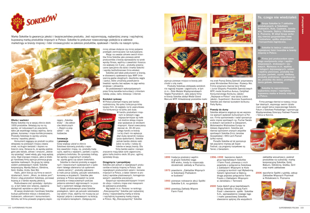 J Grupa Sokołów to 7 zakładów produkcyjnych: w Sokołowie Podlaskim, Kole, Czyżewie, Jarosławiu, Tarnowie, Dębicy i Robakowie k. Poznania. W skład Grupy wchodzą również gospodarstwa rolne i hodowlane, spółka eksportowa i transportowo-logistyczna. Marka Sokołów to gwarancja jakości i bezpieczeństwa produktu. Jest najcenniejszą, najbardziej znaną i najchętniej kupowaną marką produktów mięsnych w Polsce. Sokołów to prekursor nowoczesnego podejścia w zakresie marketingu w branży mięsnej i lider innowacyjności w zakresie produktów, opakowań i handlu na naszym rynku. mniej zdrowe słodycze czy mniej pożywne przekąski ziemniaczane lub kukurydziane. Mając na uwadze zdrowie swoich klientów firma Sokołów jako pierwsza wśród producentów z branży wprowadziła na rynek wyroby fitness, wędliny o zawartości tłuszczu nie większej niż 3 proc., produkty przeznaczone specjalnie dla dzieci (marka Sokolik) i wyroby bezfosforanowe (linia włoska). Sokołów jest także prekursorem w branży, w stosowaniu opakowania typu MAP (mieszanina gazów obojętnych: dwutlenku węgla i azotu), które umożliwią przedłużenie trwałości wyrobu bez wpływu na jego walory smakowe i zdrowotne. Do podstawowych wykorzystywanych przez firmę kanałów komunikacji z klientem należą: prasa, radio, telewizja i internet. Oferta i wartości Marka Sokołów ma w swojej ofercie około 1000 produktów. Składają się na nią wyroby: od luksusowych po popularne, takie jak wszelkiego rodzaju wędliny, dania gotowe, konserwy i mięsa konfekcjonowane. Produkty Sokołowa to wyroby uznanej renomy i wysokiej jakości. Konsument sięgający po produkt na półce sklepowej na pierwszym miejscu stawia smak, na drugim świeżość i dopiero na trzecim cenę. Oznacza to, że wyroby postrzegane jako świeże, zdrowe i smaczne „dobrze się sprzedają” nawet wtedy, gdy mają wyższą cenę. Stąd znaczące miejsce, jakie w strategii handlowej firmy zajmuje promocja grupy wyrobów markowych. Do grupy tej należy siedem podstawowych marek: Sokołów korporacyjny, Wyroby Babuni, Odrobina, Gold, Gratka, Uczta, Darz Bór. Hasło, jakim kieruje się firma w swoich działaniach, brzmi: „Wiem, że dobrze jem!”. Klienci ufają produktom Sokołowa, ponieważ kojarzą je z bardzo wysoką jakością. Rozbudowana sieć sprzedaży i dystrybucji, w tym także sieci własnej, zapewnia dostępność wyrobów w całym kraju. W swojej działalności handlowej Sokołów buduje partnerskie relacje z dostawcami, hodowcami, odbiorcami i konsumentami. Od kilku lat firma prowadzi programy wspie- 102 SUPERBRANDS POLSKA rające: „Sokołów bliżej” – dla odbiorców detalicznych i „Razem w przyszłość” – dla hodowców. Innowacje i promocje Coraz większy udział w ofercie Sokołowa stanowią produkty o wysokiej zawartości mięsa, np. produkty tradycyjne, wędliny z wędzarni, parówki z szynki, polędwica bretońska. Do sprzedaży trafiają też wyroby o oryginalnych smakach, np. szynka gyros czy salami bretońskie. Sokołów to również produkty w wygodnych i bezpiecznych opakowaniach z systemami łatwego otwierania lub systemem „otwórz-zamknij”, produkty pakowane w małe porcje (plastry, paluszki sokołowskie, konserwy w alupakach). Sokołów jako pierwszy w Polsce wprowadził na rynek produkty w niewyczuwalnych podczas jedzenia osłonkach alginianowych i w puszkach z systemem łatwego otwierania. Dzięki produkowanym przez Sokołów przekąskom, takim jak paluszki sokołowskie czy salami chips, wędliny nie muszą się już kojarzyć jedynie z serwowanymi na kolację czy śniadanie kanapkami. Zastępują one Kontekst rynkowy W Polsce przemysł mięsny jest bardzo rozdrobniony. Na rynku funkcjonuje klika tysięcy firm. Ze względu na te uwarunkowania konkurencja na rynku jest duża. W handlu produktami mięsnymi w dalszym ciągu najpopularniejsze są małe lub średnie sklepy mięsne oraz spożywcze ze stoiskami mięsnymi. Kanał nowoczesny stanowi ok. 30–40 proc. całego handlu w branży i w tej chwili nie wykazuje zbyt dużej dynamiki rozwoju (poza dyskontami). Sokołów jednak bardzo dobrze radzi sobie na rynku i należy do liderów w swojej branży. Dla firmy bardzo ważne i rosnące znaczenie mają także rynki zagraniczne, gdzie trafia średnio około 30 proc. ogólnej sprzedaży Grupy. Osiągnięcia i perspektywy Sokołów jest jednym z największych producentów w branży mięsnej w Polsce. Jest największym producentem salami i konserw mięsnych w Polsce, a także liderem w produkcji wyrobów plastrowanych, homogenizowanych i pasztetów pieczonych. Dysponuje najnowocześniejszymi liniami do uboju i rozbioru mięsa oraz maszynami do pakowania produktów. Wg badań m.in. Pentora i w rankingu „Rzeczpospolitej” Sokołów jest najbardziej znaną i rozpoznawalną marką w branży i najchętniej kupowaną marką mięsną w Polsce. Wg „Rzeczpospolitej” Sokołów www.sokolow.pl To, czego nie wiedziałeś J Sokołów to twórca i właściciel największej ilości brandów w branży mięsnej w Polsce. J Firma jest producentem szero- zajmuje pierwsze miejsce w branży jeśli chodzi o siłę marki. Produkty Sokołowa zdobywały wielokrotnie nagrody krajowe i zagraniczne, w tym m.in.: Złote Medale Międzynarodowych Targów Poznańskich. Jako jedyna firma w branży Sokołów zdobył Medal Grand Mercure MTP. Kilkadziesiąt produktów marki ma znak Poznaj Dobrą Żywność przyznawany przez Ministerstwo Rolnictwa i Rozwoju Wsi. Firmie przyznano również tytuł Mister i Junior Eksportu Produktów Żywnościowych MTP, medal Acanthus Aureus, Certyfikat Konsumenckiego Konkursu Jakości „Najlepsze w Polsce” oraz tytuły Lidera Jakości, Superbrand i Business Superbrand. Sokołów jest również laureatem konkursu Perły Rynku. Powody do dumy Sokołów aktywnie angażuje się we wspieranie ważnych wydarzeń kulturalnych w Polsce. Firma sponsorowała i nadal sponsoruje wiele imprez sportowych 