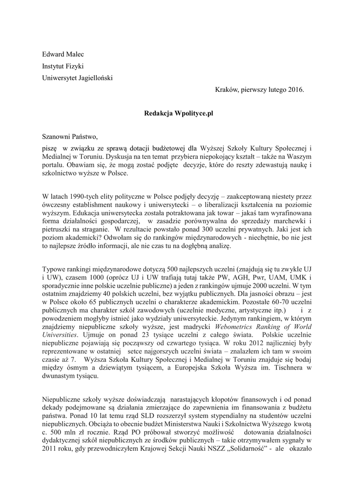 Edward Malec Instytut Fizyki Uniwersytet Jagielloński Kraków, pierwszy lutego 2016. Redakcja Wpolityce.pl Szanowni Państwo, piszę w związku ze sprawą dotacji budżetowej dla Wyższej Szkoły Kultury Społecznej i Medialnej w Toruniu. Dyskusja na ten temat przybiera niepokojący kształt – także na Waszym portalu. Obawiam się, że mogą zostać podjęte decyzje, które do reszty zdewastują naukę i szkolnictwo wyższe w Polsce. W latach 1990-tych elity polityczne w Polsce podjęły decyzję – zaakceptowaną niestety przez ówczesny establishment naukowy i uniwersytecki – o liberalizacji kształcenia na poziomie wyższym. Edukacja uniwersytecka została potraktowana jak towar – jakaś tam wyrafinowana forma działalności gospodarczej, w zasadzie porównywalna do sprzedaży marchewki i pietruszki na straganie. W rezultacie powstało ponad 300 uczelni prywatnych. Jaki jest ich poziom akademicki? Odwołam się do rankingów międzynarodowych - niechętnie, bo nie jest to najlepsze źródło informacji, ale nie czas tu na dogłębną analizę. Typowe rankingi międzynarodowe dotyczą 500 najlepszych uczelni (znajdują się tu zwykle UJ i UW), czasem 1000 (oprócz UJ i UW trafiają tutaj także PW, AGH, Pwr, UAM, UMK i sporadycznie inne polskie uczelnie publiczne) a jeden z rankingów ujmuje 2000 uczelni. W tym ostatnim znajdziemy 40 polskich uczelni, bez wyjątku publicznych. Dla jasności obrazu – jest w Polsce około 65 publicznych uczelni o charakterze akademickim. Pozostałe 60-70 uczelni publicznych ma charakter szkół zawodowych (uczelnie medyczne, artystyczne itp.) i z powodzeniem mogłyby istnieć jako wydziały uniwersyteckie. Jedynym rankingiem, w którym znajdziemy niepubliczne szkoły wyższe, jest madrycki Webometrics Ranking of World Universities. Ujmuje on ponad 23 tysiące uczelni z całego świata. Polskie uczelnie niepubliczne pojawiają się począwszy od czwartego tysiąca. W roku 2012 najliczniej były reprezentowane w ostatniej setce najgorszych uczelni świata – znalazłem ich tam w swoim czasie aż 7. Wyższa Szkoła Kultury Społecznej i Medialnej w Toruniu znajduje się bodaj między ósmym a dziewiątym tysiącem, a Europejska Szkoła Wyższa im. Tischnera w dwunastym tysiącu. Niepubliczne szkoły wyższe doświadczają narastających kłopotów finansowych i od ponad dekady podejmowane są działania zmierzające do zapewnienia im finansowania z budżetu państwa. Ponad 10 lat temu rząd SLD rozszerzył system stypendialny na studentów uczelni niepublicznych. Obciąża to obecnie budżet Ministerstwa Nauki i Szkolnictwa Wyższego kwotą c. 500 mln zł rocznie. Rząd PO próbował stworzyć możliwość dotowania działalności dydaktycznej szkół niepublicznych ze środków publicznych – takie otrzymywałem sygnały w 2011 roku, gdy przewodniczyłem Krajowej Sekcji Nauki NSZZ „Solidarność” - ale okazało się, że wymaga to kwoty nawet 3 mld złotych rocznie – 1/4 rocznego budżetu MNiSW. Minister Barbara Kudrycka nie zdecydowała się na ten ryzykowny krok, a jej następcy – pragnę wyróżnić tutaj wiceministrów Darię Lipińską-Nałęcz i Marka Ratajczaka – dokonali zmiany ustawowej uniemożliwiającej dotowanie szkół niepublicznych z budżetu państwa. Byłem świadkiem tych działań. KSN NSZZ „Solidarność” zawsze zdecydowanie opowiadała się przeciw dotowaniu szkół niepublicznych z budżetu. Obawiam się, że sprawa Wyższej Szkoły Kultury Społecznej i Medialnej w Toruniu zostanie wykorzystana dla przeforsowania decyzji, przed podjęciem której zawahała się PO. Niewątpliwe osiągnięcia ojca Tadeusza Rydzyka – twórcy koncernu medialnego, bardzo ważnego nie tylko dla prawej strony sceny politycznej – zostaną wykorzystane w celu zapewnienia pieniędzy dla instytucji, których braku nikt na świecie nawet nie zauważy. Jest tu aspekt polityczny – zabranie 3 mld złotych uczelniom publicznym może doprowadzić do rewolty akademickiej. Ważniejsze są jednak skutki cywilizacyjne. Sądzę, że ponad 90% światowej gospodarki opiera się na dorobku nauk fizycznych, przyrodniczych i technicznych. Newton, Einstein, Bohr, Banach, Schroedinger - w sposób pośredni (za pośrednictwem tysięcy wynalazców, doświadczalników, przedstawicieli nauk technicznych) ukształtowali naszą materialną rzeczywistość. GPS – przychody przemysłu związanego z GPS szacowane są na ponad 26 mld $ w 2016 roku – nie mógłby istnieć bez ogólnej teorii względności, uważanej potocznie za coś bardzo ezoterycznego. Tymczasem polskie szkoły niepubliczne są niemal nieobecne w tych właśnie ważnych cywilizacyjnie dyscyplinach. Pragnę z całą mocą przestrzec przed interpretowaniem mojej wypowiedzi jako przejawu lekceważenia dyscyplin humanistycznych i artystycznych. Innowacyjność nie jest wypracowywana w uczelniach – wbrew twierdzeniu niektórych polityków - ale innowacyjność robią absolwenci kierunków ścisłych, przyrodniczych, technicznych. Absolwenci polskich uczelni niepublicznych, takich jakie one są i jakie będą w przewidywalnej przyszłości, mogą w najlepszym razie o innowacyjności pisać i mówić. Odebranie uczelniom publicznym kwoty stanowiącej 1/5 – 1/4 ich całkowitych dochodów z całą pewnością doprowadzi do pogłębienia regresu cywilizacyjnego Polski. Szanowni Państwo, wielokrotnie udostępnialiście Wasz portal dla prezentacji stanowiska KSN NSZZ „Solidarność”, któremu w swoim czasie przewodniczyłem. Mam nadzieję, że uznacie ten list za pożyteczny i udostępnicie go opinii publicznej. Z poważaniem Prof. Edward Malec członek Rady Programowej PiS Przewodniczący KSN NSZZ „Solidarność” w latach 2010-14.