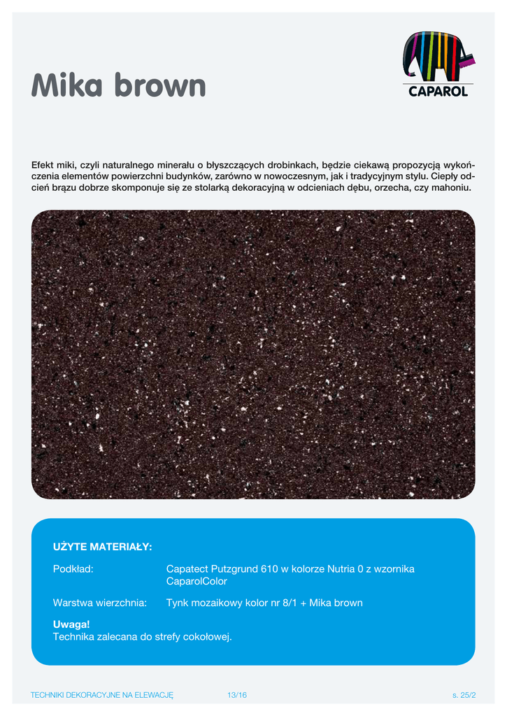 Mika brown Efekt miki, czyli naturalnego minerału o błyszczących drobinkach, będzie ciekawą propozycją wykończenia elementów powierzchni budynków, zarówno w nowoczesnym, jak i tradycyjnym stylu. Ciepły odcień brązu dobrze skomponuje się ze stolarką dekoracyjną w odcieniach dębu, orzecha, czy mahoniu. UŻYTE MATERIAŁY: Podkład: Capatect Putzgrund 610 w kolorze Nutria 0 z wzornika CaparolColor Warstwa wierzchnia: Tynk mozaikowy kolor nr 8/1 + Mika brown Uwaga! Technika zalecana do strefy cokołowej. TECHNIKI DEKORACYJNE NA ELEWACJĘ 13/16 s. 25/2 Mika brown krok po kroku KROK 1 Na przygotowaną wcześniej warstwę zbrojącą ocieplenia elewacji, za pomocą wałka nałożyć farbę podkładową Capatect Putzgrund 610 (w kolorze Nutria 0 z wzornika CaparolColor). KROK 2 Po wyschnięciu, za pomocą pacy ze stali nierdzewnej nanieść tynk mozaikowy w kolorze nr 8/1 + Mika brown na grubość ziarna. KROK 3 Następnie tą samą pacą wygładzić powłokę tynku całą powierzchnią pacy. Poznaj pozostałe techniki dekoracji elewacji na www.caparol.pl TECHNIKI DEKORACYJNE NA ELEWACJĘ 13/16 s. 26/2