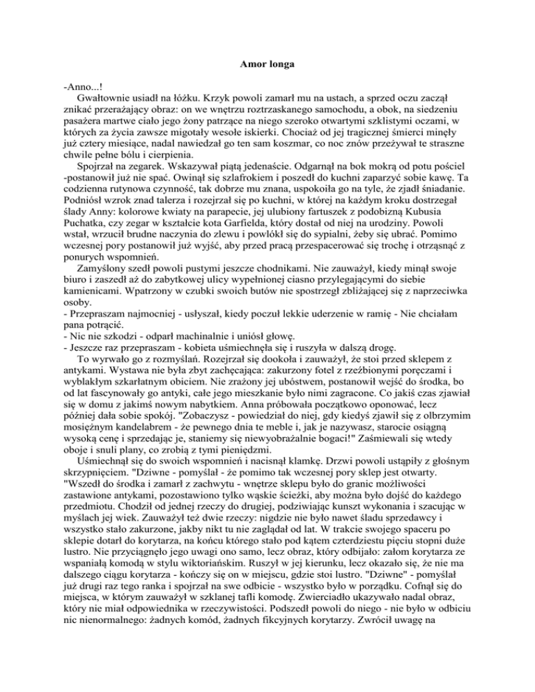Amor longa -Anno...! Gwałtownie usiadł na łóżku. Krzyk powoli zamarł mu na ustach, a sprzed oczu zaczął znikać przerażający obraz: on we wnętrzu roztrzaskanego samochodu, a obok, na siedzeniu pasażera martwe ciało jego żony patrzące na niego szeroko otwartymi szklistymi oczami, w których za życia zawsze migotały wesołe iskierki. Chociaż od jej tragicznej śmierci minęły już cztery miesiące, nadal nawiedzał go ten sam koszmar, co noc znów przeżywał te straszne chwile pełne bólu i cierpienia. Spojrzał na zegarek. Wskazywał piątą jedenaście. Odgarnął na bok mokrą od potu pościel -postanowił już nie spać. Owinął się szlafrokiem i poszedł do kuchni zaparzyć sobie kawę. Ta codzienna rutynowa czynność, tak dobrze mu znana, uspokoiła go na tyle, że zjadł śniadanie. Podniósł wzrok znad talerza i rozejrzał się po kuchni, w której na każdym kroku dostrzegał ślady Anny: kolorowe kwiaty na parapecie, jej ulubiony fartuszek z podobizną Kubusia Puchatka, czy zegar w kształcie kota Garfielda, który dostał od niej na urodziny. Powoli wstał, wrzucił brudne naczynia do zlewu i powlókł się do sypialni, żeby się ubrać. Pomimo wczesnej pory postanowił już wyjść, aby przed pracą przespacerować się trochę i otrząsnąć z ponurych wspomnień. Zamyślony szedł powoli pustymi jeszcze chodnikami. Nie zauważył, kiedy minął swoje biuro i zaszedł aż do zabytkowej ulicy wypełnionej ciasno przylegającymi do siebie kamienicami. Wpatrzony w czubki swoich butów nie spostrzegł zbliżającej się z naprzeciwka osoby. - Przepraszam najmocniej - usłyszał, kiedy poczuł lekkie uderzenie w ramię - Nie chciałam pana potrącić. - Nic nie szkodzi - odparł machinalnie i uniósł głowę. - Jeszcze raz przepraszam - kobieta uśmiechnęła się i ruszyła w dalszą drogę. To wyrwało go z rozmyślań. Rozejrzał się dookoła i zauważył, że stoi przed sklepem z antykami. Wystawa nie była zbyt zachęcająca: zakurzony fotel z rzeźbionymi poręczami i wyblakłym szkarłatnym obiciem. Nie zrażony jej ubóstwem, postanowił wejść do środka, bo od lat fascynowały go antyki, całe jego mieszkanie było nimi zagracone. Co jakiś czas zjawiał się w domu z jakimś nowym nabytkiem. Anna próbowała początkowo oponować, lecz później dała sobie spokój. "Zobaczysz - powiedział do niej, gdy kiedyś zjawił się z olbrzymim mosiężnym kandelabrem - że pewnego dnia te meble i, jak je nazywasz, starocie osiągną wysoką cenę i sprzedając je, staniemy się niewyobrażalnie bogaci!" Zaśmiewali się wtedy oboje i snuli plany, co zrobią z tymi pieniędzmi. Uśmiechnął się do swoich wspomnień i nacisnął klamkę. Drzwi powoli ustąpiły z głośnym skrzypnięciem. "Dziwne - pomyślał - że pomimo tak wczesnej pory sklep jest otwarty. "Wszedł do środka i zamarł z zachwytu - wnętrze sklepu było do granic możliwości zastawione antykami, pozostawiono tylko wąskie ścieżki, aby można było dojść do każdego przedmiotu. Chodził od jednej rzeczy do drugiej, podziwiając kunszt wykonania i szacując w myślach jej wiek. Zauważył też dwie rzeczy: nigdzie nie było nawet śladu sprzedawcy i wszystko stało zakurzone, jakby nikt tu nie zaglądał od lat. W trakcie swojego spaceru po sklepie dotarł do korytarza, na końcu którego stało pod kątem czterdziestu pięciu stopni duże lustro. Nie przyciągnęło jego uwagi ono samo, lecz obraz, który odbijało: załom korytarza ze wspaniałą komodą w stylu wiktoriańskim. Ruszył w jej kierunku, lecz okazało się, że nie ma dalszego ciągu korytarza - kończy się on w miejscu, gdzie stoi lustro. "Dziwne" - pomyślał już drugi raz tego ranka i spojrzał na swe odbicie - wszystko było w porządku. Cofnął się do miejsca, w którym zauważył w szklanej tafli komodę. Zwierciadło ukazywało nadal obraz, który nie miał odpowiednika w rzeczywistości. Podszedł powoli do niego - nie było w odbiciu nic nienormalnego: żadnych komód, żadnych fikcyjnych korytarzy. Zwrócił uwagę na prostokątną ramę: była piękna, z orzechowego drewna, rzeźbiona w ornamenty roślinne i zwierzęce, jednak miała pewien mankament: w górnej części zdobienia gwałtownie się urywały, przechodząc w gładką po wierzchnie nie tkniętą dłutem rzeźbiarza. Nagle coś zwróciło jego uwagę w samym lustrze: jego sylwetka pozostała wyraźna, ale część odbicia przestrzeni za nim zmętniała, a na jej miejscu pojawiła się sylwetka jego żony, tak jakby stała tuż za nim. - Anno... - wyszeptał i gwałtownie obrócił się. Za nim nie było nikogo. Znów spojrzał na lustro. Widział ją wyraźnie: pszenicznozłote włosy, zielone oczy i uśmiech, który tak często rozjaśniał jej twarz. Serce biło mu w piersi jak oszalałe. Powoli podniósł dłoń, chcąc dotknąć jej odbicia... - W czym mogę panu pomóc? - usłyszał głos i odbicie żony zniknęło. Obrócił się i zobaczył stojącą w korytarzu zasuszoną staruszkę. Wciąż jeszcze oszołomiony wizją, oparł się ciężko o lustro i zauważył, że jest ciepłe. - Chciałbym je kupić - powiedział, wskazując ruchem głowy zwierciadło, nie zastanawiając się nad j ego ceną. - Świetny wybór - powiedziała kobieta - Musi pan wiedzieć, że każdy przedmiot w tym sklepie ma swoją historię - podobnie to lustro. Legenda mówi, że należało ono do Ksawerego Aurusa, nadwornego alchemika Anny Jagiellonki. Podobno stało w jego pracowni i było przedmiotem specjalnej troski. Któregoś dnia Aurus zniknął, znaleziono tylko leżący nieopodal lustra list pożegnalny z tajemniczą inskrypcją po łacinie, której sensu nikt nie rozumiał. Nigdy nie dowiedziano się, co miał na myśli... Ale to tylko legenda - dorzuciła na zakończenie. Obrzucił spojrzeniem lustro. - Przyjadę po nie o szesnastej - odrzekł i skierował się do wyjścia. Staruszka odprowadziła go wzrokiem do drzwi, a tajemniczy uśmiech bł
