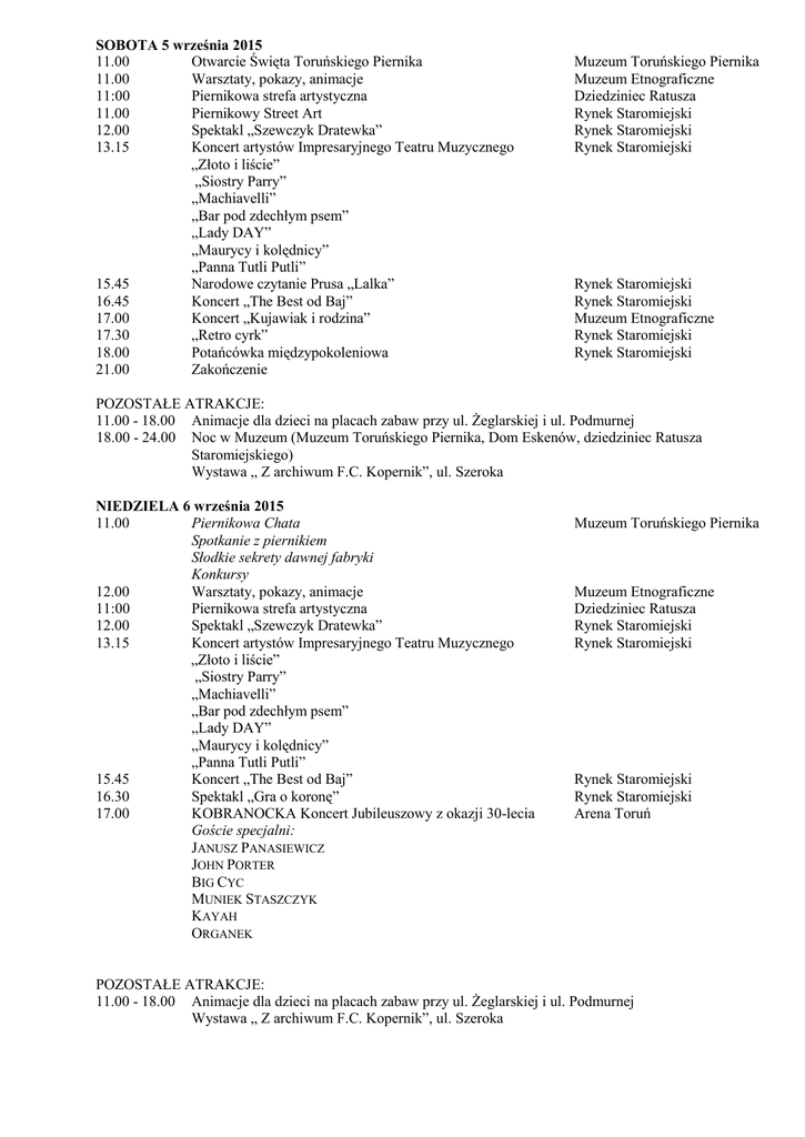 SOBOTA 5 września 2015 11.00 Otwarcie Święta Toruńskiego Piernika 11.00 Warsztaty, pokazy, animacje 11:00 Piernikowa strefa artystyczna 11.00 Piernikowy Street Art 12.00 Spektakl „Szewczyk Dratewka” 13.15 Koncert artystów Impresaryjnego Teatru Muzycznego „Złoto i liście” „Siostry Parry” „Machiavelli” „Bar pod zdechłym psem” „Lady DAY” „Maurycy i kolędnicy” „Panna Tutli Putli” 15.45 Narodowe czytanie Prusa „Lalka” 16.45 Koncert „The Best od Baj” 17.00 Koncert „Kujawiak i rodzina” 17.30 „Retro cyrk” 18.00 Potańcówka międzypokoleniowa 21.00 Zakończenie Muzeum Toruńskiego Piernika Muzeum Etnograficzne Dziedziniec Ratusza Rynek Staromiejski Rynek Staromiejski Rynek Staromiejski Rynek Staromiejski Rynek Staromiejski Muzeum Etnograficzne Rynek Staromiejski Rynek Staromiejski POZOSTAŁE ATRAKCJE: 11.00 - 18.00 Animacje dla dzieci na placach zabaw przy ul. Żeglarskiej i ul. Podmurnej 18.00 - 24.00 Noc w Muzeum (Muzeum Toruńskiego Piernika, Dom Eskenów, dziedziniec Ratusza Staromiejskiego) Wystawa „ Z archiwum F.C. Kopernik”, ul. Szeroka NIEDZIELA 6 września 2015 11.00 Piernikowa Chata Spotkanie z piernikiem Słodkie sekrety dawnej fabryki Konkursy 12.00 Warsztaty, pokazy, animacje 11:00 Piernikowa strefa artystyczna 12.00 Spektakl „Szewczyk Dratewka” 13.15 Koncert artystów Impresaryjnego Teatru Muzycznego „Złoto i liście” „Siostry Parry” „Machiavelli” „Bar pod zdechłym psem” „Lady DAY” „Maurycy i kolędnicy” „Panna Tutli Putli” 15.45 Koncert „The Best od Baj” 16.30 Spektakl „Gra o koronę” 17.00 KOBRANOCKA Koncert Jubileuszowy z okazji 30-lecia Goście specjalni: JANUSZ PANASIEWICZ JOHN PORTER BIG CYC MUNIEK STASZCZYK KAYAH ORGANEK Muzeum Toruńskiego Piernika Muzeum Etnograficzne Dziedziniec Ratusza Rynek Staromiejski Rynek Staromiejski Rynek Staromiejski Rynek Staromiejski Arena Toruń POZOSTAŁE ATRAKCJE: 11.00 - 18.00 Animacje dla dzieci na placach zabaw przy ul. Żeglarskiej i ul. Podmurnej Wystawa „ Z archiwum F.C. Kopernik”, ul. Szeroka