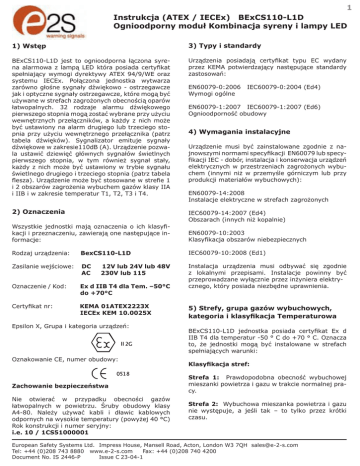 1 Instrukcja (ATEX / IECEx) BExCS110-L1D Ognioodporny moduł Kombinacja syreny i lampy LED 1) Wstęp 3) Typy i standardy BExCS110-L1D jest to ognioodporna łączona syrena alarmowa z lampą LED która posiada certyfikat spełniający wymogi dyrektywy ATEX 94/9/WE oraz systemu IECEx. Połączona jednostka wytwarza zarówno głośne sygnały dźwiękowo - ostrzegawcze jak i optyczne sygnały ostrzegawcze, które mogą być używane w strefach zagrożonych obecnością oparów łatwopalnych. 32 rodzaje alarmu dźwiękowego pierwszego stopnia mogą zostać wybrane przy użyciu wewnętrznych przełączników, a każdy z nich może być ustawiony na alarm drugiego lub trzeciego stopnia przy użyciu wewnętrznego przełącznika (patrz tabela dźwięków). Sygnalizator emituje sygnały dźwiękowe w zakresie110dB (A). Urządzenie pozwala ustawić dziewięć głównych sygnałów świetlnych pierwszego stopnia, w tym również sygnał stały, każdy z nich może być ustawiony w trybie sygnału świetlnego drugiego i trzeciego stopnia (patrz tabela flesza). Urządzenie może być stosowane w strefie 1 i 2 obszarów zagrożenia wybuchem gazów klasy IIA i IIB i w zakresie temperatur T1, T2, T3 i T4. Urządzenia posiadają certyfikat typu EC wydany przez KEMA potwierdzający następujące standardy zastosowań: 2) Oznaczenia IEC60079-14:2007 (Ed4) Obszarach (innych niż kopalnie) Wszystkie jednostki mają oznaczenia o ich klasyfikacji i przeznaczeniu, zawierają one następujące informacje: EN60079-0:2006 Wymogi ogólne IEC60079-0:2004 (Ed4) EN60079-1:2007 IEC60079-1:2007 (Ed6) Ognioodporność obudowy 4) Wymagania instalacyjne Urządzenie musi być zainstalowane zgodnie z najnowszymi normami specyfikacji EN60079 lub specyfikacji IEC - dobór, instalacja i konserwacja urządzeń elektrycznych w przestrzeniach zagrożonych wybuchem (innymi niż w przemyśle górniczym lub przy produkcji materiałów wybuchowych): EN60079-14:2008 Instalacje elektryczne w strefach zagrożonych EN60079-10:2003 Klasyfikacja obszarów niebezpiecznych Rodzaj urządzenia: BexCS110-L1D IEC60079-10:2008 (Ed1) Zasilanie wejściowe: DC AC Oznaczenie / Kod: Ex d IIB T4 dla Tem. –50°C do +70°C Instalacja urządzenia musi odbywać się zgodnie z lokalnymi przepisami. Instalacje powinny być przeprowadzane wyłącznie przez inżyniera elektrycznego, który posiada niezbędne uprawnienia. Certyfikat nr: KEMA 01ATEX2223X IECEx KEM 10.0025X 12V lub 24V lub 48V 230V lub 115 Epsilon X, Grupa i kategoria urządzeń: Oznakowanie CE, numer obudowy: Zachowanie bezpieczeństwa Nie otwierać w przypadku obecności gazów łatwopalnych w powietrzu. Śruby obudowy klasy A4-80. Należy używać kabli i dławic kablowych odpornych na wysokie temperatury (powyżej 40 °C) Rok konstrukcji i numer seryjny: i.e. 10 / 1CS51000001 5) Strefy, grupa gazów wybuchowych, kategoria i klasyfikacja Temperaturowa BExCS110-L1D jednostka posiada certyfikat Ex d IIB T4 dla temperatur -50 ° C do +70 ° C. Oznacza to, że jednostki mogą być instalowane w strefach spełniających warunki: Klasyfikacja stref: Strefa 1: Prawdopodobna obecność wybuchowej mieszanki powietrza i gazu w trakcie normalnej pracy. Strefa 2: Wybuchowa mieszanka powietrza i gazu nie występuje, a jeśli tak – to tylko przez krótki czasu. European Safety Systems Ltd. Impress House, Mansell Road, Acton, London W3 7QH [email protected] Tel: +44 (0)208 743 8880 www.e-2-s.com Fax: +44 (0)208 740 4200 Document No. IS 2446-P Issue C23-04-1 2 7) Bezpieczeństwo pracy (zagrożenie elektrostatyczne) Klasyfikacja gazów: Grupa II A: Propan Grupa II B: Etylen Kategoria wyposażenia / sprzętu: 2G Megafon jest wykonany z plastiku ABS, aby uniknąć możliwego wyładowania elektrostatycznego – urządzenie powinno być czyszczone tylko wilgotną ściereczką. Klasyfikacja temperatur: T1 T2 T3 T4 8) Dostęp do części ognioodpornej obudowy 400°C 300°C 200°C 135°C Zakres temperatury otoczenia: –50°C do +70°C 6) Lokalizacja i Montaż Umiejscowienie urządzenia powinno być dokonane z uwzględnieniem parametrów obszaru, na którym syrena dźwiękowa i świetlny sygnał ostrzegawczy powinny być wyraźnie słyszalne i widoczne. Urządzenie powinno być mocowane do wsporników, które mogą udźwignąć ciężar urządzenia. Urządzenie powinno być zamocowane do odpowiedniej powierzchni za pomocą uchwytu w kształcie litery U (patrz rysunek 1) – przy użyciu śrub. Kąt urządzenia może być regulowany w celu zapewnienia optymalnego odbioru sygnałów zarówno świetlnych, jak i dźwiękowych. Można to osiągnąć poprzez poluzowanie śrub po bokach urządzenia, które umożliwiają regulację skokowo o kąt 18 °. Po zakończeniu montażu dwie duże śruby regulacyjne wspornika na bokach urządzenia muszą być całkowicie dokręcone, aby urządzenie nie poruszało się w trakcie pracy. Plastikowy megafon Sekcja alarmu akustycznego Sekcja lampy LED Aby podłączyć zasilające przewody elektryczne do urządzenia należy odłączyć sekcję lampy alarmowej w celu uzyskania dostępu do komory ognioodpornej. Trzeba odkręcić cztery śruby typu M6 z łbem sześciokątnym (patrz rysunek 2) i odłączyć sekcję lampy alarmowej zachowując szczególną ostrożność, aby nie uszkodzić ognioodpornych łącz komory. Tylko śruby M6 klasy A4-80 ze stali nierdzewnej mogą być używane w urządzeniach tej kategorii. Ważne jest zatem, aby śruby i ich podkładki były przechowywane w bezpiecznym miejscu podczas tej instalacji. Po zakończeniu instalacji okablowania należy się upewnić, że łącza komory ogniotrwałej są czyste i nie zostały uszkodzone w trakcie instalacji. Należy również sprawdzić, czy przewód uziemienia między dwoma sekcjami jest zabezpieczony i czy uszczelka jest na miejscu. Przy wymianie sekcji lampy ostrzegawczej, przed ponownym jej połączeniem z sekcją syreny alarmowej, należy sprawdzić dopasowanie elementów głównych sekcji. Ostrożnie wsuń sekcję 