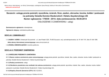 6.8.2014 bzp1.portal.uzp.gov.pl/index.php?ogloszenie=show&pozycja=170039&rok=2014-08-06 Adres strony internetowej, na której Zamawiający udostępnia Specyfikację Istotnych Warunków Zamówienia: www.univ.szczecin.pl Szczecin: usługę prania pościeli, ręczników, ścierek, firan, zasłon, obrusów, koców, kołder i poduszek na potrzeby Osiedla Domów Studenckich i Hotelu Asystenckiego US Numer ogłoszenia: 170039 - 2014; data zamieszczenia: 06.08.2014 OGŁOSZENIE O ZAMÓWIENIU - usługi Zamieszczanie ogłoszenia: obowiązkowe. Ogłoszenie dotyczy: zamówienia publicznego. SEKCJA I: ZAMAWIAJĄCY I. 1) NAZWA I ADRES: Uniwersytet Szczeciński , al. Jana Pawła II 22A, 70-453 Szczecin, woj. zachodniopomorskie, tel. 91 444 1151, faks 91 444 1065. Adres strony internetowej zamawiającego: www.univ.szczecin.pl I. 2) RODZAJ ZAMAWIAJĄCEGO: Uczelnia publiczna. SEKCJA II: PRZEDMIOT ZAMÓWIENIA II.1) OKREŚLENIE PRZEDMIOTU ZAMÓWIENIA II.1.1) Nazwa nadana zamówieniu przez zamawiającego: usługę prania pościeli, ręczników, ścierek, firan, zasłon, obrusów, koców, kołder i poduszek na potrzeby Osiedla Domów Studenckich i Hotelu Asystenckiego US. II.1.2) Rodzaj zamówienia: usługi. II.1.4) Określenie przedmiotu oraz wielkości lub zakresu zamówienia: usługę prania pościeli, ręczników, ścierek, firan, zasłon, obrusów, koców, kołder i poduszek na potrzeby Osiedla Domów Studenckich i Hotelu Asystenckiego US.. II.1.6) Wspólny Słownik Zamówień (CPV): 98.31.20.00-3. http://bzp1.portal.uzp.gov.pl/index.php?ogloszenie=show&pozycja=170039&rok=2014-08-06 1/6 6.8.2014 bzp1.portal.uzp.gov.pl/index.php?ogloszenie=show&pozycja=170039&rok=2014-08-06 II.1.7) Czy dopuszcza się złożenie oferty częściowej: nie. II.1.8) Czy dopuszcza się złożenie oferty wariantowej: nie. II.2) CZAS TRWANIA ZAMÓWIENIA LUB TERMIN WYKONANIA: Okres w miesiącach: 12. SEKCJA III: INFORMACJE O CHARAKTERZE PRAWNYM, EKONOMICZNYM, FINANSOWYM I TECHNICZNYM III.1) WADIUM Informacja na temat wadium: 1. Oferta powinna być zabezpieczona wadium w wysokości 2 000,00 PLN (słownie złotych: dwa tysiące). Wadium może być wniesione w : pieniądzu, poręczeniach bankowych lub SKOK, z tym, że poręczenie SKOK jest zawsze poręczeniem pieniężnym, gwarancjach ubezpieczeniowych lub bankowych, poręczeniach udzielanych przez podmioty, o których mowa w art. 6b ust. 5 pkt 2 ustawy z dnia 9 listopada 2000 r. o utworzeniu Polskiej Agencji Rozwoju Przedsiębiorczości (Dz. U. Nr 109, poz. 1158 , 2000 r. z późniejszymi zmianami). 1.1. W przypadku wnoszenia wadium w pieniądzu, kwota oznaczona w punkcie 1 powinna zostać przelana na konto Zamawiającego: w banku: Bank Pekao S.A. II/O Szczecin nr konta: 86 1240 3927 1111 0000 4099 0732, a Wykonawca dołączy do oferty kserokopię polecenia przelewu. 2. Wadium uznaje się za wniesione w momencie uznania rachunku Zamawiającego (realnego wpływu wadium na rachunek Zamawiającego przed terminem składania ofert). 2.1 W przypadku wnoszenia wadium w innej formie niż pieniężna, należy je złożyć w kasie Zamawiającego, a kopię dokumentu umieścić w kopercie z ofertą. Kasa mieści się w pokoju nr 128 w budynku administracyjnym US przy al. Papieża Jana Pawła II nr 31, 70 - 453 Szczecin i jest czynna od poniedziałku do piątku w godzinach 10.30 - 13.30. 3. Termin wnoszenia wadium upływa wraz z upływem terminu składania ofert. 4. Zamawiający zwraca wadium wszystkim Wykonawcom niezwłocznie po wyborze oferty najkorzystniejszej lub unieważnieniu postępowania, za wyjątkiem Wykonawcy, którego oferta została wybrana jako najkorzystniejsza, z zastrzeżeniem art. 46 ust. 4 a PZP. 5. Wykonawcy, którego oferta została wybrana jako najkorzystniejsza, Zamawiający zwraca wadium niezwłocznie po zawarciu umowy w sprawie zamówienia publicznego oraz wniesieniu zabezpieczenia należytego wykonania umowy. 6. Zamawiający żąda ponownego wniesienia wadium przez Wykonawcę, któremu zwrócono wadium na podstawie pkt 4, jeżeli w wyniku rozstrzygnięcia odwołania jego oferta została wybrana jako najkorzystniejsza. Wykonawca wnosi wadium w terminie określonym przez Zamawiającego. 7. Zamawiający zwraca niezwłocznie wadium na wniosek Wykonawcy, który wycofał ofertę przed upływem terminu składania ofert. 8. Wykonawca traci wadium wraz z odsetkami na rzecz Zamawiającego, jeżeli: a. odmówił podpisania umowy w sprawie zamówienia publicznego na warunkach określonych w ofercie, b. zawarcie umowy w sprawie zamówienia publicznego stało się niemożliwe z przyczyn leżących po stronie Wykonawcy, c. Wykonawca w odpowiedzi na wezwanie, o którym mowa w art. 26 ust. 3 PZP, nie złożył dokumentów lub oświadczeń, o których mowa w art. 25 ust. 1 PZP lub pełnomocnictwa, chyba że udowodni, iż wynika to z http://bzp1.portal.uzp.gov.pl/index.php?ogloszenie=show&pozycja=170039&rok=2014-08-06 2/6 6.8.2014 bzp1.portal.uzp.gov.pl/index.php?ogloszenie=show&pozycja=170039&rok=2014-08-06 przyczyn nie leżących po jego stronie, d. Wykonawca nie wniósł zabezpieczenia należytego wykonania umowy w przewidzianym terminie. 6. Wadium wniesione w pieniądzu Zamawiający zwraca wraz z odsetkami wynikającymi z umowy rachunku bankowego, na którym było ono przechowywane, pomniejszone o koszty prowadzenia rachunku oraz prowizji bankowej za przelew pieniędzy na rachunek Wykonawcy. III.2) ZALICZKI III.3) WARUNKI UDZIAŁU W POSTĘPOWANIU ORAZ OPIS SPOSOBU DOKONYWANIA OCENY SPEŁNIANIA TYCH WARUNKÓW III.3.2) Wiedza i doświadczenie Opis sposobu dokonywania oceny spełniania tego warunku 2. W celu wykazania spełniania przez Wykonawcę warunków, o których mowa w art. 22 ust. 1 ustawy, Zamawiający żąda następujących dokumentów: Wykaz wykonanych, a w przypadku świadczeń okresowych lub ciągłych również wykonywanych, głównych usług w okresie ostatnich trzech lat przed upływem terminu składania ofert, a jeżeli okres prowadzenia działalności jest krótszy - w ty