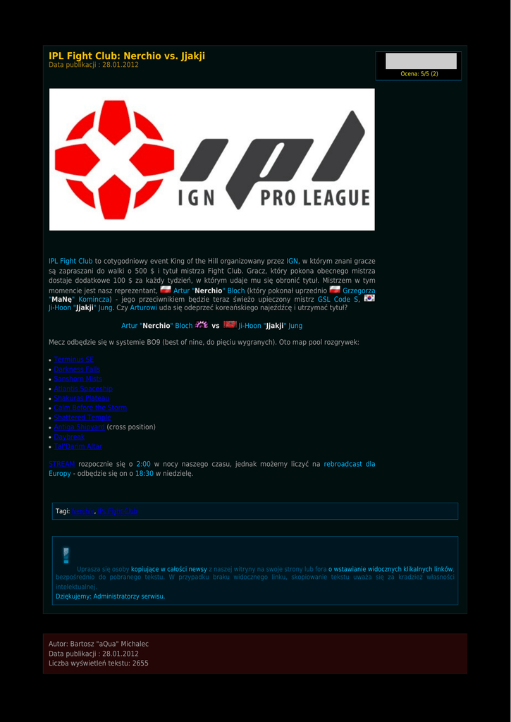 IPL Fight Club: Nerchio vs. Jjakji Data publikacji : 28.01.2012 Ocena: 5/5 (2) IPL Fight Club to cotygodniowy event King of the Hill organizowany przez IGN, w którym znani gracze są zapraszani do walki o 500 $ i tytuł mistrza Fight Club. Gracz, który pokona obecnego mistrza dostaje dodatkowe 100 $ za każdy tydzień, w którym udaje mu się obronić tytuł. Mistrzem w tym momencie jest nasz reprezentant, Artur "Nerchio" Bloch (który pokonał uprzednio Grzegorza "MaNę" Komincza) - jego przeciwnikiem będzie teraz świeżo upieczony mistrz GSL Code S, Ji-Hoon "Jjakji" Jung. Czy Arturowi uda się odeprzeć koreańskiego najeźdźcę i utrzymać tytuł? Artur "Nerchio" Bloch vs Ji-Hoon "Jjakji" Jung Mecz odbędzie się w systemie BO9 (best of nine, do pięciu wygranych). Oto map pool rozgrywek: ● ● ● ● ● ● ● ● ● ● Terminus SE Darkness Falls Sanshorn Mists Atlantis Spaceship Shakuras Plateau Calm Before the Storm Shattered Temple Antiga Shipyard (cross position) Daybreak Tal’Darim Altar STREAM rozpocznie się o 2:00 w nocy naszego czasu, jednak możemy liczyć na rebroadcast dla Europy - odbędzie się on o 18:30 w niedzielę. Tagi: Nerchio, IPL Fight Club Uprasza się osoby kopiujące w całości newsy z naszej witryny na swoje strony lub fora o wstawianie widocznych klikalnych linków, bezpośrednio do pobranego tekstu. W przypadku braku widocznego linku, skopiowanie tekstu uważa się za kradzież własności intelektualnej. Dziękujemy: Administratorzy serwisu. Autor: Bartosz "aQua" Michalec Data publikacji : 28.01.2012 Liczba wyświetleń tekstu: 2655 Komentarz (8) dodaj komentarz Jjakji jest za dobry~Fanek Battlenet Network 2012/01/28 19:14 mam tylko nadzieje ze Nerchio będzie trzymał poziom oby nie miał miazgi jak z MC,~CERVEZ 2012/01/28 20:05 1-0 dla Nercio 2-0 świetny drop play by Nerchio :)~Xizor 2012/01/29 02:48 Nerchio 3:1 i ide spac~Fanek Battlenet Network 2012/01/29 03:24 skończyłem jak było 3-3~Xizor 2012/01/29 11:22 SPOILER kto ciekawy wyniku: http://www.sc2charts.net/en/matches/17109-jjakji-vs-nerchio~Kris7 2012/01/29 12:07 ma ktoś jakiegoś lnka do vod, albo repl?~herezjush 2012/01/30 11:46 Ja też się dołączam do prośby o linki do vodów..~moonrake 2012/01/30 14:52 dodaj komentarz 08.10.2015 Kampania "Szepty o zagładzie" dostępna za darmo (0 komentarzy) 27.09.2015 Kolejni bohaterowie w trybie Sprzymierzonych Dowódców (0 komentarzy) 22.09.2015 Cyfrowe gadżety za udział w BlizzCon 2015 (0 komentarzy) 15.07.2015 Legacy of the Void dostępne w przedsprzedaży! (0 komentarzy) 17.06.2015 Informacje z E3 - prolog kampanii Legacy of the Void (0 komentarzy) 30.05.2015 WCS Europe - sobota (30 maja) 18.00 grupa G - MaNa! (0 komentarzy) 07.05.2015 DreamHack Open France 2015 - już 8 maja - MaNa! (0 komentarzy) 03.05.2015 Na wesoło: postacie E-sportu 50 (0 komentarzy) 03.05.2015 IEM Katowice 2015 - jeszcze raz! (0 komentarzy) 03.05.2015 KeSPA Cup 2015 Season 1 - live! (0 komentarzy) 26.04.2015 Proleague - Top5 gier miesiąca (0 komentarzy) 26.04.2015 CJ Entus wygrywa 2 runde Proleague! (0 komentarzy) 18.04.2015 Wersja beta Legacy of the Void – aktualizacja 2.5.1 (0 komentarzy) 18.04.2015 WCS finals 2015 - galeria (0 komentarzy) 18.04.2015 Omówienie zmian w balansie Legacy of the Void (0 komentarzy) 11.04.2015 WCS Europe kwalifikacje z Polakami - dziś (sobota) 18.00 (0 komentarzy) 11.04.2015 Aktualizacja balansu Heart of the Swarm – 9 kwietnia (0 komentarzy) 11.04.2015 GSL Season1 2015 - galeria (0 komentarzy) 11.04.2015 Zbanowane konta w StarCraft II (0 komentarzy) 04.04.2015 Red Bull Battle Grounds powraca jesienią 2015 (0 komentarzy) (zobacz wszystkie)