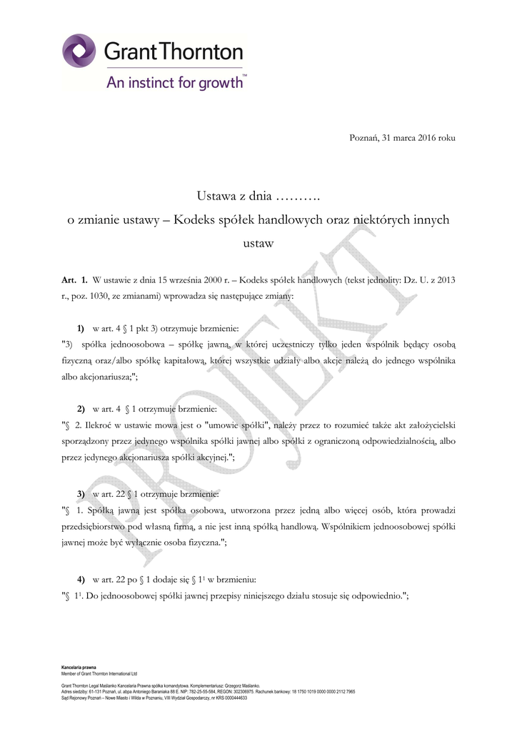Poznań, 31 marca 2016 roku Ustawa z dnia ………. o zmianie ustawy – Kodeks spółek handlowych oraz niektórych innych ustaw Art. 1. W ustawie z dnia 15 września 2000 r. – Kodeks spółek handlowych (tekst jednolity: Dz. U. z 2013 r., poz. 1030, ze zmianami) wprowadza się następujące zmiany: 1) w art. 4 § 1 pkt 3) otrzymuje brzmienie: "3) spółka jednoosobowa – spółkę jawną, w której uczestniczy tylko jeden wspólnik będący osobą fizyczną oraz/albo spółkę kapitałową, której wszystkie udziały albo akcje należą do jednego wspólnika albo akcjonariusza;"; 2) w art. 4 § 1 otrzymuje brzmienie: "§ 2. Ilekroć w ustawie mowa jest o "umowie spółki", należy przez to rozumieć także akt założycielski sporządzony przez jedynego wspólnika spółki jawnej albo spółki z ograniczoną odpowiedzialnością, albo przez jedynego akcjonariusza spółki akcyjnej."; 3) w art. 22 § 1 otrzymuje brzmienie: "§ 1. Spółką jawną jest spółka osobowa, utworzona przez jedną albo więcej osób, która prowadzi przedsiębiorstwo pod własną firmą, a nie jest inną spółką handlową. Wspólnikiem jednoosobowej spółki jawnej może być wyłącznie osoba fizyczna."; 4) w art. 22 po § 1 dodaje się § 11 w brzmieniu: "§ 11. Do jednoosobowej spółki jawnej przepisy niniejszego działu stosuje się odpowiednio."; Kancelaria prawna Member of Grant Thornton International Ltd Grant Thornton Legal Maślanko Kancelaria Prawna spółka komandytowa. Komplementariusz: Grzegorz Maślanko. Adres siedziby: 61-131 Poznań, ul. abpa Antoniego Baraniaka 88 E. NIP: 782-25-55-584, REGON: 302306975. Rachunek bankowy: 18 1750 1019 0000 0000 2112 7965 Sąd Rejonowy Poznań – Nowe Miasto i Wilda w Poznaniu, VIII Wydział Gospodarczy, nr KRS 0000444633 2 5) po art. 41 dodaje się art. 411 w brzmieniu: "Art. 411. Możliwe jest ustanowienie prokurenta, który będzie umocowany do działania na wypadek śmierci wszystkich wspólników.; 6) w art. 61 dodaje się § 4 w brzmieniu: "§ 4. Przepisów § 1-3 nie stosuje się do jednoosobowej spółki jawnej "; 7) w art. 63 dodaje się § 4 w brzmieniu: "§ 4. Przepisów § 1-3 nie stosuje się do jednoosobowej spółki jawnej."; 8) w art. 64 § 1 po zdaniu pierwszym dodaje się zdanie drugie w brzmieniu: "W przypadku, gdy w wyniku śmierci lub ogłoszenia upadłości wspólnika oraz wypowiedzenia umowy spółki przez wspólnika lub jego wierzyciela w spółce miałby pozostać jeden wspólnik, będący osoba fizyczną, może on złożyć do sądu rejestrowego pisemne oświadczenie o dalszym trwaniu spółki jako jednoosobowej spółki jawnej." 9) w art. 64 § 2 zd. 1 po słowie "Uzgodnienie" dodaje się słowa: "bądź – odpowiednio – oświadczenie". 10) w art. 64 dodaje się § 3 w brzmieniu: "§ 3. W przypadku śmierci jedynego wspólnika spółki spółka trwa nadal z udziałem spadkobierców zmarłego wspólnika, którzy przyjęli po nim spadek. Przepis art. 60 § 1 zdanie pierwsze stosuje się odpowiednio."; 11) w art. 551 § 1 otrzymuje brzmienie: "§ 5. Przedsiębiorca będący osobą fizyczną wykonującą we własnym imieniu działalność gospodarczą w rozumieniu ustawy z dnia 2 lipca 2004 r. o swobodzie działalności gospodarczej (Dz. U. z 2013 r. poz. 672, 675 i 983) - (przedsiębiorca przekształcany) może przekształcić formę prowadzonej działalności w spółkę jednoosobową (spółkę przekształconą)."; 12) w art. 557 § 3 otrzymuje brzmienie: "§ 3. W jednoosobowej spółce kapitałowej plan przekształcenia sporządza się w formie aktu notarialnego."; 13) w tytule IV w dziale III tytuł rozdziału 6 otrzymuje brzmienie: "Przekształcenie przedsiębiorcy w spółkę jednoosobową"; Member of Grant Thornton International Ltd 3 14) w art. 5841 § 2 otrzymuje brzmienie: "§ 2. Sąd rejestrowy przesyła właściwemu organowi ewidencyjnemu odpis postanowienia o wpisie do rejestru przedsiębiorców jednoosobowej spółki kapitałowej albo jednoosobowej spółki jawnej powstałej wskutek przekształcenia niezwłocznie po jego wydaniu."; 15) w art. 5845 dotychczasowa treść otrzymuje oznaczenie jako § 1, po czym dodaje się § 2 w brzmieniu: "§ 2. Do przekształcenia przedsiębiorcy w jednoosobową spółkę jawną wymaga się: 1) złożenia oświadczenia o przekształceniu przedsiębiorcy; 2) sporządzenia aktu założycielskiego spółki przekształconej; 3) dokonania w rejestrze wpisu spółki przekształconej i wykreślenia przedsiębiorcy przekształcanego z Centralnej Ewidencji i Informacji o Działalności Gospodarczej."; 16) w art. 5846 po słowach: "Plan przekształcenia przedsiębiorcy" dodaje się słowa: "w jednoosobową spółkę kapitałową"; 17) w art. 5847 § 1 po słowach: "Plan przekształcenia przedsiębiorcy" dodaje się słowa: "przekształcanego w jednoosobową spółkę kapitałową"; 18) w art. 5849 jego dotychczasowa treść otrzymuje oznaczenie jako § 1, przy czym po słowach: "Oświadczenie o przekształceniu przedsiębiorcy" dodaje się słowa: "w jednoosobową spółkę kapitałową"; nadto dodaje się § 2 w brzmieniu: "§ 2. Oświadczenie o przekształceniu przedsiębiorcy w jednoosobową spółkę jawną powinno zostać sporządzone w formie pisemnej chyba, że przeniesienie własności składników przedsiębiorstwa wymaga dla swej skuteczności innej formy; w takim wypadku stosuje się formę oświadczenia właściwą dla tej czynności."; 19) w art. 58411 po słowach: "Wniosek o wpis przekształcenia do rejestru wnoszą wszyscy członkowie zarządu spółki przekształconej" dodaje się słowa: "w przypadku przekształcenia przedsiębiorcy w jednoosobową spółkę kapitałową albo przedsiębiorca przekształcany w przypadku przekształcenia w jednoosobową spółkę jawną."; 20) art. 58412 otrzymuje brzmienie: "Ogłoszenie o przekształceniu przedsiębiorcy jest dokonywane na wniosek zarządu spółki przekształconej spółki kapitałowej albo wspólnika jednoosobowej spół