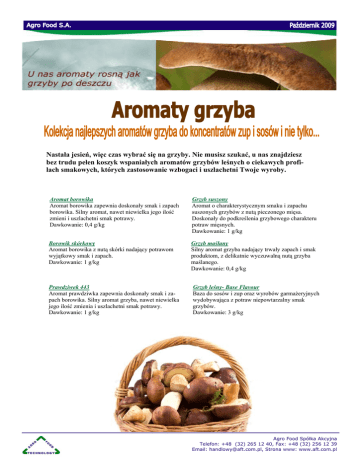 Nastała jesień, więc czas wybrać się na grzyby. Nie musisz szukać, u nas znajdziesz bez trudu pełen koszyk wspaniałych aromatów grzybów leśnych o ciekawych profilach smakowych, których zastosowanie wzbogaci i uszlachetni Twoje wyroby. Aromat borowika Aromat borowika zapewnia doskonały smak i zapach borowika. Silny aromat, nawet niewielka jego ilość zmieni i uszlachetni smak potrawy. Dawkowanie: 0,4 g/kg Grzyb suszony Aromat o charakterystycznym smaku i zapachu suszonych grzybów z nutą pieczonego mięsa. Doskonały do podkreślenia grzybowego charakteru potraw mięsnych. Dawkowanie: 1 g/kg Borowik skórkowy Aromat borowika z nutą skórki nadający potrawom wyjątkowy smak i zapach. Dawkowanie: 1 g/kg Grzyb maślany Silny aromat grzyba nadający trwały zapach i smak produktom, z delikatnie wyczuwalną nutą grzyba maślanego. Dawkowanie: 0,4 g/kg Prawdziwek 443 Aromat prawdziwka zapewnia doskonały smak i zapach borowika. Silny aromat grzyba, nawet niewielka jego ilość zmienia i uszlachetni smak potrawy. Dawkowanie: 1 g/kg Grzyb leśny- Base Flavour Baza do sosów i zup oraz wyrobów garmażeryjnych wydobywająca z potraw niepowtarzalny smak grzybów. Dawkowanie: 3 g/kg Agro Food Spółka Akcyjna Telefon: +48 (32) 265 12 40, Fax: +48 (32) 256 12 39 Email: [email protected], Strona www: www.aft.com.pl