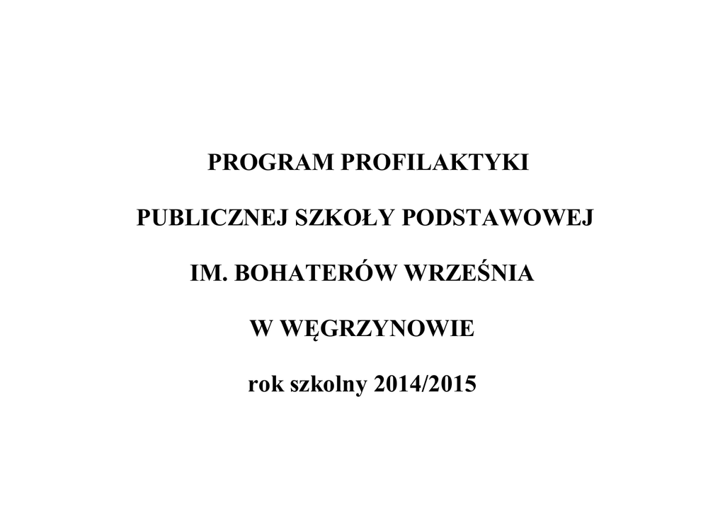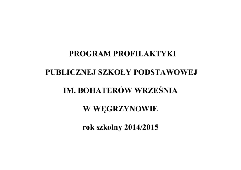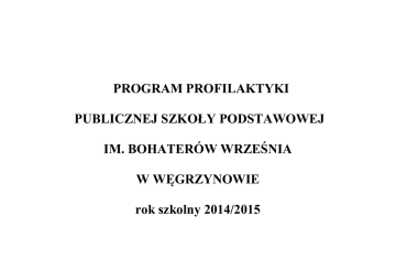 PROGRAM PROFILAKTYKI PUBLICZNEJ SZKOŁY PODSTAWOWEJ IM. BOHATERÓW WRZEŚNIA W WĘGRZYNOWIE rok szkolny 2014/2015 Program Profilaktyczny Publicznej Szkoły Podstawowej im Bohaterów Września w Węgrzynowie został opracowany w oparciu rozpoznanie potrzeb i Program Wychowawczy Szkoły. Celem jest wspomaganie wszechstronnego i harmonijnego rozwoju ucznia. Formy i sposoby działań zakresu profilaktyki dostosowane są do wieku uczniów. Program ten kierowany jest do każdego ucznia, zarówno zdolnego jak i ze specyficznymi oraz specjalnymi potrzebami edukacyjnymi, potrzebującego pomocy psychologiczno-pedagogicznej oraz materialnej. Program odpowiada na realne problemy i zagrożenia pojawiające się w szkole, klasie szkolnej i środowisku. Zakładamy, że dzięki naszemu zaangażowaniu każdy z uczniów poradzi sobie w trudnej sytuacji i osiągnie sukces na zgodnie ze swoimi możliwościami. Założenia szkolnego programu profilaktyki Aktywizacja i integracja uczniów przy realizacji wspólnych zamierzeń. Rozwój aktywności uczniów poprzez udział w planowaniu, organizowaniu i przygotowaniu wydarzeń ż życia szkoły tj. imprez klasowych, szkolnych, wycieczek, wyjść itp. Podejmowanie działań na rzecz środowiska szkolnego poprzez udział w pracach zainicjowanych przez samorząd uczniowski, współorganizowanie imprez ogólnoszkolnych i charytatywnych. Uwrażliwienie na dostrzeganie potrzeb innych dzieci i dorosłych. Współdziałanie z rodzicami przy realizacji zadań wychowawczych. Promocja szkoły poprzez udział w konkursach, prezentowanie dorobku na forum szkoły i w środowisku lokalnym. Stworzenie warunków do rozwoju indywidualnych zainteresowań i uzdolnień uczniów. Dalsze diagnozowanie potrzeb uczniów i wspieranie ich indywidualnych dążeń i aspiracji. Dalsze monitorowanie zachowania i przeciwdziałanie przejawom niepożądanych zachowań. Wspieranie rozwoju społecznego dzieci 6- letnich w grupie zerowej i klasie I. Przygotowanie uczniów do przejścia na następny etap rozwoju ( II etap edukacji, gimnazjum). Cele szczegółowe programu Zwiększenie bezpieczeństwa uczniów na terenie szkoły i poza nią - Tworzenie warunków do kształtowania zachowań sprzyjających zdrowiu i bezpieczeństwu dzieci na drodze i w szkole. - Zapoznanie uczniów z dokumentacją szkolną oraz szczegółowymi kryteriami ocen zachowania. - Bezpieczeństwo uczniów podczas przerw i imprez szkolnych. - Uwrażliwienie uczniów na zagrożenia podczas drogi do i ze szkoły. - Systematyczne uwrażliwianie uczniów na sytuacje stwarzające zagrożenie. - Uczenie zasad postępowania w sytuacjach zagrożenia: pożar, zachowanie na szkolnym korytarzu, szatni, klasie szkolnej, sali gimnastycznej, boisku szkolnym, placu zabaw. - Uwzględnienie profilaktyki uzależnień: problem narkotyków, dopalaczy, palenie papierosów, picie alkoholu, zachowania agresywne. Ograniczenie zachowań agresywnych i przemocy w szkole - Diagnoza poziomu bezpieczeństwa w szkole. - Uświadamianie uczniom, czym jest agresja i przemoc oraz jak sobie z nimi radzić. - Wdrażanie działań na rzecz ograniczania agresji i przemocy, kształtowanie umiejętności asertywnych. - Kształtowanie umiejętności zastępowania agresji, wnioskowania moralnego oraz kontroli emocji. - Kształtowanie postaw troski o bezpieczeństwo własne i innych. -Wzbudzanie empatii, tolerancji, zachowań prospołecznych i antydyskryminacyjnych. - Pedagogizacja rodziców. Rozwijanie umiejętności współżycia społecznego - Przedstawienie zasad i reguł współżycia w klasie i szkole. - Prawa i obowiązki ucznia. - Uwrażliwianie uczniów na potrzeby innych. -Uwrażliwienie uczniów na akceptację odmienności. - Integrowanie społeczności klasowej i szkolnej. Rozszerzenie działań na rzecz propagowania zdrowego trybu życia - Propagowanie zdrowego trybu życia. - Popularyzacja aktywnych sposobów spędzania wolnego czasu. - Kształtowanie nawyków dbania o zdrowie i higienę osobistą. - Poszerzanie zainteresowań i wiedzy ucznia Profilaktyka uzależnień - Asertywność. - Profilaktyka palenia papierosów. - Profilaktyka picia alkoholu. - Profilaktyka narkomanii, lekomanii, uzależnienia od komputera. - Rozpoznawanie sytuacji domowej wychowanków. Podejmowanie działań mających na celu wzmocnienie motywacji do własnego rozwoju - Uświadomienie uczniowi jego mocnych stron i możliwości. - Rozwijanie indywidualnych zainteresowań uczniów. - Wskazywanie pożądanych wzorców zachowań. - Zapobieganie nadmiernej absencji uczniów - Pomoc uczniom w przezwyciężaniu własnych trudności i ograniczeń. - Pomoc uczniom w organizowaniu i planowaniu swojej pracy. - Rozwijanie umiejętności rozpoznawania i ujawniania swoich uczuć i emocji. Wdrażanie metod radzenia sobie w trudnych sytuacjach - Poszerzenie wiedzy dotyczącej sytuacji trudnych. - Wdrażanie metod asertywnych. - Pomoc uczniom w radzeniu sobie ze stresem. - Pomoc uczniom w radzeniu sobie z własnymi ograniczeniami. - Umiejętne szukanie pomocy. Zadania profilaktyczne nauczycieli szkoły podstawowej. zwracanie- podczas dyżurów szczególnej uwagi na miejsca tzw. podwyższonego ryzyka: toalety, schody przed szkołą, szatnie itp., informowanie na bieżąco wychowawców o niewłaściwym zachowaniu ich wychowanków zarówno przez nauczycieli dyżurujących jak pozostałych nauczycieli i pracowników szkoły, obserwacja zachowania uczniów w miejscach publicznych i zwracanie uwagi na ich niewłaściwe zachowania. wdrażanie do świadomego unikania zagrożeń oraz kształtowanie umiejętności odmawiania i negocjacji, dawanie przykładów odpowiedzialności, sumienności, umiejętności rozwiązywania konfliktów, radzenia sobie w trudnych sytuacjach. Zadania profilaktyczne wychowawców klasowych. pomoc uczniom w rozwiązywaniu trudności życiowych i rodzinnych, uruchomienie akcji informacyjnej mającej na celu uświadomienie uczniom możliwości zwrócenia się z problemem do konkretnej