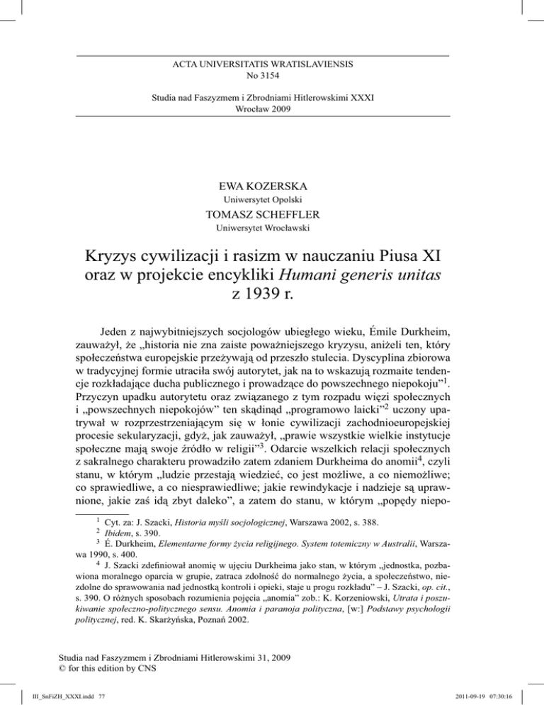 ACTA UNIVERSITATIS WRATISLAVIENSIS No 3154 Studia nad Faszyzmem i Zbrodniami Hitlerowskimi XXXI Wrocław 2009 EWA KOZERSKA Uniwersytet Opolski TOMASZ SCHEFFLER Uniwersytet Wrocławski Kryzys cywilizacji i rasizm w nauczaniu Piusa XI oraz w projekcie encykliki Humani generis unitas z 1939 r. Jeden z najwybitniejszych socjologów ubiegłego wieku, Émile Durkheim, zauważył, że „historia nie zna zaiste poważniejszego kryzysu, aniżeli ten, który społeczeństwa europejskie przeżywają od przeszło stulecia. Dyscyplina zbiorowa w tradycyjnej formie utraciła swój autorytet, jak na to wskazują rozmaite tendencje rozkładające ducha publicznego i prowadzące do powszechnego niepokoju”1. Przyczyn upadku autorytetu oraz związanego z tym rozpadu więzi społecznych i „powszechnych niepokojów” ten skądinąd „programowo laicki”2 uczony upatrywał w rozprzestrzeniającym się w łonie cywilizacji zachodnioeuropejskiej procesie sekularyzacji, gdyż, jak zauważył, „prawie wszystkie wielkie instytucje społeczne mają swoje źródło w religii”3. Odarcie wszelkich relacji społecznych z sakralnego charakteru prowadziło zatem zdaniem Durkheima do anomii4, czyli stanu, w którym „ludzie przestają wiedzieć, co jest możliwe, a co niemożliwe; co sprawiedliwe, a co niesprawiedliwe; jakie rewindykacje i nadzieje są uprawnione, jakie zaś idą zbyt daleko”, a zatem do stanu, w którym „popędy niepo1 Cyt. za: J. Szacki, Historia myśli socjologicznej, Warszawa 2002, s. 388. Ibidem, s. 390. 3 É. Durkheim, Elementarne formy życia religijnego. System totemiczny w Australii, Warszawa 1990, s. 400. 4 J. Szacki zdefiniował anomię w ujęciu Durkheima jako stan, w którym „jednostka, pozbawiona moralnego oparcia w grupie, zatraca zdolność do normalnego życia, a społeczeństwo, niezdolne do sprawowania nad jednostką kontroli i opieki, staje u progu rozkładu” – J. Szacki, op. cit., s. 390. O różnych sposobach rozumienia pojęcia „anomia” zob.: K. Korzeniowski, Utrata i poszukiwanie społeczno-politycznego sensu. Anomia i paranoja polityczna, [w:] Podstawy psychologii politycznej, red. K. Skarżyńska, Poznań 2002. 2 Studia nad Faszyzmem i Zbrodniami Hitlerowskimi 31, 2009 © for this edition by CNS III_SnFiZH_XXXI.indd 77 2011-09-19 07:30:16 78 Ewa Kozerska, Tomasz Scheffler wściągane już przez zdezorientowaną opinię, nie znają granic, przed którymi powinny się zatrzymać”5. To pewne, że Durkheim nie był osamotniony w krytycznym osądzie tendencji rozwojowych dotyczących społeczeństw Zachodu6. Zbieżną w tym punkcie z Durkheimowską analizę kryzysu cywilizacji przedstawiali w ubiegłym stuleciu znamienici reprezentanci chrześcijańskiej refleksji społecznej i filozoficznej7. Ich pogląd na przyczyny degeneracji cywilizacji europejskiej oscylował także wokół zagadnienia deprecjacji przeżycia religijnego. To, co stanowiło o zasadniczej odmienności chrześcijańskich analiz kryzysu cywilizacji od przemyśleń francuskiego socjologa, sprowadzało się do kwestii sporu o naturę religii8. W gronie osób poddających osądowi dokonujące się w XIX i XX wieku przemiany społeczne z punktu widzenia chrześcijaństwa szczególne miejsce przypadło papieżowi Piusowi XI. W trakcie jego pontyfikatu (1922–1939) Europa i świat targane były różnorodnymi zaburzeniami o politycznym, militarnym, 5 É. Durkheim, Typy samobójstw, [w:] J. Szacki, Durkheim, Warszawa 1964, s. 187. Wskazywanie na konieczny związek między trwałością społeczeństwa i istnieniem w jego łonie sfery sacrum oraz podkreślanie wagi religii dla rozwoju i pomyślności życia społecznego i kulturowego stanowiło konstytutywny element konserwatyzmu. Twierdzenia takie odnajdziemy zarówno u wczesnych konserwatystów, jak E. Burke czy J. de Maistre, jak i u współczesnych przedstawicieli tego nurtu doktrynalnego (np. J. Murray, M. Novak, R. Neuhaus, J.R.R. Tolkien). Paradygmatyczną egzemplifikację owego poglądu stanowi słynna i wielekroć cytowana wypowiedź noblisty, poety i dramaturga o konserwatywnej proweniencji, Thomasa Sterna Eliota, że „polityka jest funkcją kultury, a sercem kultury jest religia”. Zob. B. Szlachta, Konserwatyzm, [w:] Doktryny polityczne XIX i XX wieku, red. K. Chojnicka i W. Kozub-Ciembroniewicz, Kraków 2000, s. 127 i n.; A. Quinton, The Politics of Imperfection. The Religious and Secular Traditions of Conservative Thought in England from Hooker to Oakeshott, London–Boston 1978. Szczególne miejsce Durkheima w tym kontekście brało się jednak stąd, że jego aprobatywne ujęcie znaczenia religii dla procesów społecznych wynikało z uprzednich badań empirycznych, a zatem mieściło się w paradygmacie pozytywistycznym, podczas gdy wypowiedziom myślicieli konserwatywnych najczęściej odmawiano waloru naukowości. 7 Na szczególną uwagę zasługuje w tym miejscu grupa rosyjskich filozofów i teologów (np. P. Struwe, S. Frank, P. Florenski, S. Bułgakow oraz M. Bierdiajew), zmuszonych po bolszewickim puczu z listopada 1917 r. do emigracji. Ich prace, od lat znajdujące się w intelektualnym i naukowym obiegu, ale z uwagi na uwarunkowania okresu komunizmu mało znane w Polsce, jeszcze w okresie międzywojennym wpłynęły istotnie na dyskusję o naturze i przyczynach narastającego procesu alienacji jednostki we współczesnym świecie oraz o związanym z tym pojawieniu się systemów totalitarnych. 8 Spór ten związany jest z zasadniczą różnicą w podejściu do zjawiska religii. Durkheim, a z nim cała plejada znamienitych przedstawicieli socjologii i antropologii kulturowej, począwszy od J.G. Frazera, poprzez B. Malinowskiego, A.R. Radcliffe-Browna czy L. Levy-Bruhla aż po współczesnych, np. E. Leacha i C. Lévi-Straussa, traktowali religię jako jeden z wielu przejawów funkcjonowania społeczeństwa, które można i należy ujmować wyłącznie w kategoriach opisowych zgodnych z tzw. metodologią naukową. Natom