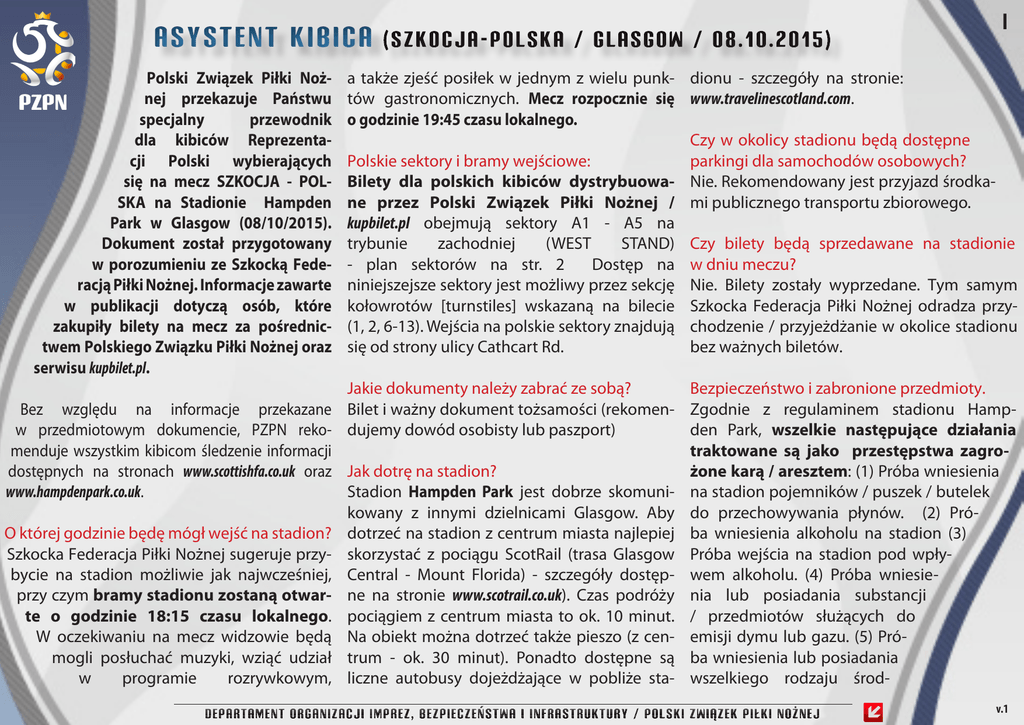 ASYSTENT KIBICA Polski Związek Piłki Nożnej przekazuje Państwu specjalny przewodnik dla kibiców Reprezentacji Polski wybierających się na mecz SZKOCJA - POLSKA na Stadionie Hampden Park w Glasgow (08/10/2015). Dokument został przygotowany w porozumieniu ze Szkocką Federacją Piłki Nożnej. Informacje zawarte w publikacji dotyczą osób, które zakupiły bilety na mecz za pośrednictwem Polskiego Związku Piłki Nożnej oraz serwisu kupbilet.pl. I a także zjeść posiłek w jednym z wielu punk- dionu - szczegóły na stronie: tów gastronomicznych. Mecz rozpocznie się www.travelinescotland.com. o godzinie 19:45 czasu lokalnego. Czy w okolicy stadionu będą dostępne Polskie sektory i bramy wejściowe: parkingi dla samochodów osobowych? Bilety dla polskich kibiców dystrybuowa- Nie. Rekomendowany jest przyjazd środkane przez Polski Związek Piłki Nożnej / mi publicznego transportu zbiorowego. kupbilet.pl obejmują sektory A1 - A5 na trybunie zachodniej (WEST STAND) Czy bilety będą sprzedawane na stadionie - plan sektorów na str. 2 Dostęp na w dniu meczu? niniejszejsze sektory jest możliwy przez sekcję Nie. Bilety zostały wyprzedane. Tym samym kołowrotów [turnstiles] wskazaną na bilecie Szkocka Federacja Piłki Nożnej odradza przy(1, 2, 6-13). Wejścia na polskie sektory znajdują chodzenie / przyjeżdżanie w okolice stadionu się od strony ulicy Cathcart Rd. bez ważnych biletów. Jakie dokumenty należy zabrać ze sobą? Bezpieczeństwo i zabronione przedmioty. Bez względu na informacje przekazane Bilet i ważny dokument tożsamości (rekomen- Zgodnie z regulaminem stadionu Hampw przedmiotowym dokumencie, PZPN reko- dujemy dowód osobisty lub paszport) den Park, wszelkie następujące działania menduje wszystkim kibicom śledzenie informacji traktowane są jako przestępstwa zagrodostępnych na stronach www.scottishfa.co.uk oraz Jak dotrę na stadion? żone karą / aresztem: (1) Próba wniesienia www.hampdenpark.co.uk. Stadion Hampden Park jest dobrze skomuni- na stadion pojemników / puszek / butelek kowany z innymi dzielnicami Glasgow. Aby do przechowywania płynów. (2) PróO której godzinie będę mógł wejść na stadion? dotrzeć na stadion z centrum miasta najlepiej ba wniesienia alkoholu na stadion (3) Szkocka Federacja Piłki Nożnej sugeruje przy- skorzystać z pociągu ScotRail (trasa Glasgow Próba wejścia na stadion pod wpłybycie na stadion możliwie jak najwcześniej, Central - Mount Florida) - szczegóły dostęp- wem alkoholu. (4) Próba wniesieprzy czym bramy stadionu zostaną otwar- ne na stronie www.scotrail.co.uk). Czas podróży nia lub posiadania substancji te o godzinie 18:15 czasu lokalnego. pociągiem z centrum miasta to ok. 10 minut. / przedmiotów służących do W oczekiwaniu na mecz widzowie będą Na obiekt można dotrzeć także pieszo (z cen- emisji dymu lub gazu. (5) Prómogli posłuchać muzyki, wziąć udział trum - ok. 30 minut). Ponadto dostępne są ba wniesienia lub posiadania w programie rozrywkowym, liczne autobusy dojeżdżające w pobliże sta- wszelkiego rodzaju środv.1 ze sobą jakiekolwiek zbędne przedmioty (poza np. portfelem / telefonem / szalikiem). W szczególności nie należy zabierać ze sobą na mecz toreb / walizek / plecaków itp. II Dane kontaktowe Konsulatu Generalnego RP w Edynburgu: 2 Kinnear Road EH3 5PE Edinburgh Tel.: (0044) 0131 5520301 SOMERVILLE DRIVE TO MOUNT FLORIDA RAIL EXIT 15 EXIT 17 EXIT 22 PURPLE CAR PARK E NORTH STAND LESSER HAMPDEN WEST STAND EAST STAND AIKENHEAD ROAD CATHCART ROAD SOUTH STAND DISABLED ENTRANCE EXIT 46 (WEST ROADWAY) EXIT 33 MAIN ENTRANCE (EAST ROADWAY) NO UN RM CA CK AD RO ków pirotechnicznych. Wnoszenie własnych napojów jest zabronione. Dla kibiców będą dostępne liczne punkty gastronomiczne (płatność wyłącznie gotówką). Organizator przypomina, że w trakcie meczu należy zająć miejsca siedzące. Stanie na trybunach jest bowiem zabronione. Należy pamiętać, że przechodząc przez strefę kontroli i następnie wychodząc poza stadion - dana osoba nie będzie uprawniona do powrotu na teren imprezy. Prosimy mieć na uwadze, że w celu uzyskania dostępu na stadion, każdy widz, niezależnie od wieku, musi okazać ważny bilet. Personel pilnujący wejść może skontrolować kibiców wchodzących na obiekt. Na stadion można wnosić aparaty fotograficzne / kamery na potrzeby użytku własnego (w tym amatorskie lustrzanki). Wnoszenie profesjonalnego sprzętu fotograficznego jest niemożliwe. Organizator meczu przypomina, że palenie papierosów na stadionie Hampden Park jest zabronione. Przepisy stadionowe właściwe dla meczów w Szkocji można znaleźć m.in. na stronie http://goo.gl/r2KxVI. LETHERBY DRIVE MOUNT ANNAN DRIVE Czy mogę zabrać ze sobą plecak lub inny bagaż? Organizator odradza zabierać KINGHORN DRIVE v.1