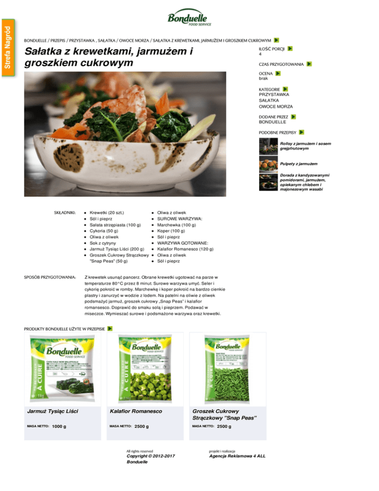 BONDUELLE / PRZEPIS / PRZYSTAWKA , SAŁATKA / OWOCE MORZA / SAŁATKA Z KREWETKAMI, JARMUŻEM I GROSZKIEM CUKROWYM Sałatka z krewetkami, jarmużem i groszkiem cukrowym ILOŚĆ PORCJI 4 CZAS PRZYGOTOWANIA OCENA brak KATEGORIE PRZYSTAWKA SAŁATKA OWOCE MORZA DODANE PRZEZ BONDUELLE PODOBNE PRZEPISY Rollsy z jarmużem i sosem grejpfrutowym Pulpety z jarmużem Dorada z kandyzowanymi pomidorami, jarmużem, opiekanym chlebem i majonezowym wasabi SKŁADNIKI: SPOSÓB PRZYGOTOWANIA: Krewetki (20 szt.) Sól i pieprz Oliwa z oliwek SUROWE WARZYWA: Sałata strzępiasta (100 g) Cykoria (50 g) Oliwa z oliwek Marchewka (100 g) Koper (100 g) Sól i pieprz Sok z cytryny Jarmuż Tysiąc Liści (200 g) Groszek Cukrowy Strączkowy WARZYWA GOTOWANE: Kalafior Romanesco (120 g) Oliwa z oliwek "Snap Peas" (50 g) Sól i pieprz Z krewetek usunąć pancerz. Obrane krewetki ugotować na parze w temperaturze 80°C przez 8 minut. Surowe warzywa umyć. Seler i cykorię pokroić w romby. Marchewkę i koper pokroić na bardzo cienkie plastry i zanurzyć w wodzie z lodem. Na patelni na oliwie z oliwek podsmażyć jarmuż, groszek cukrowy „Snap Peas” i kalafior romansesco. Doprawić do smaku solą i pieprzem. Podawać w miseczce. Wymieszać surowe i podsmażone warzywa oraz krewetki. PRODUKTY BONDUELLE UŻYTE W PRZEPISIE Jarmuż Tysiąc Liści MASA NETTO: 1000 g Kalafior Romanesco MASA NETTO: 2500 g Groszek Cukrowy Strączkowy "Snap Peas" MASA NETTO: 2500 g All rights reserved projekt i realizacja Copyright © 2012-2017 Bonduelle Agencja Reklamowa 4 ALL