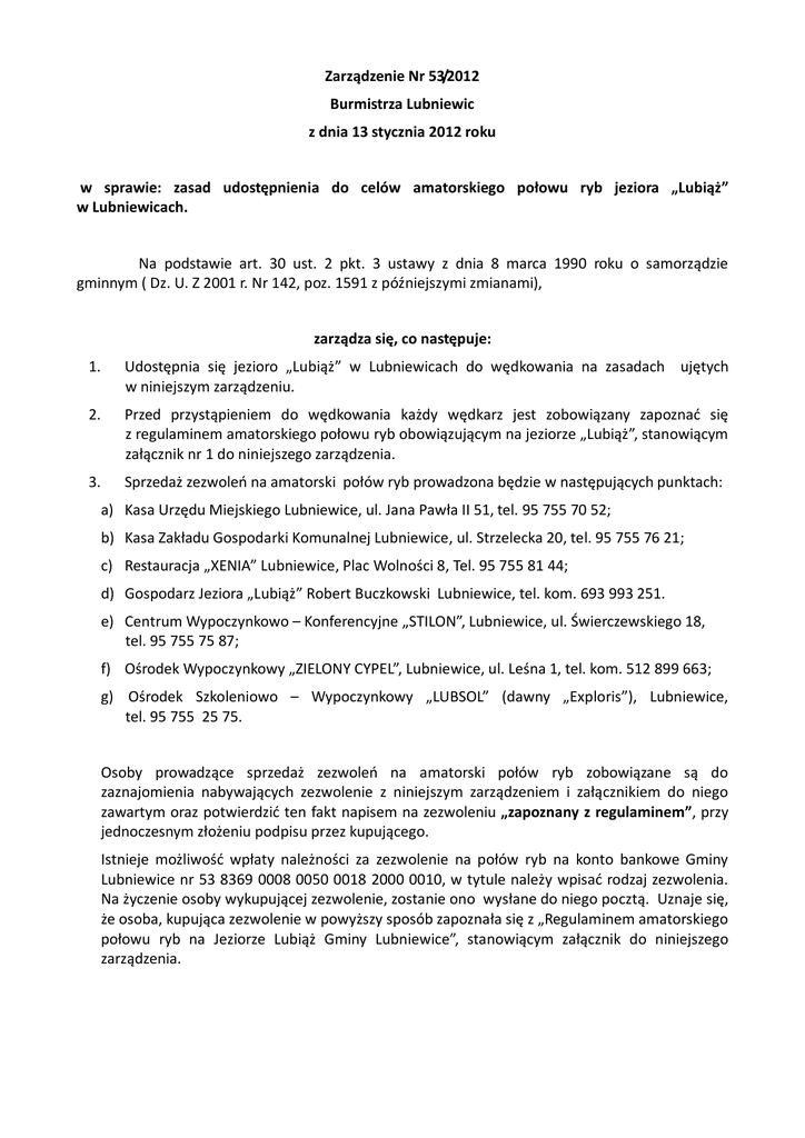 Zarządzenie Nr 53/2012 Burmistrza Lubniewic z dnia 13 stycznia 2012 roku w sprawie: zasad udostępnienia do celów amatorskiego połowu ryb jeziora „Lubiąż” w Lubniewicach. Na podstawie art. 30 ust. 2 pkt. 3 ustawy z dnia 8 marca 1990 roku o samorządzie gminnym ( Dz. U. Z 2001 r. Nr 142, poz. 1591 z późniejszymi zmianami), zarządza się, co następuje: 1. Udostępnia się jezioro „Lubiąż” w Lubniewicach do wędkowania na zasadach ujętych w niniejszym zarządzeniu. 2. Przed przystąpieniem do wędkowania każdy wędkarz jest zobowiązany zapoznać się z regulaminem amatorskiego połowu ryb obowiązującym na jeziorze „Lubiąż”, stanowiącym załącznik nr 1 do niniejszego zarządzenia. 3. Sprzedaż zezwoleń na amatorski połów ryb prowadzona będzie w następujących punktach: a) Kasa Urzędu Miejskiego Lubniewice, ul. Jana Pawła II 51, tel. 95 755 70 52; b) Kasa Zakładu Gospodarki Komunalnej Lubniewice, ul. Strzelecka 20, tel. 95 755 76 21; c) Restauracja „XENIA” Lubniewice, Plac Wolności 8, Tel. 95 755 81 44; d) Gospodarz Jeziora „Lubiąż” Robert Buczkowski Lubniewice, tel. kom. 693 993 251. e) Centrum Wypoczynkowo – Konferencyjne „STILON”, Lubniewice, ul. Świerczewskiego 18, tel. 95 755 75 87; f) Ośrodek Wypoczynkowy „ZIELONY CYPEL”, Lubniewice, ul. Leśna 1, tel. kom. 512 899 663; g) Ośrodek Szkoleniowo – Wypoczynkowy „LUBSOL” (dawny „Exploris”), Lubniewice, tel. 95 755 25 75. Osoby prowadzące sprzedaż zezwoleń na amatorski połów ryb zobowiązane są do zaznajomienia nabywających zezwolenie z niniejszym zarządzeniem i załącznikiem do niego zawartym oraz potwierdzić ten fakt napisem na zezwoleniu „zapoznany z regulaminem”, przy jednoczesnym złożeniu podpisu przez kupującego. Istnieje możliwość wpłaty należności za zezwolenie na połów ryb na konto bankowe Gminy Lubniewice nr 53 8369 0008 0050 0018 2000 0010, w tytule należy wpisać rodzaj zezwolenia. Na życzenie osoby wykupującej zezwolenie, zostanie ono wysłane do niego pocztą. Uznaje się, że osoba, kupująca zezwolenie w powyższy sposób zapoznała się z „Regulaminem amatorskiego połowu ryb na Jeziorze Lubiąż Gminy Lubniewice”, stanowiącym załącznik do niniejszego zarządzenia. 4. Na jeziorze „ Lubiąż” dzierżawionym od RZGW Poznań, obowiązują następujące opłaty za amatorski połów ryb: Osoby spoza Gminy Lubniewice: Mieszkańcy Gminy Lubniewice: a) cały rok: z brzegu - 90,00 zł 70 zł łodzi - 170,00 zł 130 zł z brzegu - 65,00 zł 50 zł z łodzi - 90,00 zł 70 zł z brzegu - 50,00 zł 40 zł z łodzi - 65,00 zł 55 zł z brzegu - 40,00 zł 30 zł z łodzi - 50,00 zł 40 zł z brzegu - 25,00 zł 20 zł z łodzi - 35,00 zł 30 zł b) 1 miesiąc: c) 2 tygodnie: d) 1 tydzień: e) 1 dzień: 5. Mieszkańcem Gminy w rozumieniu zapisów niniejszego zarządzenia jest osoba posiadająca na terenie Gminy Lubniewice zameldowanie na pobyt stały lub czasowy trwający ponad 3 miesiące. Połów pod lodem mieści się w opłacie zasadniczej. 6. Wniesienie opłaty za połów z łodzi za dany okres połowu upoważnia do wędkowania w nocy z brzegu w tym czasie bez dodatkowej opłaty. 7. Podczas amatorskiego połowu ryb, zezwala się na korzystanie z silników spalinowych o mocy do 5 koni mechanicznych przez całą dobę. 8. Zezwolenie na wędkowanie ważne jest z kartą wędkarską. 9. Z opłaty zwolnieni są mieszkańcy Gminy Lubniewice, którzy ukończyli 65 lat oraz mieszkańcy Gminy Lubniewice posiadający orzeczenie lekarskie o I gr. inwalidzkiej. 10. Zezwoleniem na wędkowanie jest dowód wpłaty zgodny z obowiązującym cennikiem opłat. 11. Młodzież ucząca się korzysta z 50 % zniżki. 12. Członkowie PZW zrzeszeni w Okręgu Gorzów Wlkp. z roczną składką na dany rok bieżący łowią w ramach porozumienia stron. 13. Osoby szczególnie zaangażowane w pracach na rzecz Miasta i Gminy Lubniewice i związane z gospodarką na jeziorze mogą otrzymać darmowe zezwolenie uprawniające ich do amatorskiego połowu ryb. Zezwolenia takie wydaje Burmistrz Lubniewic. 14. Osoby łowiące powinny posiadać przy sobie dowód tożsamości w celu jej potwierdzenia. 15. Połów z jednostek pływających dozwolony jest przez cały rok kalendarzowy. 16. Do kontroli na jeziorze „Lubiąż” upoważnieni są: a) Policja; b) Państwowa Straż Rybacka; c) Społeczna Straż Rybacka; d) Gospodarz jeziora „Lubiąż”. 17. Naruszenie zasad amatorskiego połowu ryb określonych w niniejszym zarządzeniu oraz regulaminie jeziora „Lubiąż” pociąga za sobą konsekwencje określone w ustawie o rybactwie śródlądowym lub zatrzymanie zezwolenia bez możliwości odszkodowania. 18. Wykonanie zarządzenia powierza się p. o. Kierownikowi Referatu Zamówień Publicznych, Inwestycji i Budownictwa Urzędu Miejskiego Lubniewice. 19. Tracą moc Zarządzenia Burmistrza Lubniewic Nr 14/2011 z dnia 05.04.2011 r., Nr 19/2011 z dn.10.06.2011 r., Nr 41/2011 z dnia 31.10.2011 r., Nr 43/2011 z dnia 10.11.2011 r. 20. Zarządzenie wchodzi w życie z dniem 16 stycznia 2012 roku.
