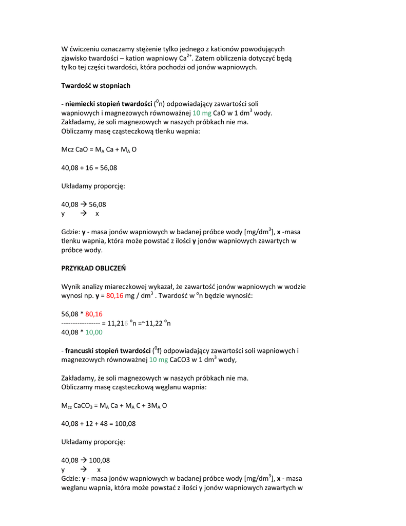 zjawisko twardości – kation wapniowy Ca2+. Zatem obliczenia dotyczyć będą