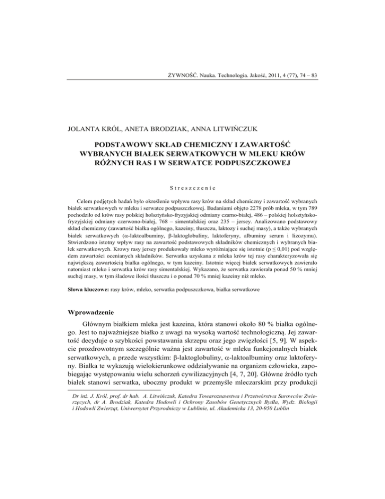 ŻYWNOŚĆ. Nauka. Technologia. Jakość, 2011, 4 (77), 74 – 83 JOLANTA KRÓL, ANETA BRODZIAK, ANNA LITWIŃCZUK PODSTAWOWY SKŁAD CHEMICZNY I ZAWARTOŚĆ WYBRANYCH BIAŁEK SERWATKOWYCH W MLEKU KRÓW RÓŻNYCH RAS I W SERWATCE PODPUSZCZKOWEJ Streszczenie Celem podjętych badań było określenie wpływu rasy krów na skład chemiczny i zawartość wybranych białek serwatkowych w mleku i serwatce podpuszczkowej. Badaniami objęto 2278 prób mleka, w tym 789 pochodziło od krów rasy polskiej holsztyńsko-fryzyjskiej odmiany czarno-białej, 486 – polskiej holsztyńskofryzyjskiej odmiany czerwono-białej, 768 – simentalskiej oraz 235 – jersey. Analizowano podstawowy skład chemiczny (zawartość białka ogólnego, kazeiny, tłuszczu, laktozy i suchej masy), a także wybranych białek serwatkowych (-laktoalbuminy, β-laktoglobuliny, laktoferyny, albuminy serum i lizozymu). Stwierdzono istotny wpływ rasy na zawartość podstawowych składników chemicznych i wybranych białek serwatkowych. Krowy rasy jersey produkowały mleko wyróżniające się istotnie (p ≤ 0,01) pod względem zawartości ocenianych składników. Serwatka uzyskana z mleka krów tej rasy charakteryzowała się największą zawartością białka ogólnego, w tym kazeiny. Istotnie więcej białek serwatkowych zawierało natomiast mleko i serwatka krów rasy simentalskiej. Wykazano, że serwatka zawierała ponad 50 % mniej suchej masy, w tym śladowe ilości tłuszczu i o ponad 70 % mniej kazeiny niż mleko. Słowa kluczowe: rasy krów, mleko, serwatka podpuszczkowa, białka serwatkowe Wprowadzenie Głównym białkiem mleka jest kazeina, która stanowi około 80 % białka ogólnego. Jest to najważniejsze białko z uwagi na wysoką wartość technologiczną. Jej zawartość decyduje o szybkości powstawania skrzepu oraz jego zwięzłości [5, 9]. W aspekcie prozdrowotnym szczególnie ważna jest zawartość w mleku funkcjonalnych białek serwatkowych, a przede wszystkim: β-laktoglobuliny, -laktoalbuminy oraz laktoferyny. Białka te wykazują wielokierunkowe oddziaływanie na organizm człowieka, zapobiegając występowaniu wielu schorzeń cywilizacyjnych [4, 7, 20]. Główne źródło tych białek stanowi serwatka, uboczny produkt w przemyśle mleczarskim przy produkcji Dr inż. J. Król, prof. dr hab. A. Litwińczuk, Katedra Towaroznawstwa i Przetwórstwa Surowców Zwierzęcych, dr A. Brodziak, Katedra Hodowli i Ochrony Zasobów Genetycznych Bydła, Wydz. Biologii i Hodowli Zwierząt, Uniwersytet Przyrodniczy w Lublinie, ul. Akademicka 13, 20-950 Lublin PODSTAWOWY SKŁAD CHEMICZNY I ZAWARTOŚĆ WYBRANYCH BIAŁEK SERWATKOWYCH… 75 serów. Rocznie w Polsce powstaje ponad milion ton serwatki. W roku 2009 jej produkcja wyniosła 1,1 mln ton, w tym 160 tys. ton serwatki w postaci stałej, przy ogólnej produkcji mleka 12,4 mln ton od 2585 tys. krów [12]. Dawniej serwatkę traktowano jako odpad zanieczyszczający środowisko. Obecne technologie pozwalają na rozdzielenie poszczególnych frakcji białek serwatkowych, co umożliwia ich szersze wykorzystanie w przemyśle spożywczym i farmaceutycznym. Ich dodatek do żywności prowadzi do zwiększenia wartości odżywczej i poprawy cech sensorycznych produktów, jednocześnie podnosząc ich walory prozdrowotne [7, 10, 16]. Celem podjętych badań było określenie wpływu rasy krów na skład chemiczny i zawartość wybranych białek serwatkowych w mleku i serwatce podpuszczkowej. Materiał i metody badań Badaniami objęto mleko trzech podstawowych ras krów użytkowanych mlecznie w Polsce, tj. polskiej holsztyńsko-fryzyjskiej, występującej w dwóch odmianach barwnych, tj. czarno- i czerwono-białej, jersey oraz simentalskiej. Krowy użytkowano w systemie intensywnym, tzn. utrzymywano je w oborach wolno stanowiskowych i żywiono według systemu TMR. W skład dawki pokarmowej wchodziły pasze objętościowe (kiszonka z kukurydzy, sianokiszonka, siano), treściwe oraz mieszanki mineralno-witaminowe. Łącznie do analiz pobrano 2278 próbek mleka, z czego 789 pochodziło od krów rasy polskiej holsztyńsko-fryzyjskiej odmiany czarno-białej, 486 – polskiej holsztyńsko-fryzyjskiej odmiany czerwono-białej, 768 – simentalskiej oraz 235 – jersey. W celu uzyskania serwatki podpuszczkowej prowadzono enzymatyczną koagulację kazeiny za pomocą podpuszczki. W tym celu mleko odtłuszczano (wirując w temp. 4 ºC przez 10 min przy 16000×g), a następnie podgrzewano do temp. 30 - 32 ºC w łaźni wodnej. Podpuszczkę (0,66 g·100 cm-3; Fromase ® 220TL Granulate, DSM Food Specialities, Francja) dodawano w ilości 0,25 cm3 do 25 cm3 mleka. W pobranych próbach mleka i serwatki podpuszczkowej oznaczano wartość pH – pHmetrem (Elmetron CP-401, Polska), podstawowy skład chemiczny, tj. zawartość: białka ogólnego, tłuszczu, laktozy i suchej masy – Infrared Milk Analyzer (Bentley Instruments, USA) i kazeiny – zgodnie z AOAC [1] oraz stężenie wybranych białek serwatkowych, tj. -laktoalbuminy (-La), β-laktoglobuliny (β-Lg), laktoferyny, krowiej albuminy serum (BSA) i lizozymu – wysokosprawną chromatografią cieczową w odwróconym układzie faz (RP-HPLC). Wszystkie próbki przygotowano zgodnie z metodą opracowaną przez Romero i wsp. [19]. Po odtłuszczeniu próbki mleka doprowadzano do pH = 4,6 za pomocą 0,1 mol·dm-3 HCl (POCh, Polska) w celu kwasowej precypitacji kazein. Następnie z każdej próbki pobierano po 7 cm3 wydzielonej serwatki i wirowano (wirówką Universal 320R, Hettich Zentrifugen, Niemcy). Próbki po przefiltrowaniu przez bibułowe filtry jakościowe (Munktell, Niemcy) i strzykaw- 76 Jolanta Król, Aneta Brodziak, Anna Litwińczuk kowe filtry sterylne (Millipore typ GSTF, USA) poddawano analizie chromatograficznej. Rozdziału białek dokonywano przy użyciu chromatografu cieczowego ProStar 210 wyposażonego w detektor UV-Vis ProStar 325 (Varian, USA), z wykorzystaniem fazy ruchomej woda-acetonitryl w gradiencie i kolumny NUCLEOSIL 300-5 C