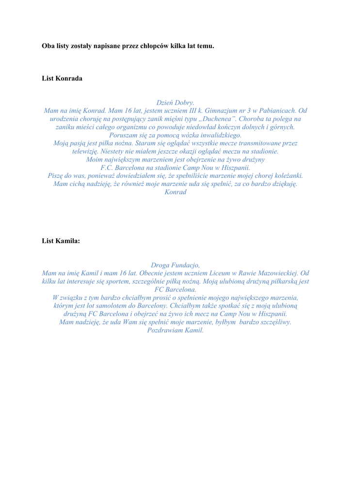 Oba listy zostały napisane przez chłopców kilka lat temu. List Konrada Dzień Dobry. Mam na imię Konrad. Mam 16 lat, jestem uczniem III k. Gimnazjum nr 3 w Pabianicach. Od urodzenia choruję na postępujący zanik mięśni typu „Duchenea”. Choroba ta polega na zaniku mieści całego organizmu co powoduje niedowład kończyn dolnych i górnych. Poruszam się za pomocą wózka inwalidzkiego. Moją pasją jest piłka nożna. Staram się oglądać wszystkie mecze transmitowane przez telewizję. Niestety nie miałem jeszcze okazji oglądać meczu na stadionie. Moim największym marzeniem jest obejrzenie na żywo drużyny F.C. Barcelona na stadionie Camp Nou w Hiszpanii. Piszę do was, ponieważ dowiedziałem się, że spełniliście marzenie mojej chorej koleżanki. Mam cichą nadzieję, że również moje marzenie uda się spełnić, za co bardzo dziękuję. Konrad List Kamila: Droga Fundacjo, Mam na imię Kamil i mam 16 lat. Obecnie jestem uczniem Liceum w Rawie Mazowieckiej. Od kilku lat interesuje się sportem, szczególnie piłką nożną. Moją ulubioną drużyną piłkarską jest FC Barcelona. W związku z tym bardzo chciałbym prosić o spełnienie mojego największego marzenia, którym jest lot samolotem do Barcelony. Chciałbym także spotkać się z moją ulubioną drużyną FC Barcelona i obejrzeć na żywo ich mecz na Camp Nou w Hiszpanii. Mam nadzieję, że uda Wam się spełnić moje marzenie, byłbym bardzo szczęśliwy. Pozdrawiam Kamil.