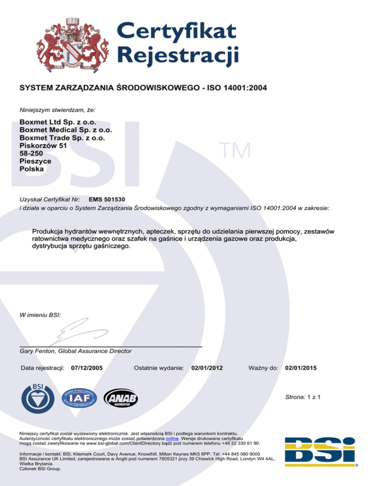 SYSTEM ZARZĄDZANIA ŚRODOWISKOWEGO - ISO 14001:2004 Niniejszym stwierdzam, że: Boxmet Ltd Sp. z o.o. Boxmet Medical Sp. z o.o. Boxmet Trade Sp. z o.o. Piskorzów 51 58-250 Pieszyce Polska Uzyskał Certyfikat Nr: EMS 501530 i działa w oparciu o System Zarządzania Środowiskowego zgodny z wymaganiami ISO 14001:2004 w zakresie: Produkcja hydrantów wewnętrznych, apteczek, sprzętu do udzielania pierwszej pomocy, zestawów ratownictwa medycznego oraz szafek na gaśnice i urządzenia gazowe oraz produkcja, dystrybucja sprzętu gaśniczego. W imieniu BSI: Gary Fenton, Global Assurance Director Data rejestracji: 07/12/2005 Ostatnie wydanie: 02/01/2012 Ważny do: 02/01/2015 Strona: 1 z 1 Niniejszy certyfikat został wystawiony elektronicznie. Jest własnością BSI i podlega warunkom kontraktu. Autentyczność certyfikatu elektronicznego może zostać potwierdzona online. Wersje drukowane certyfikatu mogą zostać zweryfikowane na www.bsi-global.com/ClientDirectory bądź pod numerem telefonu +48 22 330 61 90. Informacje i kontakt: BSI, Kitemark Court, Davy Avenue, Knowlhill, Milton Keynes MK5 8PP. Tel: +44 845 080 9000 BSI Assurance UK Limited, zarejestrowana w Anglii pod numerem 7805321 przy 39 Chiswick High Road, Londyn W4 4AL, Wielka Brytania. Członek BSI Group.