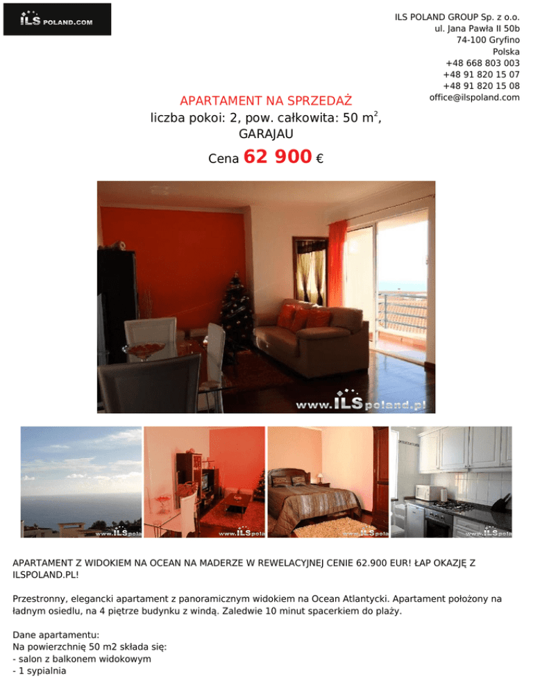 APARTAMENT NA SPRZEDAŻ liczba pokoi: 2, pow. całkowita: 50 m2, GARAJAU Cena 62 ILS POLAND GROUP Sp. z o.o. ul. Jana Pawła II 50b 74-100 Gryfino Polska +48 668 803 003 +48 91 820 15 07 +48 91 820 15 08 [email protected] 900 € APARTAMENT Z WIDOKIEM NA OCEAN NA MADERZE W REWELACYJNEJ CENIE 62.900 EUR! ŁAP OKAZJĘ Z ILSPOLAND.PL! Przestronny, elegancki apartament z panoramicznym widokiem na Ocean Atlantycki. Apartament położony na ładnym osiedlu, na 4 piętrze budynku z windą. Zaledwie 10 minut spacerkiem do plaży. Dane apartamentu: Na powierzchnię 50 m2 składa się: - salon z balkonem widokowym - 1 sypialnia - 1 łazienka - kuchnia całkowicie wyposażona Dodatkowo: garaż na samochód pod budynkiem i pomieszczenie gospodarcze. ILS POLAND GROUP Sp. z o.o. ul. Jana Pawła II 50b 74-100 Gryfino Polska +48 668 803 003 +48 91 820 15 07 +48 91 820 15 08 [email protected] CENA NIERUCHOMOŚCI TYLKO: 62.900 EUR Podstawowe odległości: - do plaży 10min. na pieszo - do stolicy Funchal 10min. - w pobliżu sklepy, restauracje, szkoły, banki, apteka - do lotniska 15min. GARAJAU to miasto znajdujące się zaledwie 10 minut od stolicy Funchal. Garajau jest położone na pd.-wsch. od Funchal- 10 km od centrum stolicy, 8 km od międzynarodowego lotniska na Maderze, jest turystyczną miejscowością bardzo zieloną z zapierającymi dech w piersiach widokami. INFORMACJE PODSTAWOWE O WYSPIE: Błękitny ocean, przepiękne plaże, palmy, słońce kwitnąca roślinność przez cały rok to wizytówka Madery. Dzięki położeniu geograficznemu przez cały rok panują na niej przyjazne warunki pogodowe. Klimat łagodny, określany mianem "wiecznej wiosny". Bez względu na porę roku zawsze można opalać się na plaży czy wylegiwać nad basenem. Plaże są przepiękne a hotele na najwyższym poziomie. Madera od wielu lat przyciąga rzesze turystów, stąd bardzo dobrze rozwinięta infrastruktura. Madera to także rozległe zielone doliny, wszechobecne kolorowe kwiaty, wspaniałe lasy sąsiadujące z polami przypominającymi tarasy zdecydowanie zachęcają do bardziej aktywnego wypoczynku. Lasy wawrzynowe zostały wpisane na Listę Światowego Dziedzictwa Kulturowego i Przyrodniczego UNESCO. Obszar chroniony rezerwatem zajmuje niemal 2/3 powierzchni wyspy. Dla miłośników golfa znajdą się również pola golfowe. Madera to archipelag, składa się z wysp Madery, Porto Santo i kilku mniejszych wysepek. Archipelag leży około 570 km od wybrzeży Afryki, 370 kilometrów od Gran Canarii i 770 km od wyspy Santa Maria, najbliższej z Azorów. ZAINTERESOWANY? DZWOŃ! +48 606 21 41 51 lub [email protected] WIĘCEJ INFORMACJI I OFERT? ZAJRZYJ DO NASZEGO SERWISU! WWW.ILSPOLAND.PL UWAGA: Obszerną galerię 27 fotografii i więcej informacji oraz szerszą gamę ofert prezentujemy wyłącznie w naszym firmowym serwisie: WWW.ILSPOLAND.PL Symbol ILSB0956 Typ nieruchomości APARTAMENT Rodzaj transakcji SPRZEDAŻ Status AKTUALNA Rodzaj rynku WTÓRNY Cena 263 721 PLN Cena (EUR) 62 900 € Cena (USD) 63 601 $ ILS POLAND GROUP Sp. z o.o. ul. Jana Pawła II 50b 74-100 Gryfino Polska +48 668 803 003 +48 91 820 15 07 +48 91 820 15 08 [email protected] Cena za m2 5 274,42 PLN Cena za m2 (euro) Cena za m2 (usd) 1 272,02 $ Cena negocjowana NIE Kraj PORTUGALIA Województwo MADERA Powiat GARAJAU Gmina GARAJAU Miejscowość GARAJAU Pow. całkowita 50,00 m2 Forma własności działki WŁASNOŚĆ Rodzaj budynku APARTAMENTOWIEC Standard WYSOKI STANDARD Konstrukcja budynku MUROWANA Materiał ścian CEGŁA Typ kuchni Z OKNEM Liczba pokoi 2 Piętro 4 Liczba pięter 4 Ilość poziomów 1 Źródło c.w. GAZOWY 2-OBIEGOWY Ogrzewanie C.O. GAZOWE Dodatkowe BALKON Forma własności PEŁNA WŁASNOŚĆ Linia telefoniczna JEST Podłączony gaz JEST Podłączony wodociąg JEST Podłączona kanalizacja JEST Internet JEST Telewizja kablowa JEST Domofon JEST Rodzaj okien PCV Garaż JEST Balkon JEST Najbliższe morze 100M-500M Nr Licencji 11678 Cechy dodatkowe OKAZYJNA CENA, TYLKO U NAS, Ilona Biercewicz +48 606 214 151 [email protected] Więcej ofert na stronie www.ilspoland.com 1 258,00 €