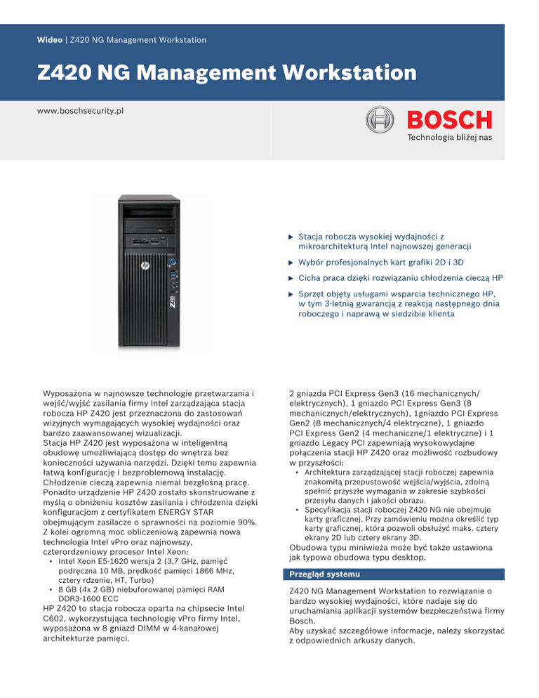 Wideo | Z420 NG Management Workstation Z420 NG Management Workstation www.boschsecurity.pl Wyposażona w najnowsze technologie przetwarzania i wejść/wyjść zasilania firmy Intel zarządzająca stacja robocza HP Z420 jest przeznaczona do zastosowań wizyjnych wymagających wysokiej wydajności oraz bardzo zaawansowanej wizualizacji. Stacja HP Z420 jest wyposażona w inteligentną obudowę umożliwiającą dostęp do wnętrza bez konieczności używania narzędzi. Dzięki temu zapewnia łatwą konfigurację i bezproblemową instalację. Chłodzenie cieczą zapewnia niemal bezgłośną pracę. Ponadto urządzenie HP Z420 zostało skonstruowane z myślą o obniżeniu kosztów zasilania i chłodzenia dzięki konfiguracjom z certyfikatem ENERGY STAR obejmującym zasilacze o sprawności na poziomie 90%. Z kolei ogromną moc obliczeniową zapewnia nowa technologia Intel vPro oraz najnowszy, czterordzeniowy procesor Intel Xeon: • Intel Xeon E5-1620 wersja 2 (3,7 GHz, pamięć podręczna 10 MB, prędkość pamięci 1866 MHz, cztery rdzenie, HT, Turbo) • 8 GB (4x 2 GB) niebuforowanej pamięci RAM DDR3‑1600 ECC HP Z420 to stacja robocza oparta na chipsecie Intel C602, wykorzystująca technologię vPro firmy Intel, wyposażona w 8 gniazd DIMM w 4-kanałowej architekturze pamięci. u Stacja robocza wysokiej wydajności z mikroarchitekturą Intel najnowszej generacji u Wybór profesjonalnych kart grafiki 2D i 3D u Cicha praca dzięki rozwiązaniu chłodzenia cieczą HP u Sprzęt objęty usługami wsparcia technicznego HP, w tym 3-letnią gwarancją z reakcją następnego dnia roboczego i naprawą w siedzibie klienta 2 gniazda PCI Express Gen3 (16 mechanicznych/ elektrycznych), 1 gniazdo PCI Express Gen3 (8 mechanicznych/elektrycznych), 1gniazdo PCI Express Gen2 (8 mechanicznych/4 elektryczne), 1 gniazdo PCI Express Gen2 (4 mechaniczne/1 elektryczne) i 1 gniazdo Legacy PCI zapewniają wysokowydajne połączenia stacji HP Z420 oraz możliwość rozbudowy w przyszłości: • Architektura zarządzającej stacji roboczej zapewnia znakomitą przepustowość wejścia/wyjścia, zdolną spełnić przyszłe wymagania w zakresie szybkości przesyłu danych i jakości obrazu. • Specyfikacja stacji roboczej Z420 NG nie obejmuje karty graficznej. Przy zamówieniu można określić typ karty graficznej, która pozwoli obsłużyć maks. cztery ekrany 2D lub cztery ekrany 3D. Obudowa typu miniwieża może być także ustawiona jak typowa obudowa typu desktop. Przegląd systemu Z420 NG Management Workstation to rozwiązanie o bardzo wysokiej wydajności, które nadaje się do uruchamiania aplikacji systemów bezpieczeństwa firmy Bosch. Aby uzyskać szczegółowe informacje, należy skorzystać z odpowiednich arkuszy danych. 2 | Z420 NG Management Workstation Mikroarchitektura procesora Intel oferuje najnowsze osiągnięcia w tej dziedzinie, w tym: • Odpowiednia konstrukcja i możliwość skalowania wydajności dzięki technologii Intel Hyper-Threading (Intel®HT), możliwość zmiany rozmiaru pamięci cache, łączenie systemów i zintegrowane kontrolery pamięci. • Technologia Intel Turbo Boost pozwala automatycznie dostarczyć większą wydajność dzięki wykorzystaniu marginesu swobody procesora w zakresie mocy i temperatury. • Technologia Intel Hyper-Threading pozwala uruchamiać wymagające aplikacje na typowych komputerach, które obsługują od 1 do 16 lub więcej wątków i zostały zoptymalizowane pod kątem zastosowania nowej generacji wielordzeniowych procesorów. • Technologia Intel vPro zapewniająca maksymalne bezpieczeństwo przy wykorzystaniu zasobów sprzętowych oraz zarządzanie na najwyższym poziomie Certyfikaty i świadectwa Dyrektywa RoHS Produkt spełnia wymagania Dyrektywy RoHS 2002/95/WE Dyrektywa WEEE Produkt spełnia wymagania Dyrektywy WEEE 2002/96/WE ISO 11469 ISO 1043 Elementy plastikowe produktu o masie powyżej 25 g zostały oznaczone zgodnie z normą ISO 11469 i ISO 1043 Produkt zawiera 0% materiałów pochodzących z recyklingu (wagowo) Po zakończeniu użytkowania produkt w ponad 90% nadaje się do ponownego przetworzenia Uwaga Zarządzająca stacja robocza firmy Bosch oferuje wielojęzyczny interfejs użytkownika (Multilingual User Interface, MUI). Podczas pierwszej instalacji wybierz język stacji roboczej i wstępnie zainstalowany MUI. Nie będzie można zmienić wybranego języka po zakończeniu pierwszej instalacji. Karta graficzna Specyfikacja stacji roboczej Z420 NG nie obejmuje karty graficznej. Przy zamówieniu można wybrać spośród pełnej gamy kart: Karta graficzna NVIDIA Quadro K600, 1 GB Karta grafiki 3D klasy podstawowej MHW-AWGC-K600 Obsługiwane są 1 lub 2 z tych kart – karta nr 2 musi pasować do karty nr 1. Karta graficzna NVIDIA Quadro K2000, 2 GB Karta grafiki 3D klasy średniej MHW-AWGC-K2000 Obsługiwane są 1 lub 2 z tych kart – karta nr 2 musi pasować do karty nr 1. Karta graficzna NVIDIA Quadro K4000, 3 GB Karta grafiki 3D wysokiej klasy MHW-AWGC-K4000 Brak obsługi drugiej karty Karta graficzna AMD FirePro W7000, 4 GB Karta grafiki 3D wysokiej klasy MHW-AWGC-ATIW70 Brak obsługi drugiej karty Dołączone części Liczba Elementy 1 HP Z420 8-DIMM Workstation 1 • Zestaw lokalizacyjny HP Z420 (wybierz żądany język) 1 • Obudowa HP Z420 z zasilaczem 600 W o sprawności 90% 1 • 1. dysk twardy SATA, 500 GB, 7200 obr./min 1 • Standardowa klawiatura USB HP 1 • Mysz optyczna USB HP 1 • Napęd HP 16X DVD± RW SuperMulti SATA 1 • Intel Xeon E5-1620 wersja 2 (3,7/10 MB/procesor 4-rdzeniowy 1866) 1 • 8 GB (4x 2 GB) pamięci RAM DDR3‑1600 ECC 1 • Zestaw adaptera portu szeregowego HP Zgodność Region Certyfikacja Europa CE Z420 Declaration of Conformity (CE + UL) Planowanie Dostępne języki Zarządzająca stacja robocza występuje w trzech zestawach lokalizacyjnych: MHW‑WZ4R2‑NGDE – lokalizacja/klawiatura: język niemiecki MHW‑WZ4R2‑NGUK – lokalizacja/klawiatura: język angielski (brytyjski) MHW‑WZ4R2‑NG