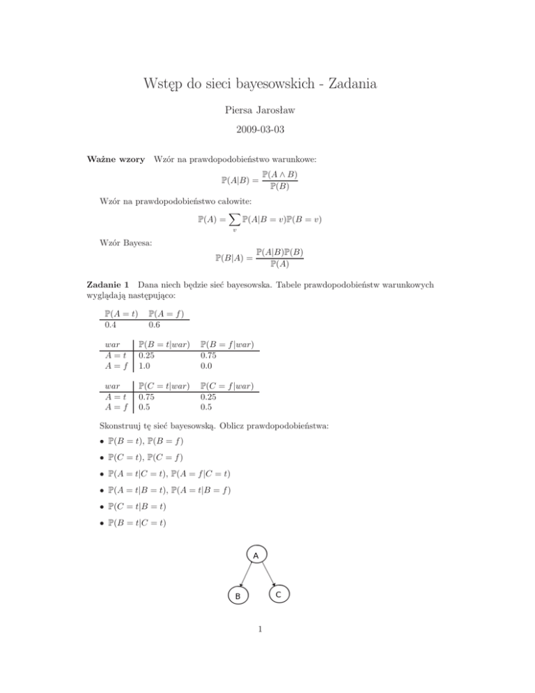 Wstęp do sieci bayesowskich - Zadania Piersa Jarosław 2009-03-03 Wzór na prawdopodobieństwo warunkowe: Ważne wzory P(A|B) = P(A ∧ B) P(B) Wzór na prawdopodobieństwo całowite: X P(A) = P(A|B = v)P(B = v) v Wzór Bayesa: P(B|A) = P(A|B)P(B) P(A) Zadanie 1 Dana niech będzie sieć bayesowska. Tabele prawdopodobieństw warunkowych wyglądają następująco: P(A = t) 0.4 P(A = f ) 0.6 war A=t A=f P(B = t|war) 0.25 1.0 P(B = f |war) 0.75 0.0 war A=t A=f P(C = t|war) 0.75 0.5 P(C = f |war) 0.25 0.5 Skonstruuj tę sieć bayesowską. Oblicz prawdopodobieństwa: • P(B = t), P(B = f ) • P(C = t), P(C = f ) • P(A = t|C = t), P(A = f |C = t) • P(A = t|B = t), P(A = t|B = f ) • P(C = t|B = t) • P(B = t|C = t) 1 Zadanie 2 Problem Monty Hall, „Idź na całość”, „Let’s make a deal”... Uczestnik konkursu wybiera jedną z trzech bramek, za jedną z niech jest nagroda, za dwiema nie ma nic. Uczestnik nie wie co kryją bramki. Prowadzący (wie gdzie jest nagroda) odsłania uczestnikowi jedną z bramek, w której nie ma nagrody, a której uczestnik nie wybrał — zawsze jest taka bramka, czasem jest tylko jedna. Uczestnik otrzymuje możliwość zamiany „swojej bramki” na tę drugą nieodsłoniętą. Czy największe prawdopodobieństwo wygranej jest gdy zamieni bramkę, gdy zachowa swoją bramkę, czy być może nie ma to wpływu na wygraną? Skonstruuj sieć bayesowską symulującą rozgrywkę (wskazówka: wystarczą trzy węzły). Zadanie 3 Rozważmy uogólnione zadanie 2 w którym mamy n bramek — w jednej jest nagroda w pozostałych nic. Uczestnik wybiera jedną z bramek, a prowadzący odsłania mu m z pozostałych, w których nie ma nagrody (m = 1..n − 2). Pozostają przynajmniej dwie bramki (dokładniej n− m) w tym jedna uczestnika. Uczestnik otrzymuje możliwość zamiany swojej bramki na jedną z nieodsłoniętych. Czy powinien zamienić, zachować bramkę czy nie ma to wpływu na wygraną. Skonstruuj sieci bayesowskie rozwiązujące ten problem dla kilku różnych par (n, m) np: (3, 1), (4, 1), (4, 2) , (5, 1), (5, 2), (5, 3), (10, 8), (100, 98)... Dla dużych n pomyśl o bardziej kompaktowym rozwiązaniu (tabele prawdopodobieństw dla n = 100 będą miały 10000 pozycji!). Zadanie 4 Na pewną chorobę (Iksodalna Igrekoskoza Zetocyny) choruje 2% populacji. Istnieje na nią test, który daje odpowiedź poprawną w 95 przypadkach na 100 (zarówno pozytywną jak i negatywną). U losowego badanego test wykazał wynik pozytywny. Czy faktycznie jest powód do niepokoju? Skonstruuj sieć bayesowską rozwiązującą ten problem (2 węzły). Zadanie 5 Do sieci z zadania 3 dodaj węzeł(y) obliczający nagrodę w wypadkach gry ze zmianą bramki i gry bez zmiany (można odobno). Następnie wygeneruj instancje danych na podstawie sieci (Cases ->Simulate Cases) dla obu przypadków. W arkuszu kalkulacyjnym, pakiecie statystycznym lub ręcznie policz jaki jest odsetek wyników, w których uczestnik wygrał, wśród wszystkich wyników, w których grał tą samą taktyką. Czy zgadza się ze wskazaniami sieci? Wykonaj podobne symulacje dla sieci z innych zadań. Zadanie 6 Błądzenie losowe. Niech dane będzie 5 punktów p1 ..p5 . Określamy ciąg zmiennych losowych Xn . X0 zaczyna w losowym z punktów (losowanym z rozkładu jednostajnego). Jeżeli Xn jest w punkcie pj to Xn+1 z prawdopodobieństwem 0.5 przejdzie do pj+1 i z prawdopodobieństwem 0.5 przejdzie do pj−1 dla j = 2, 3, 4. Jeżeli jest to stan brzegowy to z prawdopodobieństwem 0.5 Xn+1 pozostanie w tym samym punkcie i z pradopodobieństwem 0.5 przejdzie do jedynego sąsiada. Skonstruuj sieć bayesowską symulującą ten proces dla pierwszych 10 kroków. Zadanie programisyczne Napisz program pozwalający wygenerować, wczytać lub wylosować sieć bayesowską, a następnie generujący instancje wyników dla tej sieci (patrz zadanie 5). Powinna być możliwość ustawienia struktury sieci i tabel prawdopodobieństw warunkowych przynajmniej na poziomie kodu programu. Ewentualnie można wczytywać pliki z siecią wygenerowaną w innych pakietach (Netica). Mile widziane są dodatkowe opcje np: zapis wyników do pliku tekstowego, edytor sieci i tabel prawdopodobieństw, możliwość podglądu, praktyczne zastosowanie z wizualizacją (np. sieć sterująca robotem w kolejnych iteracjach, na podstawie wygenerowanych wyników robot podejmuje określone działanie). Język programowania — dowolny, ale rozwiązania korzystające z gotowych bibliotek dla sieci bayesowskich nie będą akceptowane. Punktacja — 1 punkt. Termin oddawania — 31.03.2009. 2