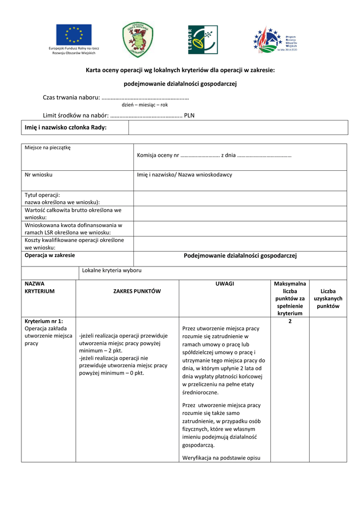 Europejski Fundusz Rolny na rzecz Rozwoju Obszarów Wiejskich Karta oceny operacji wg lokalnych kryteriów dla operacji w zakresie: podejmowanie działalności gospodarczej Czas trwania naboru: ………………………………………………… dzień – miesiąc – rok Limit środków na nabór: ……………………………………….. PLN Imię i nazwisko członka Rady: Miejsce na pieczątkę Komisja oceny nr ………………..…….. z dnia ………………………………… Nr wniosku Imię i nazwisko/ Nazwa wnioskodawcy Tytuł operacji: nazwa określona we wniosku): Wartość całkowita brutto określona we wniosku: Wnioskowana kwota dofinansowania w ramach LSR określona we wniosku: Koszty kwalifikowane operacji określone we wniosku: Operacja w zakresie Podejmowanie działalności gospodarczej Lokalne kryteria wyboru NAZWA KRYTERIUM Kryterium nr 1: Operacja zakłada utworzenie miejsca pracy UWAGI ZAKRES PUNKTÓW -jeżeli realizacja operacji przewiduje utworzenia miejsc pracy powyżej minimum – 2 pkt. -jeżeli realizacja operacji nie przewiduje utworzenia miejsc pracy powyżej minimum – 0 pkt. Przez utworzenie miejsca pracy rozumie się zatrudnienie w ramach umowy o pracę lub spółdzielczej umowy o pracę i utrzymanie tego miejsca pracy do dnia, w którym upłynie 2 lata od dnia wypłaty płatności końcowej w przeliczeniu na pełne etaty średnioroczne. Przez utworzenie miejsca pracy rozumie się także samo zatrudnienie, w przypadku osób fizycznych, które we własnym imieniu podejmują działalność gospodarczą. Weryfikacja na podstawie opisu Maksymalna liczba punktów za spełnienie kryterium 2 Liczba uzyskanych punktów Europejski Fundusz Rolny na rzecz Rozwoju Obszarów Wiejskich we wniosku o przyznanie pomocy / biznesplanie. Kryterium nr 2: Operacja dotyczy lub ma bezpośredni wpływ na rozwój turystyki Kryterium nr 3: Stopień wykorzystania zasobów lokalnego dziedzictwa kulturowego, lokalnych produktów, w tym produktów rolnych - zgodnie ze swoim uznaniem członek Rady może przyznać od 0 do 4 pkt. - zgodnie ze swoim uznaniem członek Rady może przyznać od 0 do 4 pkt. Kryterium nr 4: Wnioskodawca należy do grupy defaworyzowanej ze względu na dostęp do rynku pracy, określonych w LSR 1) TAK –4 pkt. 2) NIE – 0 pkt. Kryterium nr 5: Kwalifikacje lub doświadczenie odpowiednie do zakresu działalności, którą zamierza uruchomić - Wnioskodawca posiada kwalifikacje i/lub doświadczenie niezbędne do uruchomienia działalności w zakresie określonym we wniosku o przyznanie pomocy – 2 pkt. - Wnioskodawca nie posiada doświadczenia i kwalifikacji w zakresie o kreślonym we wniosku o przyznanie pomocy – 0 pkt. Kryterium nr 6: Gotowość do - operacja jest gotowa do realizacji tj. wnioskodawca uzyskał pozwolenia, -kryterium to jest oceniane na podstawie danych we wniosku / biznesplanie Przez zasoby lokalnego dziedzictwa kulturowego rozumieć należy m.in. zasoby kulturowe, przyrodnicze, historyczne, atrakcje turystyczne, zabytki, tradycja, folklor, zwyczaje. Przez lokalne produkty należy rozumieć produkty związane z obszarem LSR, specyficzne dla tego obszaru, w oparciu o które buduje się markę obszaru i które wpływają na promocję obszaru. Przez lokalne produkty rolne należy rozumieć – produkty rolne wytwarzane na obszarze objętym LSR. - kryterium to jest oceniane na podstawie uzasadnienia przedstawionego przez Wnioskodawcę i danych we wniosku / biznesplanie Grupy defaworyzowane ze względu na dostęp do rynku pracy określone w LSR (długotrwale bezrobotni – pozostający bez pracy przynajmniej rok, osoby w wieku niemobilnym - 45+, osoby w wieku 50+, bezrobotne osoby niepełnosprawne) - kryterium jest oceniane na podstawie uzasadnienia i danych we wniosku / biznesplanie - kryterium jest oceniane na podstawie uzasadnienia przedstawionego przez Wnioskodawcę i danych we wniosku / biznesplanie oraz dokumentów załączonych do wniosku Punkty przyznawane są za posiadanie wymaganych 4 4 4 2 4 Europejski Fundusz Rolny na rzecz Rozwoju Obszarów Wiejskich realizacji projektu na dzień złożenia wniosku zezwolenia i inne decyzje, w tym ostateczną decyzję o środowiskowych uwarunkowaniach , których uzyskanie jest wymagane przez odrębne przepisy), bądź operacja nie wymaga uzyskania jakichkolwiek pozwoleń, uzgodnień itp. – 4 pkt. - wnioskodawca posiada pełną dokumentację technicznokosztorysową i jest w trakcie uzyskiwania pozwoleń, zezwoleń i innych decyzji, w tym ostatecznej decyzję o środowiskowych uwarunkowaniach , których uzyskanie jest wymagane przez odrębne przepisy lub nie posiada jeszcze wszystkich wymaganych pozwoleń, uzgodnień itp.) – 2 pkt. Kryterium nr 7: W dniu złożenia wniosku wnioskodawca jest zameldowany na pobyt stały lub czasowy na terenie LSR od co najmniej od 24 miesięcy pozwoleń, decyzji, których uzyskanie wynika z procedur prawa budowlanego i zagospodarowania przestrzennego, przeprowadzenia postępowania OOŚ, uzyskania, przyłączenia do sieci elektroenergetycznej, do sieci ciepłowniczej, itp.). - kryterium jest oceniane na podstawie dokumentów załączonych do wniosku oraz uzasadnienia przedstawionego przez Wnioskodawcę i danych we wniosku / biznesplanie - kryterium jest oceniane w oparciu o dokumenty przedstawione przez Wnioskodawcę – zaświadczenie o zameldowaniu, wydane nie wcześniej niż miesiąc przed dniem złożenia wniosku o przyznanie pomocy - tak – 2 pkt. - nie – 0 pkt. 2 Suma punktów 22 Czy realizacja projektu uzyskała minimalną (13) liczbę punktów umożliwiającą wybór do finansowania: Tak Nie Liczba uzyskanych punktów: Miejsce: Data: Czytelny podpis: Podpis sekretarza posiedzenia: Instrukcja wypełnienia karty oceny operacji wg lokalnych kryteriów dla operacji z zakresu „Podejmowanie działalności gospodarczej” 1. Kartę należy wypełnić w sposób czytelny. 2. W kolumnie ,,liczba punktów uzyskanych’’ należy podać liczbę uz