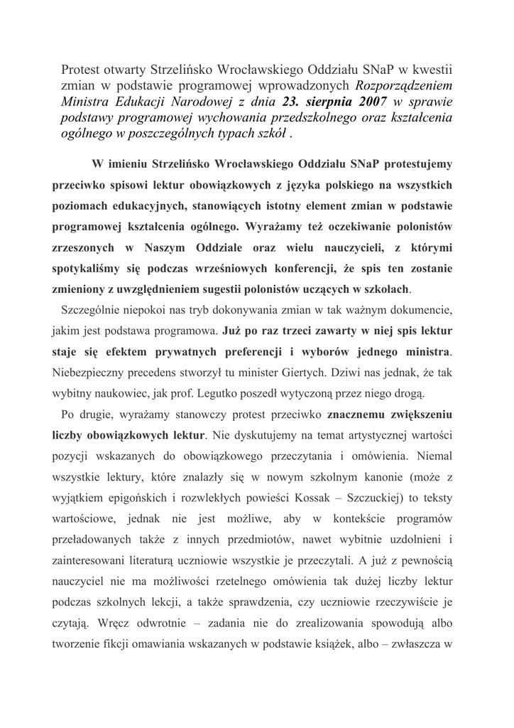 Protest otwarty Strzelińsko Wrocławskiego Oddziału SNaP w kwestii zmian w podstawie programowej wprowadzonych Rozporządzeniem Ministra Edukacji Narodowej z dnia 23. sierpnia 2007 w sprawie podstawy programowej wychowania przedszkolnego oraz kształcenia ogólnego w poszczególnych typach szkół . W imieniu Strzelińsko Wrocławskiego Oddziału SNaP protestujemy przeciwko spisowi lektur obowiązkowych z języka polskiego na wszystkich poziomach edukacyjnych, stanowiących istotny element zmian w podstawie programowej kształcenia ogólnego. Wyrażamy też oczekiwanie polonistów zrzeszonych w Naszym Oddziale oraz wielu nauczycieli, z którymi spotykaliśmy się podczas wrześniowych konferencji, że spis ten zostanie zmieniony z uwzględnieniem sugestii polonistów uczących w szkołach. Szczególnie niepokoi nas tryb dokonywania zmian w tak ważnym dokumencie, jakim jest podstawa programowa. Już po raz trzeci zawarty w niej spis lektur staje się efektem prywatnych preferencji i wyborów jednego ministra. Niebezpieczny precedens stworzył tu minister Giertych. Dziwi nas jednak, że tak wybitny naukowiec, jak prof. Legutko poszedł wytyczoną przez niego drogą. Po drugie, wyrażamy stanowczy protest przeciwko znacznemu zwiększeniu liczby obowiązkowych lektur. Nie dyskutujemy na temat artystycznej wartości pozycji wskazanych do obowiązkowego przeczytania i omówienia. Niemal wszystkie lektury, które znalazły się w nowym szkolnym kanonie (może z wyjątkiem epigońskich i rozwlekłych powieści Kossak – Szczuckiej) to teksty wartościowe, jednak nie jest możliwe, aby w kontekście programów przeładowanych także z innych przedmiotów, nawet wybitnie uzdolnieni i zainteresowani literaturą uczniowie wszystkie je przeczytali. A już z pewnością nauczyciel nie ma możliwości rzetelnego omówienia tak dużej liczby lektur podczas szkolnych lekcji, a także sprawdzenia, czy uczniowie rzeczywiście je czytają. Wręcz odwrotnie – zadania nie do zrealizowania spowodują albo tworzenie fikcji omawiania wskazanych w podstawie książek, albo – zwłaszcza w szkołach ponadgimnazjalnych (gdzie trzeba przygotować uczniów do egzaminu sprawdzającego czytanie lektur umieszczonych w kanonie) – wykorzystania bądź wypracowania metod omówienia lektury bez jej pełnego przeczytania, na podstawie równego typu pomocy i trafnie dobranych fragmentów. Po trzecie, niepokoi nas, niezgodne z głównymi założeniem reformy edukacji (czyli zwiększenia autonomii szkół, nauczycieli i uczniów) zamykanie zestawienia lektur obowiązkowych. W nowym kanonie prawie nie ma już pozycji do wyboru. Pokażemy to na przykładzie lektur dla poziomu podstawowego w szkołach ponadgimnazjalnych: pp, poziom podstawowy 2002 LITERATURA POLSKA Ignacy Krasicki – satyry i liryki wybrane sceny z dramatów romantycznych (J. Słowackiego, Z. Krasickiego) E. Orzeszkowa – Nad Niemnem (wybór) wybór nowel pozytywistycznych H. Sienkiewicz – wybrana powieść wybrany utwór z prozy polskiej XX wieku (np. M. Dąbrowskiej, Z. Nałkowskiej) W. Gombrowicz - fragmenty prozy wybrany dramat XX wieku (S. Mrożka, S. Różewicza) T. Borowski – wybrane opowiadania wybrane fragmenty prozy dokumentarnej (reportaż , dziennik, pamiętnik) i eseistyczne utwory współczesne LITERATURA POWSZECHNA wybrany klasyczny dramat starożytnej Grecji Szekspir – wybrany dramat Molier – wybrana komedia pp, poziom podstawowy 2007 Piotr Skarga – Kazania sejmowe (wybór) Ignacy Krasicki – Pieśń Hymn do miłości Ojczyzny, satyry i liryki Stanisław Staszic – Przestrogi dla Polski Adam Mickiewicz – Konrad Wallenrod Juliusz Słowacki – Kordian Zygmunt Krasiński – Nie-Boska komedia (wybrane sceny) Listy (wybór) Eliza Orzeszkowa – Nad Niemnem Henryk Sienkiewicz – Quo vadis, Potop Maria Dąbrowska – Noce i dnie, Zofia Nałkowska – Granica, Bruno Schulz – Sklepy cynamonowe (wybrane opowiadania) Witold Gombrowicz - Ferdydurke Sławomir Mrożek - Tango Zofia Kossak Szczucka - Pożoga Tadeusz Borowski – Pożegnanie z Marią (wybrane opowiadania) Jan Paweł II – Pamięć i tożsamość, Ryszard Kapuściński - Cesarz, abp Kazimierz Madejski – Będziecie Moimi świadkami… (lub kardynał Stefan Wyszyński – Zapiski więzienne), inne wybrane fragmenty prozy dokumentarnej (reportaż , dziennik, pamiętnik) i eseistycznej Sofokles - Król Edyp William Szekspir - Makbet Molier - Świetoszek wybrana powieść europejska XIX wieku J. Conrad – wybrany utwór wybrana powieść XX wieku Daniel Defoe - Robinson Crusoe Fiodor Dostojewski – Zbrodnia i kara Joseph Conrad – Lord Jim C.S. Lewis – Listy starego diabła do młodego George Orwell – Folwark zwierzęcy Rozporządzenie z 2002 dawało CKE możliwość odświeżenia co jakiś czas „Wymagań egzaminacyjnych” i wskazywania w nich innego niż omawiany w poprzednich latach dramatu Szekspira czy Moliera, preferencji innej powieści XX wieku. Obecnie nie tylko nauczyciel, uczniowie nie mają już wyboru, ale każda potrzeba zmiany tekstu do czytania (np. „Makbeta” na „Hamleta”) wymagać będzie nowego ministerialnego rozporządzenia. Owo zamkniecie podstawy programowej zamyka również programy, upodabnia je do siebie, powodując fikcję pluralizmu. Odbije się to szczególnie negatywnie na lekcjach polskiego w szkole podstawowej, gdzie nauczyciel nie będzie miał już możliwości dostosowania analizowanych tekstów do zainteresowań, poziomu swoich uczniów, a nawet – zasobów szkolnej biblioteki. Konieczność kolejnych zakupów to dla wielu z nich obciążenie nie do udźwignięcia. Ministerstwo brnie w grę pozorów – z jednej strony walczy o tani podręcznik, a z drugiej, lekką ręką każe kupować drogie lektury. Ów brak wyboru w szkole podstawowej stawia na głowie idee reformy. Główny cel lekcji z lekturą w klasach IV – VI brzmi: Polubić czytanie. I wielu nauczycielom udawało się ten cel osiągnąć, dzięki odpowiedni