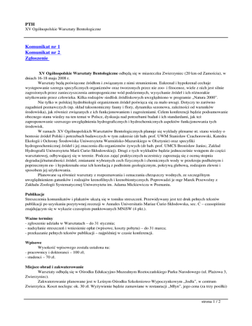 PTH XV Ogólnopolskie Warsztaty Bentologiczne Komunikat nr 1 Komunikat nr 2 Zgłoszenie XV Ogólnopolskie Warsztaty Bentologiczne odbędą się w miasteczku Zwierzyniec (20 km od Zamościa), w dniach 16-18 maja 2008 r. Warsztaty będą poświęcone źródłom i związanym z nimi strumieniom. Eukrenal i hypokrenal cechuje występowanie szeregu specyficznych organizmów oraz tworzonych przez nie zoo- i fitocenoz, wiele z nich jest silnie zagrożonych przez zanieczyszczenia antropogeniczne wód podziemnych, wysychanie źródeł i ich różnorakie użytkowanie przez człowieka. Kilka rodzajów siedlisk źródliskowych uwzględniono w programie „Natura 2000”. Nie tylko w polskiej hydrobiologii organizmom źródeł poświęca się za mało uwagi. Dotyczy to zarówno zagadnień poznawczych (np. skład taksonomiczny fauny i flory, dynamika sezonowa, zależności od warunków środowiska), jak również związanych z ich funkcjonowaniem i zagrożeniami. Celem konferencji będzie podsumowanie obecnego stanu wiedzy na ten temat w Polsce, dyskusja nad potrzebami badań i ich standardami, jak też zaproponowanie szerszego uwzględnienia hydrograficznych i hydrochemicznych aspektów funkcjonowania tych środowisk. W ramach XV Ogólnopolskich Warsztatów Bentologicznych planuje się wykłady plenarne nt. stanu wiedzy o bentosie źródeł Polski i potrzebach badawczych w tym zakresie (dr hab. prof. UWM Stanisław Czachorowski, Katedra Ekologii i Ochrony Środowiska Uniwersytetu Warmińsko-Mazurskiego w Olsztynie) oraz specyfiki hydrogeochemicznej źródeł i jej znaczenia dla organizmów żywych (dr hab. prof. UMCS Bronisław Janiec, Zakład Hydrografii Uniwersytetu Marii Curie-Skłodowskiej). Drugi z tych wykładów będzie jednocześnie wstępem do części warsztatowej, odbywającej się w terenie. Podczas zajęć praktycznych uczestnicy zapoznają się z oceną stopnia degradacji/naturalności źródeł, zmianami wybranych cech fizycznych i chemicznych wody w przekroju podłużnym i poprzecznym eu- i hypokrenalu oraz ich korelacją z podłożem geologicznym, pokrywą glebową, rodzajem zlewni i sposobem jej użytkowania. Planowane są również warsztaty z rozpoznawania i oznaczania chrząszczy wodnych, ze szczególnym uwzględnieniem gatunków i rodzajów krenofilnych i krenobiontycznych. Poprowadzi je mgr Marek Przewoźny z Zakładu Zoologii Systematycznej Uniwersytetu im. Adama Mickiewicza w Poznaniu. Publikacje Streszczenia komunikatów i plakatów ukażą się w tomiku streszczeń. Przewidywany jest też druk pełnych tekstów publikacji po uzyskaniu pozytywnej recenzji w Annales Universitatis Mariae Curie-Skłodowska, sec. C – czasopiśmie znajdującym się w wykazie czasopism punktowanych MNiSW (4 pkt.). Ważne terminy - zgłoszenie udziału w Warsztatach – do 31 stycznia; - nadsyłanie streszczeń i wniesienie opłat (wpisowe, koszty pobytu) – do 31 marca; - przekazanie pełnych tekstów publikacji – najpóźniej w czasie konferencji. Wpisowe Wysokość wpisowego została ustalona na: - pracownicy i doktoranci – 100 zł; - studenci – 70 zł. Miejsce obrad i zakwaterowanie Warsztaty odbędą się w Ośrodku Edukacyjno-Muzealnym Roztoczańskiego Parku Narodowego (ul. Plażowa 3, Zwierzyniec). Zakwaterowanie planowane jest w Leśnym Ośrodku Szkoleniowo-Wypoczynkowym „Jodła”, w centrum Zwierzyńca. Koszt noclegu: ok. 30 zł. Wyżywienie będzie zamawiane w restauracji „Młyn”, jego cena (za trzy posiłki) strona 1 / 2 PTH XV Ogólnopolskie Warsztaty Bentologiczne wyniesie prawdopodobnie też ok. 30 zł. Osobom zainteresowanym tańszym noclegiem, sugerujemy skorzystanie z usług Ośrodka Turystycznego Echo w Zwierzyńcu, gdzie pobyt na polu namiotowym kosztuje 7 zł. Są też domki kempingowe (13-20 zł za miejsce), jednak wynajem domku jest opłacalny tylko wtedy, gdy zbierze się pełna jego obsada. Pełną informację o kosztach posiłków i zakwaterowania przekażemy osobom zainteresowanym udziałem w warsztatach, w lutym 2008 r. Dojazd Dojazd samochodem najlepiej zaplanować przez Janów Lubelski lub Zamość. Połączenia komunikacją publiczną najlepsze są z Zamościem. Można też zaplanować dotarcie pociągiem do Lublina, skąd jeżdżą do Zwierzyńca autobusy PKS, jest też połączenie PKP. Streszczenia Prosimy o nadsyłanie streszczeń komunikatów i plakatów o objętości do 1,5 strony, edytor Word, czcionka Times New Roman, wysokość czcionki 12 punktów, interlinia 1,5 wiersza; bez rysunków, tabel i spisu literatury oraz bez wprowadzania w tekście wyróżnień innych niż kursywa (dotyczy gatunków/rodzajów). Układ streszczenia powinien być następujący: tytuł wystąpienia, imię i nazwisko autora (autorów), pełna nazwa instytucji, adres instytucji, adres e-mail, tekst streszczenia. Komitet Organizacyjny zastrzega sobie możliwość wnoszenia poprawek redakcyjnych, a także proponowania Autorom zmianę formy wystąpienia. Streszczenia prosimy przesyłać: Paweł Buczyński, Zakład Zoologii UMCS, ul. Akademicka 19, 20-033 Lublin, n Ten adres email jest ukrywany przed spamerami, włącz obsługę JavaScript w przeglądarce, by go zobaczyć Kolejny komunikat prześlemy w lutym do osób, które zgłoszą swój udział w Warsztatach. Prosimy o przekazanie wiadomości o Warsztatach osobom zainteresowanym. Z serdecznymi pozdrowieniami Paweł Buczyński strona 2 / 2