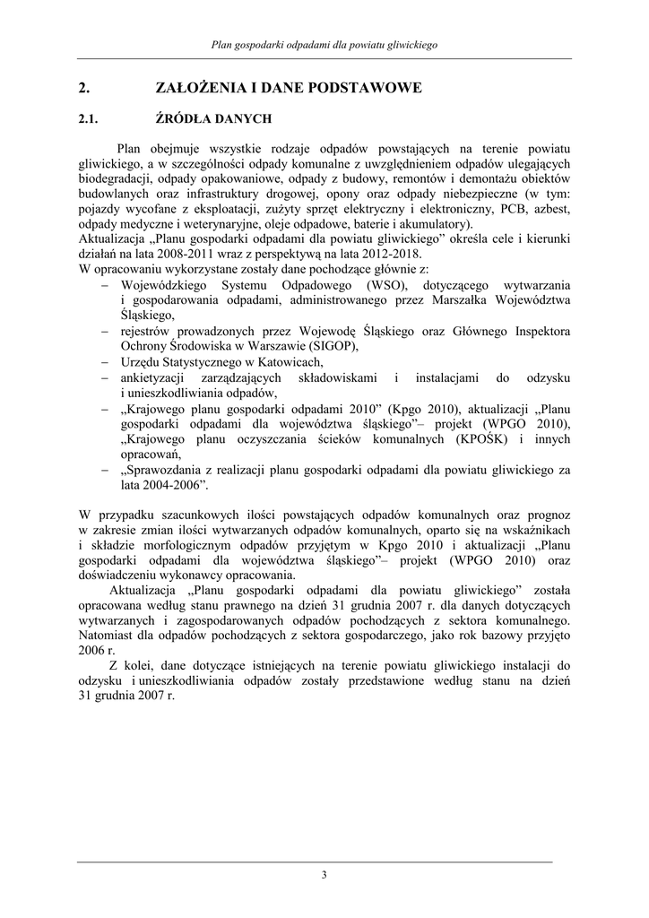 Plan gospodarki odpadami dla powiatu gliwickiego 2. ZAŁOśENIA I DANE PODSTAWOWE 2.1. ŹRÓDŁA DANYCH Plan obejmuje wszystkie rodzaje odpadów powstających na terenie powiatu gliwickiego, a w szczególności odpady komunalne z uwzględnieniem odpadów ulegających biodegradacji, odpady opakowaniowe, odpady z budowy, remontów i demontaŜu obiektów budowlanych oraz infrastruktury drogowej, opony oraz odpady niebezpieczne (w tym: pojazdy wycofane z eksploatacji, zuŜyty sprzęt elektryczny i elektroniczny, PCB, azbest, odpady medyczne i weterynaryjne, oleje odpadowe, baterie i akumulatory). Aktualizacja „Planu gospodarki odpadami dla powiatu gliwickiego” określa cele i kierunki działań na lata 2008-2011 wraz z perspektywą na lata 2012-2018. W opracowaniu wykorzystane zostały dane pochodzące głównie z: − Wojewódzkiego Systemu Odpadowego (WSO), dotyczącego wytwarzania i gospodarowania odpadami, administrowanego przez Marszałka Województwa Śląskiego, − rejestrów prowadzonych przez Wojewodę Śląskiego oraz Głównego Inspektora Ochrony Środowiska w Warszawie (SIGOP), − Urzędu Statystycznego w Katowicach, − ankietyzacji zarządzających składowiskami i instalacjami do odzysku i unieszkodliwiania odpadów, − „Krajowego planu gospodarki odpadami 2010” (Kpgo 2010), aktualizacji „Planu gospodarki odpadami dla województwa śląskiego”– projekt (WPGO 2010), „Krajowego planu oczyszczania ścieków komunalnych (KPOŚK) i innych opracowań, − „Sprawozdania z realizacji planu gospodarki odpadami dla powiatu gliwickiego za lata 2004-2006”. W przypadku szacunkowych ilości powstających odpadów komunalnych oraz prognoz w zakresie zmian ilości wytwarzanych odpadów komunalnych, oparto się na wskaźnikach i składzie morfologicznym odpadów przyjętym w Kpgo 2010 i aktualizacji „Planu gospodarki odpadami dla województwa śląskiego”– projekt (WPGO 2010) oraz doświadczeniu wykonawcy opracowania. Aktualizacja „Planu gospodarki odpadami dla powiatu gliwickiego” została opracowana według stanu prawnego na dzień 31 grudnia 2007 r. dla danych dotyczących wytwarzanych i zagospodarowanych odpadów pochodzących z sektora komunalnego. Natomiast dla odpadów pochodzących z sektora gospodarczego, jako rok bazowy przyjęto 2006 r. Z kolei, dane dotyczące istniejących na terenie powiatu gliwickiego instalacji do odzysku i unieszkodliwiania odpadów zostały przedstawione według stanu na dzień 31 grudnia 2007 r. 3 Plan gospodarki odpadami dla powiatu gliwickiego 2.2. UWARUNKOWANIA GOSPODARKI ODPADAMI WYNIKAJĄCE Z OBOWIĄZUJĄCYCH DOKUMENTÓW PLANISTYCZNYCH 2.2.1. Aktualizacja „Planu gospodarki odpadami dla województwa śląskiego” Aktualizacja „Planu gospodarki odpadami dla województwa śląskiego” (projekt) obejmuje pełny zakres zadań koniecznych do zapewnienia zintegrowanej gospodarki odpadami w województwie śląskim w sposób zapewniający ochronę środowiska, uwzględniając obecne i przyszłe moŜliwości i uwarunkowania ekonomiczne oraz poziom technologiczny istniejącej infrastruktury. Główne cele zawarte w aktualizacji „Planu gospodarki odpadami dla województwa śląskiego” (projekt) to: ●●● minimalizacja ilości wytwarzanych odpadów w stosunku do tempa wzrostu gospodarczego województwa, ●●● zwiększenie udziału odzysku, w tym w szczególności odzysku energii z odpadów, zgodnego z wymaganiami ochrony środowiska, ●●● prowadzenie zgodnie z wymaganiami ochrony środowiska i normami europejskimi systemu odzysku i unieszkodliwiania odpadów, ●●● zmniejszenie strumienia odpadów kierowanych na składowiska, w tym w szczególności odpadów biodegradowalnych, wielkogabarytowych odpadów niebezpiecznych, ●●● wyeliminowanie procederu nielegalnego składowania i zagospodarowywania odpadów oraz procederu turystyki odpadowej, ●●● optymalne wykorzystanie pojemności istniejących składowisk w celu maksymalnego wydłuŜenia okresu ich eksploatacji, ●●● zapewnienie niezbędnej ilości instalacji do odzysku i unieszkodliwiania odpadów, ●●● zapewnienie wiarygodnego i obszernego monitoringu pozwalającego na diagnozowanie potrzeb w zakresie gospodarowania odpadami w województwie, ●●● zwiększenie działań kontrolnych i skuteczna egzekucja prawa. Zgodnie z aktualizacją „Planu gospodarki odpadami dla województwa śląskiego” (projekt) system gospodarki odpadami komunalnymi w województwie śląskim realizowany będzie w 11 regionach, w których w oparciu o istniejąca infrastrukturę utworzone zostaną tzw. zakłady zagospodarowania odpadów (zzo) zapewniające mechaniczno-biologiczne lub termiczne przekształcanie zmieszanych odpadów komunalnych i pozostałości z sortowni. ZZO zapewnią równieŜ składowanie przetworzonych zmieszanych odpadów komunalnych, kompostowanie odpadów zielonych oraz opcjonalnie sortowanie frakcji odpadów komunalnych zbieranych selektywnie wielkogabarytowych takŜe przetwarzanie odpadów wielkogabarytowych i zuŜytego sprzętu elektrycznego i elektronicznego. Zgodnie z powyŜszym, powiat gliwicki łącznie z powiatem tarnogórskim został przyporządkowany do Regionu nr 8. 2.2.2. Strategia Rozwoju Powiatu Gliwickiego na lata 2005-2020 Strategia Rozwoju Powiatu Gliwickiego została przyjęta przez Radę Powiatu Gliwickiego Uchwałą Nr XXXI/237/2005 z dnia 28 kwietnia 2005 r. Stanowi ona plan rozwoju społeczno gospodarczego terytorium powiatu oraz ludności go zamieszkującej, przygotowany przez władze powiatu we współpracy z władzami gmin, liderami lokalnymi i wiodącymi środowiskami prorozwojowymi, tworzony pod okiem ekspertów, skonsultowany ze społecznością lokalną, jako odzew na wyzwania rozwojowe wynikające z uwarunkowań historycznych i sytuacji geopolitycznej. Zawarta w Strategii misja rozwoju powiatu to: 4 Plan gospodarki odpadami dla powiatu gliwickiego W postawie odpowiedzialności i słuŜby, kompetencji i uc
