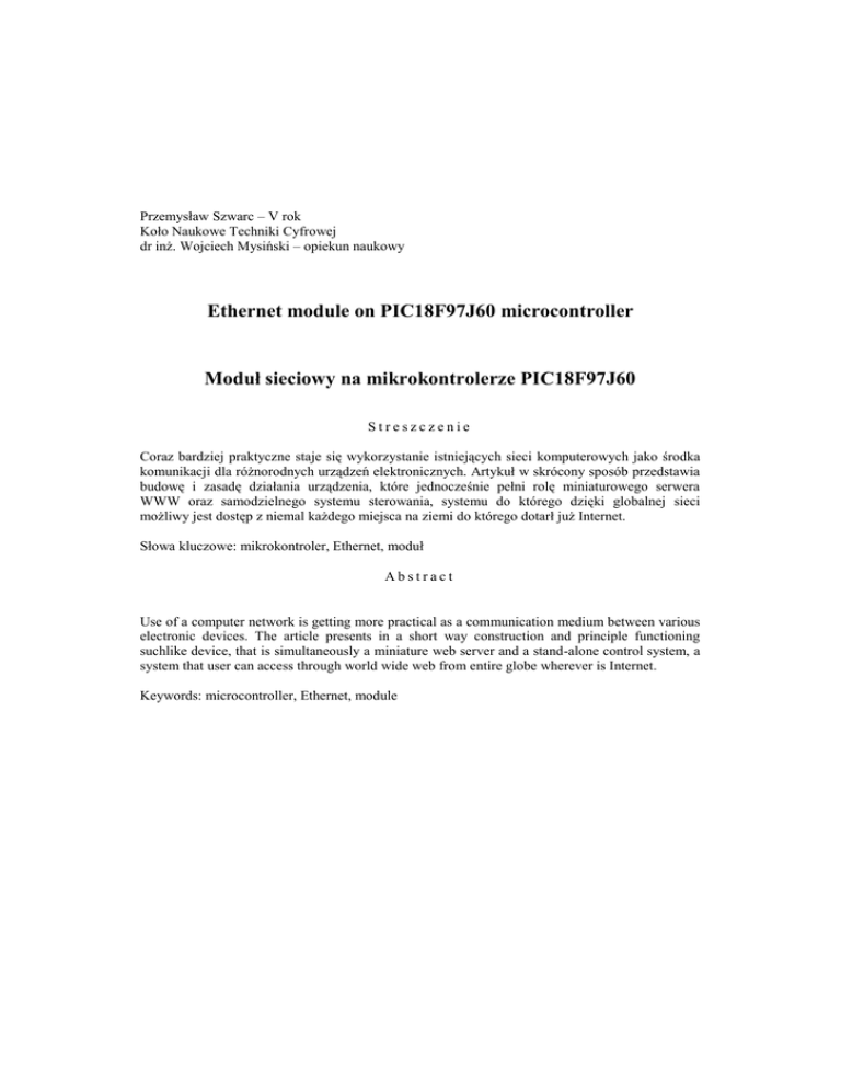 Przemysław Szwarc – V rok Koło Naukowe Techniki Cyfrowej dr inż. Wojciech Mysiński – opiekun naukowy Ethernet module on PIC18F97J60 microcontroller Moduł sieciowy na mikrokontrolerze PIC18F97J60 Streszczenie Coraz bardziej praktyczne staje się wykorzystanie istniejących sieci komputerowych jako środka komunikacji dla różnorodnych urządzeń elektronicznych. Artykuł w skrócony sposób przedstawia budowę i zasadę działania urządzenia, które jednocześnie pełni rolę miniaturowego serwera WWW oraz samodzielnego systemu sterowania, systemu do którego dzięki globalnej sieci możliwy jest dostęp z niemal każdego miejsca na ziemi do którego dotarł już Internet. Słowa kluczowe: mikrokontroler, Ethernet, moduł Abstract Use of a computer network is getting more practical as a communication medium between various electronic devices. The article presents in a short way construction and principle functioning suchlike device, that is simultaneously a miniature web server and a stand-alone control system, a system that user can access through world wide web from entire globe wherever is Internet. Keywords: microcontroller, Ethernet, module 1 Wstęp W obecnych czasach Internet dotarł już niemal wszędzie, jest obecny w prawie każdym domostwie, biurze, w małych zakładach pracy, w dużych fabrykach, a wraz z nim sieci telekomunikacyjne które są niezbędne do jego funkcjonowania. Najbardziej rozpowszechniona jest kablowa sieć typu Ethernet, obecne standardy prędkości w takiej sieci pozwalają na przesyłanie dużych ilości danych, umożliwia to jednoczesne prowadzenie rozmów telefonicznych, oglądanie telewizji, czy przeglądanie stron WWW. Sposobów na wykorzystanie takiej sieci jest wiele, jednym z nich jest podłączenie różnorodnych urządzeń takich jak telewizory, konsole do gier, urządzenia audio, kamery przemysłowe, urządzenia alarmowe, sterowniki przemysłowe, automaty z napojami, drukarki. Daje to możliwość zdalnego sprawdzenia stanu urządzenia, zużytych materiałów, aktualnie wykonywanego zadania, zmiany parametrów pracy, sterowania elementami wykonawczymi. Zasięg takiej komunikacji jest globalny a zarazem względnie tani. Warunkiem poprawnego działania w sieci jest wyposażenie urządzenia w odpowiedni interfejs sprzętowy oraz programowa obsługa protokołu TCP/IP. Kiedyś do tego celu służył komputer klasy PC z wbudowaną kartą sieciową oraz z zainstalowanym oprogramowaniem. Takie rozwiązanie posiada jednak wady, mianowicie: rozmiar klasycznego komputera, koszt zakupu i oczywiście zapotrzebowanie na energię. Rozwiązaniem tych problemów może być zastosowanie pojedynczego układu który mógłby zastąpić Peceta w zakresie komunikacji sieciowej. Istnieje cała gama układów tego typu, są to specjalizowane mikrokontrolery wytwarzane przez różnych producentów. Cechują się niskim kosztem, małymi rozmiarami i coraz to większymi możliwościami. Wydajność niektórych z nich pozwala na uruchomienie systemu operacyjnego co do niedawna było zarezerwowane tylko dla większych maszyn. 2. Mikrokontroler PIC18F97J60 PIC18F97J60 jest ośmiobitowym niskonapięciowym mikrokontrolerem produkowanym przez firmę Microchip, występuję w obudowie 100-pin TQFP, dostępne są również mniejsze odmiany układu 64 i 80 pin. Technologia nanoWatt zapewnia szereg funkcji mających na celu zredukowanie zużycia energii co ma znaczenie w projektach z zasilaniem bateryjnym. Najbardziej charakterystyczną cechą tego układu jest zintegrowany kontroler sieci Ethernet w pełni kompatybilny z sieciami 10/100/1000Base-T, posiada również zintegrowany MAC oraz 10Base-T PHY, 128kB pamięci Flash dla programu ,8kB niezależnej pamięci dla bufora Ethernetu, rozsyłanie pakietów metoda Unicast, Multicast oraz Broadcast, oprócz tego wyposażony został w wiele innych funkcji takich jak: elastyczny system taktowania procesora od 2.78 do 41.67MHz dla rezonatora 25MHz pamięć programu ROM 128kB pamięć operacyjna RAM 3.8kB napięcie zasilania w zakresie od 2.35V do 3.6V (3.14V do 3.45 w trybie pracy modułu Ethernet) wysokie prądy dla PortuB i PortuC wejście/wyjście 25mA pięć timerów: dwa 8-bit i trzy 16-bit cztery zewnętrzne piny obsługujące przerwania dwa moduły CCP trzy rozszerzone moduły ECCP, jedno dwa lub cztery wyjścia PWM z wybieralną polaryzacją dwa moduły MSPP wspierający standard SPI (wszystkie 4 tryby) oraz I2C (tryby Master i Slave) dwa moduły USART obsługujące standard: RS-485, RS-232 16 kanałowy, 10 bitowy przetwornik analogowo-cyfrowy wejścia cyfrowe tolerujące napięcie 5.5V Wachtdog Timer programowalny w zakresie od 4ms do 134s ICSP złącze programowania układu zamontowanego zewnętrzna szyna pamięci adresowalna do 2MB kontroler Ethernetu zgodny z IEE 802.3 zintegrowany MAC oraz 10Base-T PHY automatyczne wykrycie polaryzacji portu Ethernet 8kB pamięci SRAM dla bufora Ethernetu automatyczne powtórne wysłanie pakietu w przypadku kolizji automatyczna generacja sum kontrolnych CRC automatyczne odrzucanie błędnych pakietów sygnalizacja aktywności oraz statusu Producent układu zapewnia, jako biblioteki w języku C, bezpłatny stos TCP/IP optymalizowany dla rodzin mikrokontrolerów PIC18, PIC24 oraz dsPIC. Stos jest zestawem programów które dostarczają usługi dla aplikacji opartych o protokół TCP/IP. Użytkownik nie musi znać wszystkich złożonych specyfikacji protokołu TCP/IP aby go używać. Stos jest podzielony na wiele warstw, gdzie każda z warstw ma dostęp do usług z jednej lub więcej warstw bezpośrednio pod nią. Przez specyfikacje wiele warstw stosu TCP/IP dostępne są nie tylko w przypadku ich wywołania ale także w przypadku wystąpienie zdarzenia takiego jak time-out czy przybycie nowego pakietu. Praktyczne implementacje mogą być zrealizowane w przybliżeniu na 28-34kB kodu programu. w zależności od wykorzystanych modułów, pozostawiając więcej przestrzeni pamięci program