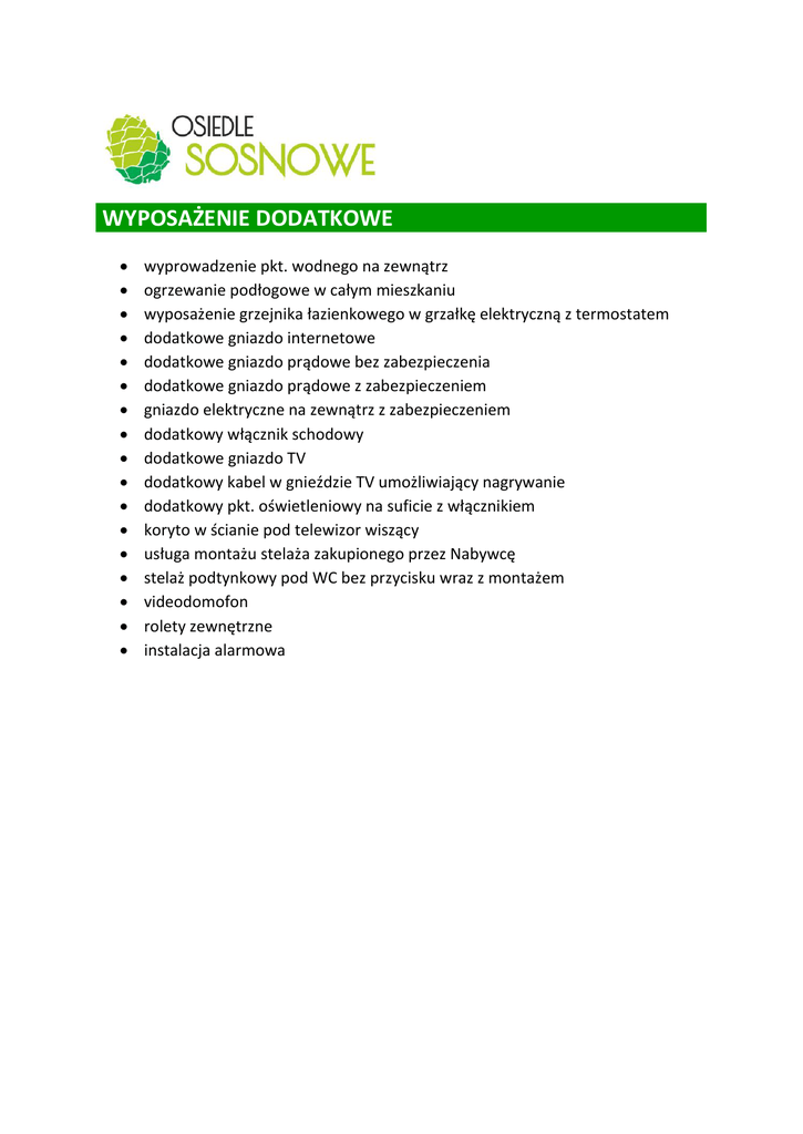 WYPOSAŻENIE DODATKOWE wyprowadzenie pkt. wodnego na zewnątrz ogrzewanie podłogowe w całym mieszkaniu wyposażenie grzejnika łazienkowego w grzałkę elektryczną z termostatem dodatkowe gniazdo internetowe dodatkowe gniazdo prądowe bez zabezpieczenia dodatkowe gniazdo prądowe z zabezpieczeniem gniazdo elektryczne na zewnątrz z zabezpieczeniem dodatkowy włącznik schodowy dodatkowe gniazdo TV dodatkowy kabel w gnieździe TV umożliwiający nagrywanie dodatkowy pkt. oświetleniowy na suficie z włącznikiem koryto w ścianie pod telewizor wiszący usługa montażu stelaża zakupionego przez Nabywcę stelaż podtynkowy pod WC bez przycisku wraz z montażem videodomofon rolety zewnętrzne instalacja alarmowa