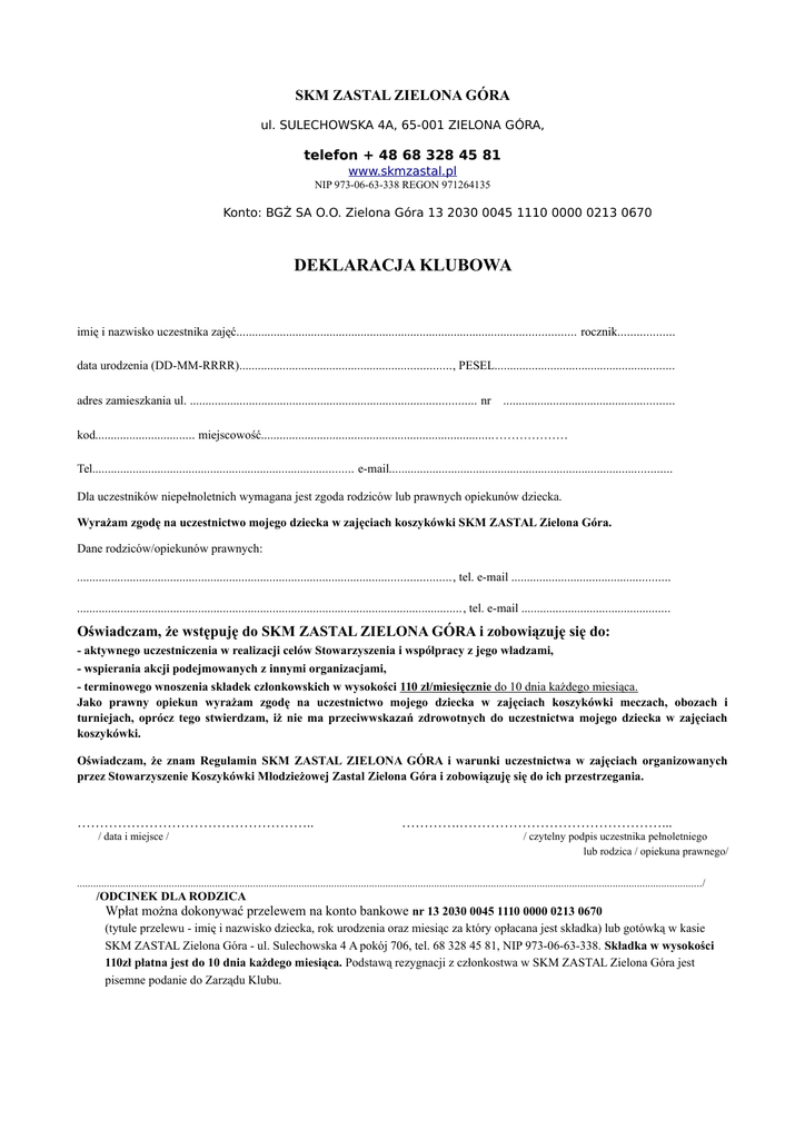 SKM ZASTAL ZIELONA GÓRA ul. SULECHOWSKA 4A, 65-001 ZIELONA GÓRA, telefon + 48 68 328 45 81 www.skmzastal.pl NIP 973-06-63-338 REGON 971264135 Konto: BGŻ SA O.O. Zielona Góra 13 2030 0045 1110 0000 0213 0670 DEKLARACJA KLUBOWA imię i nazwisko uczestnika zajęć............................................................................................................. rocznik.................. data urodzenia (DD-MM-RRRR)...................................................................., PESEL.......................................................... adres zamieszkania ul. ............................................................................................ nr ....................................................... kod................................ miejscowość...........................................................................……………… Tel.................................................................................... e-mail........................................................................................... Dla uczestników niepełnoletnich wymagana jest zgoda rodziców lub prawnych opiekunów dziecka. Wyrażam zgodę na uczestnictwo mojego dziecka w zajęciach koszykówki SKM ZASTAL Zielona Góra. Dane rodziców/opiekunów prawnych: ........................................................................................................................, tel. e-mail ................................................... ............................................................................................................................, tel. e-mail ................................................ Oświadczam, że wstępuję do SKM ZASTAL ZIELONA GÓRA i zobowiązuję się do: - aktywnego uczestniczenia w realizacji celów Stowarzyszenia i współpracy z jego władzami, - wspierania akcji podejmowanych z innymi organizacjami, - terminowego wnoszenia składek członkowskich w wysokości 110 zł/miesięcznie do 10 dnia każdego miesiąca. Jako prawny opiekun wyrażam zgodę na uczestnictwo mojego dziecka w zajęciach koszykówki meczach, obozach i turniejach, oprócz tego stwierdzam, iż nie ma przeciwwskazań zdrowotnych do uczestnictwa mojego dziecka w zajęciach koszykówki. Oświadczam, że znam Regulamin SKM ZASTAL ZIELONA GÓRA i warunki uczestnictwa w zajęciach organizowanych przez Stowarzyszenie Koszykówki Młodzieżowej Zastal Zielona Góra i zobowiązuję się do ich przestrzegania. …………………………………………….. / data i miejsce / ………….………………………………………... / czytelny podpis uczestnika pełnoletniego lub rodzica / opiekuna prawnego/ ......................................................................................................................................................................................................................................./ /ODCINEK DLA RODZICA Wpłat można dokonywać przelewem na konto bankowe nr 13 2030 0045 1110 0000 0213 0670 (tytule przelewu - imię i nazwisko dziecka, rok urodzenia oraz miesiąc za który opłacana jest składka) lub gotówką w kasie SKM ZASTAL Zielona Góra - ul. Sulechowska 4 A pokój 706, tel. 68 328 45 81, NIP 973-06-63-338. Składka w wysokości 110zł płatna jest do 10 dnia każdego miesiąca. Podstawą rezygnacji z członkostwa w SKM ZASTAL Zielona Góra jest pisemne podanie do Zarządu Klubu.