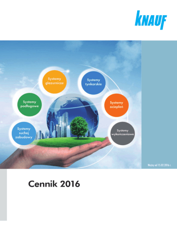 Ważny od 15.02.2016 r. Cennik 2016 Biuro Knauf w Internecie: Knauf Sp. z o.o. ul. Światowa 25, 02-229 Warszawa tel. 22 36 95 100, fax 22 36 95 102 www.knauf.pl www.knaufmag.pl Dział Techniczny tel. 22 36 95 199 Dział Obsługi Klienta tel. 22 36 95 200 Dział Marketingu tel. 22 36 95 104 Składaj zamówienia w Internecie na www.e.knauf.pl DOLNOŚLĄSKIE Media społecznościowe: /knaufpolska /knauf_pl Knauf Budowa i Remont Knauf Budowa i Remont ŁÓDZKIE Kierownik Regionalny tel. 661 300 899 Kierownik Regionalny tel. 601 394 140 Przedstawiciel Handlowy tel. 601 394 141 Przedstawiciel Handlowy tel. 695 151 128 Doradcy Techniczni: Doradcy Techniczni: Sucha Zabudowa tel. 695 151 129 Systemy Tynkarskie, Sucha Zabudowa tel. 605 324 690 Systemy Tynkarskie, Systemy Podłogowe tel. 601 394 155 Systemy Ociepleń, Systemy Glazurnicze tel. 691 990 994 Systemy Ociepleń, Systemy Glazurnicze tel. 691 501 482 MAŁOPOLSKIE KUJAWSKO-POMORSKIE Kierownik Regionalny tel. 601 394 149 tel. 601 310 793 Kierownik Regionalny tel. 601 394 152 Przedstawiciel Handlowy Przedstawiciel Handlowy tel. 601 394 152 Doradcy Techniczni: Doradcy Techniczni: Sucha Zabudowa, Systemy Tynkarskie Systemy Ociepleń, Systemy Podłogowe, Systemy Glazurnicze Sucha Zabudowa tel. 725 998 662 tel. 603 196 529 Kierownik Regionalny tel. 601 394 140 Przedstawiciel Handlowy tel. 693 839 485 Doradca Techniczny tel. 693 839 485 LUBUSKIE Przedstawiciel Handlowy Systemy Tynkarskie, Systemy Podłogowe tel. 695 151 127 Systemy Ociepleń, Systemy Glazurnicze tel. 695 927 758 MAZOWIECKIE LUBELSKIE Kierownik Regionalny tel. 601 310 793 Kierownik Regionalny tel. 609 997 601 Przedstawiciel Handlowy tel. 601 394 160 Doradcy Techniczni: Systemy Podłogowe tel. 693 289 285 Systemy Tynkarskie tel. 693 307 424 Sucha Zabudowa tel. 601 964 633 tel. 601 964 637 tel. 695 151 170 Doradcy Techniczni: Sucha Zabudowa tel. 601 302 795 Systemy Tynkarskie tel. 605 324 697 Systemy Ociepleń tel. 601 290 817 Systemy Podłogowe tel. 601 302 795 OPOLSKIE Kierownik Regionalny tel. 661 300 899 Przedstawiciel Handlowy tel. 601 394 156 Doradcy Techniczni: Systemy Tynkarskie, Systemy Podłogowe tel. 605 324 698 Sucha Zabudowa tel. 693 307 423 Systemy Ociepleń, Systemy glazurnicze tel. 603 196 531 PRODUKT MANAGER TELEFON Systemy Tynkarskie 695 150 135 Specjalista ds. Systemu AQUAPANEL 601 394 153 Systemy Podłogowe 601 964 634 Specjalista ds. Systemów Akustycznych 605 394 142 Systemy Ociepleń 603 196 530 Specjalista ds. Systemów Przeciwpożarowych 605 324 695 Systemy Glazurnicze 601 394 158 Specjalista ds. Izolacyjności Cieplnej 693 345 897 Systemy Wykończeniowe 601 618 216 PODKARPACKIE DZIAŁ INWESTYCJI TELEFON ® WARMIŃSKO-MAZURSKIE Kierownik Regionalny tel. 601 394 149 Kierownik Regionalny tel. 601 394 152 Przedstawiciel Handlowy tel. 665 918 859 Przedstawiciel Handlowy tel. 601 964 636 Doradca Techniczny tel. 661 300 899 Doradcy Techniczni: PODLASKIE Kierownik Regionalny tel. 609 997 601 Przedstawiciel Handlowy/Doradca Techniczny tel. 601 290 431 Przedstawiciel Handlowy/Doradca Techniczny tel. 601 394 159 POMORSKIE Kierownik Regionalny tel. 601 394 152 Przedstawiciel Handlowy tel. 693 303 282 Doradcy Techniczni: Sucha Zabudowa tel. 693 303 282 Systemy Tynkarskie tel. 601 394 148 Sucha Zabudowa, Systemy Tynkarskie tel. 601 964 636 Systemy Ociepleń, Systemy Podłogowe, Systemy Glazurnicze tel. 603 196 529 WIELKOPOLSKIE Kierownik Regionalny tel. 601 964 637 Przedstawiciel Handlowy tel. 601 394 139 Doradcy Techniczni: Sucha Zabudowa, AQUAPANEL® tel. 693 307 427 Systemy Tynkarskie tel. 601 162 148 Systemy Podłogowe tel. 693 307 454 Systemy Ociepleń tel. 693 307 454 ZACHODNIO-POMORSKIE ŚLĄSKIE Kierownik Regionalny tel. 661 300 899 Przedstawiciel Handlowy tel. 601 394 156 Doradcy Techniczni: Systemy Tynkarskie, Systemy Podłogowe tel. 605 324 698 Sucha Zabudowa tel. 693 307 423 Systemy Ociepleń, Systemy Glazurnicze tel. 691 505 545 Kierownik Regionalny tel. 601 964 637 Przedstawiciel Handlowy tel. 601 964 637 Doradcy Techniczni: Sucha Zabudowa tel. 601 964 637 Systemy Tynkarskie tel. 605 324 697 Systemy Ociepleń tel. 601 290 817 Systemy Podłogowe tel. 601 302 795 ŚWIĘTOKRZYSKIE Kierownik Regionalny tel. 601 394 149 Przedstawiciel Handlowy tel. 601 310 793 Doradcy Techniczni: Systemy Tynkarskie, Systemy Podłogowe tel. 695 151 127 Systemy Glazurnicze tel. 695 927 758 Sucha Zabudowa tel. 601 310 793 OR_1 DAJEMY CI SYSTEMOWE ROZWIĄZANIA 2 SPIS TREŚCI SYSTEMY TYNKARSKIE 5 SYSTEMY PODŁOGOWE TYNKI GIPSOWE 8 WYLEWKI ANHYDRYTOWE 98 Tynki gipsowe ręczne 8 Tynki gipsowe maszynowe 9 WYLEWKI CEMENTOWE 99 ŚRODKI GRUNTUJĄCE DO WYLEWEK 101 DODATKI DO WYLEWEK 103 SUCHE JASTRYCHY 106 System BRIO 106 Środki gruntujące TYNKI CEMENTOWE 12 15 95 Tynki cementowo-wapienne 15 Masy szpachlowe cementowo-wapienne 17 Środki gruntujące 18 System Dual Floor 109 AKCESORIA TYNKARSKIE 19 PODŁOGI PODNIESIONE 111 TECHNIKA SILOSOWA 20 System Camillo PL 111 System FHB 114 SYSTEMY SUCHEJ ZABUDOWY 25 PŁYTY GIPSOWO-KARTONOWE 28 SYSTEMY GLAZURNICZE 121 PŁYTY PPOŻ. 32 KLEJE DO GLAZURY 124 PŁYTY AKUSTYCZNE 33 FUGI, SILIKONY, AKRYLE 126 PŁYTY RTG 37 NARZĘDZIA129 MASY SZPACHLOWE I KLEJE DO PŁYT G-K 39 HYDROIZOLACJE 130 ŚRODKI GRUNTUJĄCE 42 ŚRODKI GRUNTUJĄCE 132 PROFILE43 WZORNIK KOLORÓW FUG 134 PROFILE SPECJALISTYCZNE 46 WZORNIK KOLORÓW SILIKONÓW 134 PROFILE Z POWŁOKĄ MAGNELIS 48 NAROŻNIKI 50 AKCESORIA DO NAROŻNIKÓW 51 AKCESORIA MONTAŻOWE 52 SYSTEMY OCIEPLEŃ ZEWNĘTRZNYCH 135 KLEJE I SIATKA 138 TYNKI DEKORACYJNE 139 Taśmy58 FARBY I ŚRODKI CZYSZCZĄCE 146 Wkręty60 WZORNIK TYNKÓW MOZAIKOWYCH 147 Kołki63 WZORNIK KOLORÓW TYNKÓW I FARB CLASSIC'04 148 Wieszaki, łączniki Klapy rewizyjne 52 64 WZORNIK KOLORÓW TYNKÓW I FARB FINESS 152 SYSTEMY WYKOŃCZENIOWE 67 SYSTEM SHEETROCK 70 SZPACHLE I GŁADZIE 74 FARBY I GRUNTY 77 WZORNIK KOLORÓW FARB CLASSIC’04 79 SYSTEMY OCIEPLEŃ WEWNĘTRZNYCH TECTEM 159 CZYSZCZENIE, OCHRONA I PIELĘGNACJA 165 CZYSZCZENIE168 SYSTEMY AQUAPANE