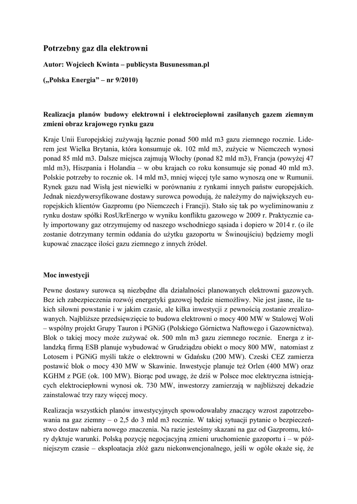 Potrzebny gaz dla elektrowni Autor: Wojciech Kwinta – publicysta Busunessman.pl („Polska Energia” – nr 9/2010) Realizacja planów budowy elektrowni i elektrociepłowni zasilanych gazem ziemnym zmieni obraz krajowego rynku gazu Kraje Unii Europejskiej zużywają łącznie ponad 500 mld m3 gazu ziemnego rocznie. Liderem jest Wielka Brytania, która konsumuje ok. 102 mld m3, zużycie w Niemczech wynosi ponad 85 mld m3. Dalsze miejsca zajmują Włochy (ponad 82 mld m3), Francja (powyżej 47 mld m3), Hiszpania i Holandia – w obu krajach co roku konsumuje się ponad 40 mld m3. Polskie potrzeby to rocznie ok. 14 mld m3, mniej więcej tyle samo wynoszą one w Rumunii. Rynek gazu nad Wisłą jest niewielki w porównaniu z rynkami innych państw europejskich. Jednak niezdywersyfikowane dostawy surowca powodują, że należymy do największych europejskich klientów Gazpromu (po Niemczech i Francji). Stało się tak po wyeliminowaniu z rynku dostaw spółki RosUkrEnergo w wyniku konfliktu gazowego w 2009 r. Praktycznie cały importowany gaz otrzymujemy od naszego wschodniego sąsiada i dopiero w 2014 r. (o ile zostanie dotrzymany termin oddania do użytku gazoportu w Świnoujściu) będziemy mogli kupować znaczące ilości gazu ziemnego z innych źródeł. Moc inwestycji Pewne dostawy surowca są niezbędne dla działalności planowanych elektrowni gazowych. Bez ich zabezpieczenia rozwój energetyki gazowej będzie niemożliwy. Nie jest jasne, ile takich siłowni powstanie i w jakim czasie, ale kilka inwestycji z pewnością zostanie zrealizowanych. Najbliższe przedsięwzięcie to budowa elektrowni o mocy 400 MW w Stalowej Woli – wspólny projekt Grupy Tauron i PGNiG (Polskiego Górnictwa Naftowego i Gazownictwa). Blok o takiej mocy może zużywać ok. 500 mln m3 gazu ziemnego rocznie. Energa z irlandzką firmą ESB planuje wybudować w Grudziądzu obiekt o mocy 800 MW, natomiast z Lotosem i PGNiG myśli także o elektrowni w Gdańsku (200 MW). Czeski CEZ zamierza postawić blok o mocy 430 MW w Skawinie. Inwestycje planuje też Orlen (400 MW) oraz KGHM z PGE (ok. 100 MW). Biorąc pod uwagę, że dziś w Polsce moc elektryczna istniejących elektrociepłowni wynosi ok. 730 MW, inwestorzy zamierzają w najbliższej dekadzie zainstalować trzy razy więcej mocy. Realizacja wszystkich planów inwestycyjnych spowodowałaby znaczący wzrost zapotrzebowania na gaz ziemny – o 2,5 do 3 mld m3 rocznie. W takiej sytuacji pytanie o bezpieczeństwo dostaw nabiera nowego znaczenia. Na razie jesteśmy skazani na gaz od Gazpromu, który dyktuje warunki. Polską pozycję negocjacyjną zmieni uruchomienie gazoportu i – w późniejszym czasie – eksploatacja złóż gazu niekonwencjonalnego, jeśli w ogóle okaże się, że jego wydobycie jest opłacalne, a wydobywane ilości będą miały znaczenie dla rynku. Paradoksalnie, dywersyfikacja źródeł dostaw, która dokona się dzięki gazowi skroplonemu, wcale nie musi przynieść korzyści: cena gazu zakontraktowanego w Katarze jest wyższa od ceny gazu rosyjskiego. A w przypadku energii elektrycznej z gazu ziemnego właśnie cena paliwa jest krytyczna dla opłacalności inwestycji. Po co nam energetyka gazowa? Rozwój energetyki gazowej wynika przede wszystkim z konieczności dostosowania się do unijnych wymogów związanych z ochroną środowiska. Produkcja energii elektrycznej z gazu ziemnego oznacza o 40 proc. niższą emisję CO2 w porównaniu z wytwarzaniem z węgla. Niższa jest też emisja związków azotu, znika problem emisji związków siarki i pyłów. Siłownie gazowe buduje się stosunkowo szybko – blok parowo-gazowy w Stalowej Woli może zostać uruchomiony na przełomie 2012 i 2013 r., a sama budowa dopiero się rozpocznie. Tempo powstawania elektrowni gazowych może okazać się zbawienne w obliczu zagrożenia niedoborami energii elektrycznej za kilka lat. Żadnych innych dużych źródeł energii nie da się w tym czasie zbudować. Wadą wytwarzania elektryczności z gazu ziemnego jest cena, a dokładniej – wysoki udział kosztów paliwa (ok. 70 proc.) w kosztach wytwarzania. Przy zmiennych cenach gazu (w wieloletniej perspektywie – rosnących), cena energii elektrycznej też będzie wzrastać. Z drugiej strony, nieuchronnie zbliżająca się konieczność zakupu pozwoleń na całość emisji CO2 może spowodować, że elektrownie gazowe będą konkurencyjne.