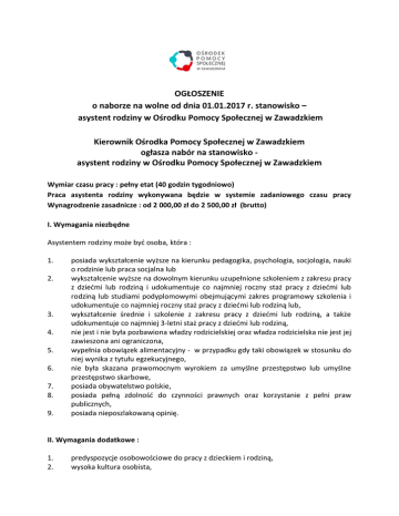 OGŁOSZENIE o naborze na wolne od dnia 01.01.2017 r. stanowisko – asystent rodziny w Ośrodku Pomocy Społecznej w Zawadzkiem Kierownik Ośrodka Pomocy Społecznej w Zawadzkiem ogłasza nabór na stanowisko asystent rodziny w Ośrodku Pomocy Społecznej w Zawadzkiem Wymiar czasu pracy : pełny etat (40 godzin tygodniowo) Praca asystenta rodziny wykonywana będzie w systemie zadaniowego czasu pracy Wynagrodzenie zasadnicze : od 2 000,00 zł do 2 500,00 zł (brutto) I. Wymagania niezbędne Asystentem rodziny może być osoba, która : 1. 2. 3. 4. 5. 6. 7. 8. 9. posiada wykształcenie wyższe na kierunku pedagogika, psychologia, socjologia, nauki o rodzinie lub praca socjalna lub wykształcenie wyższe na dowolnym kierunku uzupełnione szkoleniem z zakresu pracy z dziećmi lub rodziną i udokumentuje co najmniej roczny staż pracy z dziećmi lub rodziną lub studiami podyplomowymi obejmującymi zakres programowy szkolenia i udokumentuje co najmniej roczny staż pracy z dziećmi lub rodziną lub, wykształcenie średnie i szkolenie z zakresu pracy z dziećmi lub rodziną, a także udokumentuje co najmniej 3-letni staż pracy z dziećmi lub rodziną, nie jest i nie była pozbawiona władzy rodzicielskiej oraz władza rodzicielska nie jest jej zawieszona ani ograniczona, wypełnia obowiązek alimentacyjny - w przypadku gdy taki obowiązek w stosunku do niej wynika z tytułu egzekucyjnego, nie była skazana prawomocnym wyrokiem za umyślne przestępstwo lub umyślne przestępstwo skarbowe, posiada obywatelstwo polskie, posiada pełną zdolność do czynności prawnych oraz korzystanie z pełni praw publicznych, posiada nieposzlakowaną opinię. II. Wymagania dodatkowe : 1. 2. predyspozycje osobowościowe do pracy z dzieckiem i rodziną, wysoka kultura osobista, 3. 4. 5. 6. 7. 8. 9. 10. 11. 12. 13. umiejętność obsługi komputera (programy pakietów biurowych MS Office lub Open Office – arkusz kalkulacyjny i edytor tekstów), posiadanie czynnego prawa jazdy kat. B, umiejętność prowadzenia zaplanowanej i celowej pracy z klientem, w szczególności z klientem wieloproblemowym (najlepiej w formie udokumentowanego doświadczenia zawodowego), umiejętność nawiązywania i prowadzenia owocnej współpracy z innymi jednostkami i instytucjami, zdolność do podejmowania szybkich i odpowiedzialnych decyzji, bardzo dobre umiejętności komunikacyjne i interpersonalne, poczucie odpowiedzialności za swoją pracę i dalsze losy klientów, samodzielność w działaniu oraz wykazywanie własnej inicjatywy, umiejętność zachowania bezstronności w kontakcie z rodziną, kreatywność, odporność na stres, znajomość następujących aktów prawnych: ustawa z dnia 9 czerwca 2011 r. o wspieraniu rodziny i systemie pieczy zastępczej (tj. Dz. U. z 2016 r. poz. 575 ) ustawa z dnia 12 marca 2004 r. o pomocy społecznej (tj. Dz. U. z 2016 r. poz. 930) ustawa z dnia 25 lutego 1964 r. Kodeks rodzinny i opiekuńczy (tj. Dz. U. z 2015 r. poz. 2082) III. Osoba zatrudniona na stanowisku asystenta rodziny będzie wykonywała między innymi niżej wymienione zadania : Zakres wykonywanych zadań na stanowisku : 1. 2. 3. 4. 5. 6. 7. 8. 9. 10. opracowanie i realizacja planu pracy z rodziną we współpracy z członkami rodziny i konsultacji z pracownikiem socjalnym, opracowanie we współpracy z członkami rodziny i koordynatorem rodzinnej pieczy zastępczej planu pracy, który jest skoordynowany z planem pomocy dziecku umieszczonemu w pieczy zastępczej, udzielanie pomocy rodzinom w poprawie ich sytuacji życiowej, w tym w zdobywaniu umiejętności prawidłowego prowadzenia gospodarstwa domowego, udzielanie pomocy rodzinom w rozwiązywaniu problemów socjalnych, psychologicznych, zdrowotnych i wsparcie w rozwiązywaniu problemów wychowawczych z dziećmi, wspieranie i inicjowanie aktywności społecznej rodzin, motywowanie członków rodzin do podnoszenia kwalifikacji zawodowych oraz uzupełniania wykształcenia, udzielanie pomocy w poszukiwaniu, podejmowaniu i utrzymaniu pracy zarobkowej, motywowanie do udziału w zajęciach grupowych dla rodziców, mających na celu kształtowanie prawidłowych wzorców rodzicielskich i umiejętności psychospołecznych, podejmowanie działań interwencyjnych i zaradczych w sytuacji zagrożenia bezpieczeństwa dzieci i rodzin, zwłaszcza w razie stwierdzenia przemocy w rodzinie, prowadzenie indywidualnych konsultacji wychowawczych dla rodziców i dzieci, 11. 12. 13. 14. 15. 16. prowadzenie dokumentacji dotyczącej pracy z rodziną, dokonywanie okresowej oceny sytuacji rodziny, nie rzadziej niż co pół roku, monitorowanie funkcjonowania rodziny po zakończeniu pracy z rodziną, sporządzanie na wniosek sądu opinii o rodzinie i jej członkach, współpraca z jednostkami administracji rządowej i samorządowej, właściwymi organizacjami pozarządowymi oraz innymi podmiotami i osobami specjalizującymi się w działaniach na rzecz dziecka i rodziny, współpraca z zespołem interdyscyplinarnym lub grupą roboczą lub innymi podmiotami, których pomoc przy wykonywaniu zadań uzna się za niezbędną. Szczegółowe zadania wykonywane na stanowisku asystenta rodziny zostaną określone w zakresie czynności. Zadania asystent rodziny realizuje w dniach i godzinach ustalonych z rodzinami – w tym w weekendy oraz godziny popołudniowe i wieczorne. IV. Dokumenty aplikacyjne 1. 2. 3. 4. 5. 6. 7. a) b) c) d) życiorys (CV) z dokładnym opisem przebiegu pracy zawodowej, list motywacyjny, kopie dokumentów potwierdzających posiadane kwalifikacje i wykształcenie, kopie świadectw pracy, kopie zaświadczeń o ukończonych kursach, szkoleniach, kwestionariusz osobowy dla osoby ubiegającej się o zatrudnienie kwestionariusza stanowi załącznik do ogłoszenia) oświadczenia kandydata (stanowiące załącznik do ogłoszenia): (wzór o wyrażeniu zgody na przetwarzanie danych osobowych do celów rekrutacji, o posiadaniu pełnej zdolności do czynności prawnych oraz o korzystaniu z pełni pr
