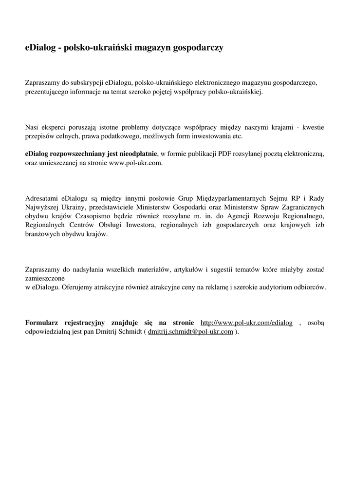 eDialog - polsko-ukraiński magazyn gospodarczy Zapraszamy do subskrypcji eDialogu, polsko-ukraińskiego elektronicznego magazynu gospodarczego, prezentującego informacje na temat szeroko pojętej współpracy polsko-ukraińskiej. Nasi eksperci poruszają istotne problemy dotyczące współpracy między naszymi krajami - kwestie przepisów celnych, prawa podatkowego, możliwych form inwestowania etc. eDialog rozpowszechniany jest nieodpłatnie, w formie publikacji PDF rozsyłanej pocztą elektroniczną, oraz umieszczanej na stronie www.pol-ukr.com. Adresatami eDialogu są między innymi posłowie Grup Międzyparlamentarnych Sejmu RP i Rady Najwyższej Ukrainy, przedstawiciele Ministerstw Gospodarki oraz Ministerstw Spraw Zagranicznych obydwu krajów Czasopismo będzie również rozsyłane m. in. do Agencji Rozwoju Regionalnego, Regionalnych Centrów Obsługi Inwestora, regionalnych izb gospodarczych oraz krajowych izb branżowych obydwu krajów. Zapraszamy do nadsyłania wszelkich materiałów, artykułów i sugestii tematów które miałyby zostać zamieszczone w eDialogu. Oferujemy atrakcyjne również atrakcyjne ceny na reklamę i szerokie audytorium odbiorców. Formularz rejestracyjny znajduje się na stronie http://www.pol-ukr.com/edialog , osobą odpowiedzialną jest pan Dmitrij Schmidt ( [email protected] ). Powered by TCPDF (www.tcpdf.org)