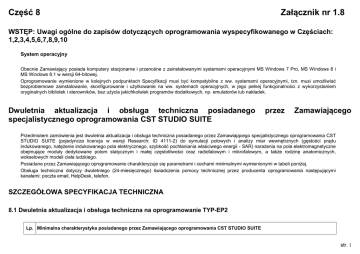 Część 8 Załącznik nr 1.8 WSTĘP: Uwagi ogólne do zapisów dotyczących oprogramowania wyspecyfikowanego w Częściach: 1,2,3,4,5,6,7,8,9,10 System operacyjny Obecnie Zamawiający posiada komputery stacjonarne i przenośne z zainstalowanymi systemami operacyjnymi MS Windows 7 Pro, MS Windows 8 i MS Windows 8.1 w wersji 64-bitowej. Oprogramowanie wymienione w kolejnych podpunktach Specyfikacji musi być kompatybilne z ww. systemami operacyjnymi, tzn. musi umożliwiać bezproblemowe zainstalowanie, skonfigurowanie i użytkowanie na ww. systemach operacyjnych, w jego pełnej funkcjonalności z wykorzystaniem oryginalnych bibliotek i sterowników, bez użycia jakichkolwiek programów dodatkowych, np. emulatorów lub nakładek. Dwuletnia aktualizacja i obsługa techniczna posiadanego specjalistycznego oprogramowania CST STUDIO SUITE przez Zamawiającego Przedmiotem zamówienia jest dwuletnia aktualizacja i obsługa techniczna posiadanego przez Zamawiającego specjalistycznego oprogramowania CST STUDIO SUITE (pojedyncza licencja w wersji Research: ID 4111-2) do symulacji polowych i analizy miar wewnętrznych (gęstości prądu indukowanego, natężenie indukowanego pola elektrycznego, szybkość pochłaniania właściwego energii - SAR) narażenia na pola elektromagnetyczne obejmujące moduły dedykowane polom statycznym i małej częstotliwości oraz radiofalowym i mikrofalowym, a także rodzinę anatomicznych, wokselowych modeli ciała ludzkiego. Posiadane przez Zamawiającego oprogramowanie charakteryzuje się parametrami i cechami minimalnymi wymienionymi w tabeli poniżej. Obsługa techniczna dotyczy dwuletniego (24-miesięcznego) świadczenia pomocy technicznej przez producenta oprogramowania następującymi kanałami: poczta email, HelpDesk, telefon. SZCZEGÓŁOWA SPECYFIKACJA TECHNICZNA 8.1 Dwuletnia aktualizacja i obsługa techniczna na oprogramowanie TYP-EP2 Lp. Minimalna charakterystyka posiadanego przez Zamawiającego oprogramowania CST STUDIO SUITE str. 1 1 2 Oprogramowanie będące narzędziem do symulacji polowych i analizy miar wewnętrznych ekspozycji narażenia na pole elektromagnetyczne z zakresu od pól statycznych przez pola małej i średniej częstotliwości po mikrofale, działające na platformie Windows (MS Windows 7 Pro, MS Windows 8 i MS Windows 8.1), zainstalowanej i użytkowanej przez Zamawiającego na komputerach stacjonarnych, Oprogramowanie pozwalające na realizację wszystkich trzech etapów symulacji polowych: preprocessing, processing (symulacje właściwe) i postprocessing Etap preprocessingu obejmujący: - graficzny interfejs umożliwiający tworzenie złożonych obiektów 3D reprezentujących geometrię źródła pola elektromagnetycznego i elementów otoczenia, boolowskie operacje na obiektach, funkcje zawansowanego modelowania takie jak: zaokrąglania krawędzi, skalowania obiektów, przesuwania, obracania, tworzenia obiektów z wykorzystaniem krzywych - archiwizację historii tworzenia obiektów pozwalającą na cofanie i ponawianie modyfikacji parametrów analizowanego zadania - import i export modeli zapisanych w formatach: SAT/SAB, STL, OBJ oraz import modeli w formacie wokselowym (ang. Voxel Data) - narzędzia naprawcze zaimportowanych modeli wirtualnych, takie jak: usuwanie braku ciągłości importowanych modeli powstałych na skutek różnic w dokładności odwzorowywania obiektów utworzonych w różnych oprogramowaniach i oprogramowaniu będącym przedmiotem zamówienia - interfejs umożliwiający definiowanie warunków brzegowych elektrycznych, magnetycznych otwartych oraz dodatkowo dla radiofal i mikrofal – przewodzącej ściany i periodycznych, a także definiowanie płaszczyzn symetrii umożliwiających symulacje dla zagadnień symetrycznych 3 - technologię umożliwiającą dokładniejszą dyskretyzację (siatkę) obiektów o zakrzywionych powierzchniach jak np. Perfect Boundary Approximation (PBA) - technologię umożliwiającą symulacje dla cienkich obiektów metalowych takich jak obudowy (umożliwiającą występowanie 2 obszarów w otoczeniu materiału przewodzącego w jednym elemencie dyskretyzacji) jak np. Thin Sheet Technology (TST - technologię umożliwiającą zastosowanie gęstszej siatki tylko w obszarze zainteresowania takim jak np. model ciała ludzkiego, co najmniej w zakresie symulacji dotyczących pól radiofalowych i mikrofalowych jak np. Multilevel Subgriding Scheme (MSS) - automatyczną generację siatki, technologię adaptacyjnej generacji siatki z możliwością lokalnej zmiany jej parametrów - co najmniej predefiniowane matematyczne modele źródeł pola elektromagnetycznego: potencjał elektryczny (ang. electric potential), port prądowy (ang. current port), zwój (ang. coil), źródło pola magnetycznego (ang. magnetic source field) dla pól statycznych, małej i średniej częstotliwości oraz port dyskretny (ang. discrete port), fala płaska (ang. plane wave), element skupiony (ang. lumped element) dla radiofal i mikrofal - interfejs umożliwiający tworzenie własnych funkcji użytkownika z zastosowaniem środowiska programistycznego jak np. Visual Basic for Applications (VBA) - interfejs umożliwiający parametryzację obiektów jak i parametrów źródła pola elektromagnetycznego Etap processingu obejmujący: 4 - symulacje zarówno w dziedzinie czasu jak i częstotliwości - symulacje rozkładu temperatury wewnątrz modelu ciała ludzkiego eksponowanego na pola radiofalowe i mikrofalowe (uwzględniający biologiczne mechanizmy ogrzewania/chłodzenia takie jak perfuzja krwi i tempo przemiany materii) str. 2 - wykorzystanie algorytmów techniki całek brzegowych (ang. Finite Integration Technique - FIT) - symulacje elementów trójwymiarowych - symulacje zarówno dla siatki czworościennej i sześciobocznej w przypadku pól statycznych oraz małej i średniej częstotliwości Etap postprocessingu obejmujący: - określenie wartości charakteryzujących pole elektromagnetyczne w wybranych punktach, wy