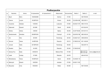 Podkarpackie Lp. Nazwisko Imiona Nr Uprawnienia Nr Uprawnienia 2 Miejscowość Kod pocztowy Telefon 1 Telefon 2 1 Bącal Maria 10-BOS/2008 Sośnica 37-555 2 Cwenar Lucyna 183-BPiO/01 Krosno 38-400 (13) 436 44 98 502 02 93 11 3 Czubocha Zdzisław 13-BO/94 Lubaczów 37-600 (16) 632 15 75 606 41 91 64 4 Dąbrowski Ryszard 82-N/99 Sanok 38-500 5 Derbisz Helena 3-BO/00 Dębica 39-200 (14) 677 66 85 601 95 19 13 6 Gembarzewski Stanisław 208-BPiO/04 Przemyśl 37-700 (16) 678 27 86 606 34 63 30 7 Gul Alina 59-N/94 Tarnobrzeg 39-400 (15) 822 18 21 509 82 90 92 8 Henczel Teresa 24-BPiO/93 Rzeszów 35-513 (17) 863 53 24 601 14 64 69 9 Jurczak Otylia 207-BPiO/03 Tarnobrzeg 39-400 44-N/93 Rzeszów 35-040 4-BO/2014 Stalowa Wola 37-450 e-mail 502 78 93 66 601 92 24 93 502 20 67 16 10 Kawalec Ewa (17) 854 29 45 11 Korkosz-Fus Edyta 12 Lasek Andrzej 37-N/93 Rzeszów 35-078 13 Miśniakiewicz Teresa 190-BPiO/01 Sanok 38-500 (13) 463 81 10 14 Mokrzycki Edward 16-BO/94 Jarosław 37-500 (16) 621 13 93 15 Muzyczka Anna 55-BO/00 Mielec 39-300 609 13 07 70 609 13 07 80 604 46 16 03 604 72 93 86 [email protected] 16 Olszewski Leszek 191-BPiO/01 Sanok 38-500 (13) 464 89 60 500 13 59 41 (17) 871 3232 501 22 29 94 [email protected] 609-54-19-63 [email protected] 17 Proszak Elżbieta 4-BO/2007 Rzeszów 35-083 18 Rabiński Wiesław 2-BO/2012 Nisko 37-400 19 Staszkiewicz Barbara 198-BPiO/01 Dukla 38-450 (13) 433 00 51 20 Szymonik Stanisława 168-BPiO/00 Nisko 37-400 (15) 841 30 93 21 Tarczyński Andrzej 2-N/2011 Stalowa Wola 37-450 (15) 844 32 60 604 20 23 50 22 Tobiasz Wacław 58-BPiO/94 Iwierzyce 39-124 (17) 222 10 48 601 33 93 41 23 Trojanowska Maria 63-N/94 Tarnobrzeg 39-400 (15) 822 77 79 604 97 18 67 24 Włudzik Michał 6-BO/2014 Jasło 38-200 504 25 16 20 794 40 66 69 [email protected]