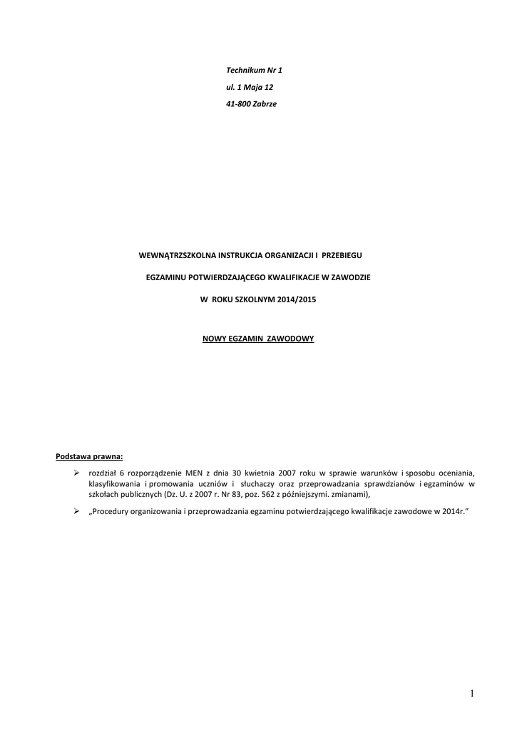 Technikum Nr 1 ul. 1 Maja 12 41-800 Zabrze WEWNĄTRZSZKOLNA INSTRUKCJA ORGANIZACJI I PRZEBIEGU EGZAMINU POTWIERDZAJĄCEGO KWALIFIKACJE W ZAWODZIE W ROKU SZKOLNYM 2014/2015 NOWY EGZAMIN ZAWODOWY Podstawa prawna: rozdział 6 rozporządzenie MEN z dnia 30 kwietnia 2007 roku w sprawie warunków i sposobu oceniania, klasyfikowania i promowania uczniów i słuchaczy oraz przeprowadzania sprawdzianów i egzaminów w szkołach publicznych (Dz. U. z 2007 r. Nr 83, poz. 562 z późniejszymi. zmianami), „Procedury organizowania i przeprowadzania egzaminu potwierdzającego kwalifikacje zawodowe w 2014r.” 1 SPIS TREŚCI I. Informacje ogólne o egzaminie potwierdzającym kwalifikacje zawodowe 3 II. Instrukcja postępowania z niejawnymi materiałami egzaminacyjnymi 4 III. Zasady obiegu informacji (nauczyciele, uczniowie, rodzice) 4 IV. Warunki, miejsce i termin przeprowadzania egzaminu zawodowego 5 V. Dostosowanie warunków i formy przeprowadzania egzaminu zawodowego 5 VI. Harmonogram prac dotyczących egzaminu potwierdzającego kwalifikacje zawodowe w sesji zimowej i letniej 2015r. 6 VII. Organizacja i przebieg części pisemnej egzaminu zawodowego 7 VIII. Organizacja i przebieg części praktycznej egzaminu zawodowego 11 IX. Ogłoszenie wyników i wydawanie dyplomów 14 X. Postępowanie w sytuacjach szczególnych 15 2 INFORMACJE O EGZAMINIE POTWIERDZAJĄCYM KWALIFIKACJE W ZAWODZIE 1. Egzamin potwierdzający kwalifikacje w zawodzie: jest formą oceny poziomu opanowania przez zdającego wiedzy i umiejętności z zakresu danej kwalifikacji wyodrębnionej w zawodzie, ustalonych w podstawie programowej kształcenia w zawodach. umożliwia uzyskanie dyplomu potwierdzającego kwalifikacje zawodowe lub świadectwa potwierdzającego kwalifikację w zawodzie, jeżeli został przeprowadzony w zakresie jednej kwalifikacji. jest przeprowadzany na podstawie wymagao określonych w podstawie programowej kształcenia w zawodzie technik informatyk będzie obejmował zakresem tematycznym daną kwalifikację, w zawodzie technik informatyk wyodrębniono w podstawie programowej - trzy kwalifikacje. 2. Egzamin zawodowy jest przeprowadzany w roku szkolnym 2014/2015 dla uczniów technikum kształcących się w zawodzie technik informatyk, z kwalifikacji E.12- Montaż i eksploatacja komputerów osobistych oraz urządzeo peryferyjnych oraz E.13- Projektowanie lokalnych sieci komputerowych i administrowanie sieciami. 3. Egzamin zawodowy może byd przeprowadzany w ciągu całego roku szkolnego w terminie ustalonym przez dyrektora komisji okręgowej, w uzgodnieniu z dyrektorem Centralnej Komisji Egzaminacyjnej. 4. Termin egzaminu zawodowego dyrektor komisji okręgowej ogłasza na stronie internetowej OKE nie później niż na 5 miesięcy przed ustaloną z dyrektorem Komisji Centralnej datą rozpoczęcia egzaminu. 6. Egzamin zawodowy składa się z części pisemnej i części praktycznej. Częśd pisemna jest przeprowadzana w formie testu pisemnego z wykorzystaniem wydrukowanych arkuszy egzaminacyjnych i kart odpowiedzi. Częśd praktyczna jest przeprowadzana w formie zadao praktycznych, którego rezultatem koocowym wykonania zadania jest wykonanie praktyczne danych poleceo. ZGŁASZANIE SIĘ KANDYDATÓW DO EGZAMINU 1. Uczeo, zamierzający przystąpid do egzaminu zawodowego, składa pisemną deklarację dotyczącą przystąpienia do egzaminu zawodowego – (Zał.1 do procedury OKE), tj. do 08.09.2014r.(sesja zimowa) lub do 25.01.2015(sesja letnia) 2. Deklarację należy złożyd nie później niż na 4 miesiące przed ogłoszoną przez dyrektora OKE datą rozpoczęcia egzaminu zawodowego. Uczeo składa deklarację dyrektorowi szkoły. 3. Jeśli osoba składająca deklarację przystąpienia do egzaminu zawodowego posiada opinię poradni psychologicznopedagogicznej, w tym poradni specjalistycznej o specyficznych trudnościach w uczeniu się lub orzeczenie o potrzebie kształcenia specjalnego albo indywidualnego nauczania, lub zaświadczenie lekarskie o stanie zdrowia, które mogą byd podstawą przystąpienia do egzaminu w warunkach dostosowanych do indywidualnych potrzeb zdającego, to osoba ta dołącza tę opinię, orzeczenie lub zaświadczenie do składanej deklaracji. DOSTOSOWANIE WARUNKÓW I FORMY EGZAMINU ZAWODOWEGO DLA OSÓB ZE SPECJALNYMI POTRZEBAMI EDUKACYJNYMI 1. Na podstawie posiadanego orzeczenia o potrzebie indywidualnego nauczania / orzeczenia o potrzebie kształcenia specjalnego /opinii poradni psychologiczno-pedagogicznej, w tym poradni specjalistycznej, o specyficznych trudnościach w uczeniu się / zaświadczenia lekarskiego o stanie zdrowia / pozytywnej opinii rady pedagogicznej, zdający ze specjalnymi potrzebami edukacyjnymi może przystąpid do egzaminu zawodowego w warunkach i formie dostosowanych do jego indywidualnych potrzeb edukacyjnych / możliwości psychofizycznych oraz stanu zdrowia. 2. Uczniowie niepełnosprawni przystępują do egzaminu potwierdzającego kwalifikacje w zawodzie, w warunkach i formie dostosowanych do rodzaju niepełnosprawności, a uczniowie lub absolwenci niedostosowani społecznie lub zagrożeni niedostosowaniem społecznym – w warunkach dostosowanych do indywidualnych potrzeb rozwojowych i edukacyjnych oraz możliwości psychofizycznych, na podstawie orzeczenia o potrzebie kształcenia specjalnego. 3. Dyrektor Komisji Centralnej opracowuje szczegółową informację o sposobach dostosowania warunków i formy przeprowadzania egzaminu zawodowego do indywidualnych potrzeb i możliwości psychofizycznych zdających i podaje ją publicznej wiadomości w na stronie internetowej Komisji Centralnej nie później niż do dnia 1 września roku szkolnego, w którym jest przeprowadzany egzamin zawodowy. 4. Sposoby dostosowania warunków przeprowadzania egzaminu zawodowego do potrzeb i możliwości uczniów wskazuje rada pedagogiczna, spośród możliwych sposobów dostosowania warunków przeprowadzania egzaminu zawodowego, określonych w szczegółowej informacji Dyrektora CKE. 3 5. Spos