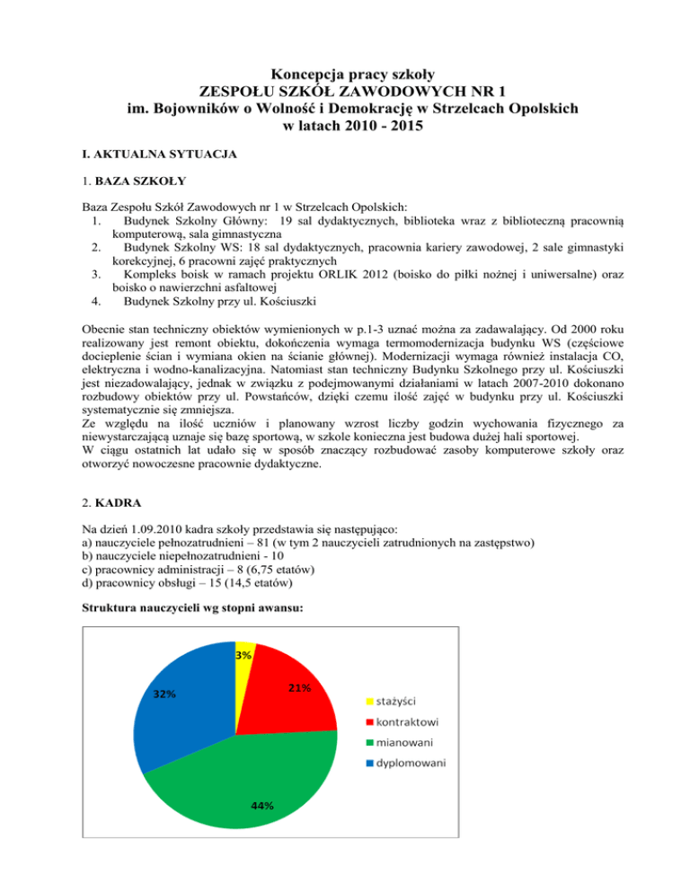 Koncepcja pracy szkoły ZESPOŁU SZKÓŁ ZAWODOWYCH NR 1 im. Bojowników o Wolność i Demokrację w Strzelcach Opolskich w latach 2010 - 2015 I. AKTUALNA SYTUACJA 1. BAZA SZKOŁY Baza Zespołu Szkół Zawodowych nr 1 w Strzelcach Opolskich: 1. Budynek Szkolny Główny: 19 sal dydaktycznych, biblioteka wraz z biblioteczną pracownią komputerową, sala gimnastyczna 2. Budynek Szkolny WS: 18 sal dydaktycznych, pracownia kariery zawodowej, 2 sale gimnastyki korekcyjnej, 6 pracowni zajęć praktycznych 3. Kompleks boisk w ramach projektu ORLIK 2012 (boisko do piłki nożnej i uniwersalne) oraz boisko o nawierzchni asfaltowej 4. Budynek Szkolny przy ul. Kościuszki Obecnie stan techniczny obiektów wymienionych w p.1-3 uznać można za zadawalający. Od 2000 roku realizowany jest remont obiektu, dokończenia wymaga termomodernizacja budynku WS (częściowe docieplenie ścian i wymiana okien na ścianie głównej). Modernizacji wymaga również instalacja CO, elektryczna i wodno-kanalizacyjna. Natomiast stan techniczny Budynku Szkolnego przy ul. Kościuszki jest niezadowalający, jednak w związku z podejmowanymi działaniami w latach 2007-2010 dokonano rozbudowy obiektów przy ul. Powstańców, dzięki czemu ilość zajęć w budynku przy ul. Kościuszki systematycznie się zmniejsza. Ze względu na ilość uczniów i planowany wzrost liczby godzin wychowania fizycznego za niewystarczającą uznaje się bazę sportową, w szkole konieczna jest budowa dużej hali sportowej. W ciągu ostatnich lat udało się w sposób znaczący rozbudować zasoby komputerowe szkoły oraz otworzyć nowoczesne pracownie dydaktyczne. 2. KADRA Na dzień 1.09.2010 kadra szkoły przedstawia się następująco: a) nauczyciele pełnozatrudnieni – 81 (w tym 2 nauczycieli zatrudnionych na zastępstwo) b) nauczyciele niepełnozatrudnieni - 10 c) pracownicy administracji – 8 (6,75 etatów) d) pracownicy obsługi – 15 (14,5 etatów) Struktura nauczycieli wg stopni awansu: 3. SYTUACJA DYDAKTYCZNO-WYCHOWAWCZO-OPIEKUŃCZA Podkreślić należy występujący w szkolnictwie niż demograficzny. W Powiecie Strzeleckim liczba urodzonych w ostatnich 15 latach liczba dzieci zmniejszyła się o około 50% (na żółto zaznaczony rocznik uczniów w kl.I w r.szk.2010/2011) Rok 1989 1990 1991 1992 1993 Izbicko Jemielnica 106 105 85 114 85 110 68 104 80 96 Gmina Kolonowskie Leśnica 102 128 106 154 82 146 71 119 72 111 Strzelce Op. Ujazd Zawadzkie 494 111 202 508 103 208 446 91 202 434 92 156 386 88 156 Powiat 1248 1278 1162 1044 989 1994 60 100 71 110 391 74 149 955 1995 1996 1997 1998 1999 2000 2001 2002 2003 58 52 43 62 51 39 48 44 34 94 70 75 83 76 79 64 62 64 53 51 49 46 52 44 55 53 38 95 90 68 95 82 78 63 72 65 338 373 345 314 325 295 275 273 249 86 69 72 68 68 85 47 65 47 107 149 110 115 110 118 104 88 93 831 854 762 783 764 738 656 657 590 2004 44 51 29 55 261 45 94 579 2005 48 48 53 61 269 57 89 625 2006 2007 37 37 47 44 42 49 61 63 286 286 40 58 89 77 602 614 Liczba urodzeń w Powiecie Strzeleckim na przestrzeni ostatnich lat W szkole liczba uczniów w latach 2005 - 2010 spadła o 186 osób (12,6 %). Liczba uczniów Zespołu Szkół Zawodowych nr 1 na przestrzeni ostatnich lat Liczba uczniów poszczególnych szkół w zespole na przestrzeni ostatnich lat Liczba klas Zespołu Szkół Zawodowych nr 1 na przestrzeni ostatnich lat W roku szkolnym 2010/2011 do szkoły uczęszcza łącznie 1286 uczniów, w tym: a) w technikum technik agrobiznesu technik ekonomista technik elektronik technik elektryk technik handlowiec technik mechanik technik mechatronik technik obsługi turystycznej technik organizacji usług gastronomicznych technik spedytor 40 201 15 16 71 83 48 140 154 74 b) w zasadniczej szkole zawodowej: kucharz małej gastronomii sprzedawca stolarz ślusarz mechanik pojazdów samochodowych fryzjer w klasach wielozawodowych 30 78 39 46 61 75 115 Uczniowie szkoły z reguły osiągają wyniki egzaminów zewnętrznych na poziomie wyższym niż krajowe i wojewódzkie: Zdawalność na egzaminie maturalnym w ostatnich latach 2007/2008 kraj woj. szkoła 67% 69% 79,2% Zdawalność 2008/2009 kraj woj. szkoła 70% 75,9% 2009/2010 kraj woj. szkoła 70,0% 77,7% 81,6% Część ustna Język polski 97% 95% 93% Język angielski Język niemiecki 97% 94% 94% 97,1% 97,1% 95,2% 96% 94% 96% 85,2% 98,5% 98,9% 92% 82% 96% 81% 82% 77% 96,8% 95,5% 98,9% 98,4% 81,9% 75% 97,9% 98,4% 94,9% 100,0% 96,4% 98,3% Część pisemna Język polski Język angielski Język niemiecki Geografia Wiedza o społeczeństwie matematyka 92% 83% 88% 90% 87% 80% 88% 87% 92% 91% 90% 84% 93,8% 97,1% 98,1% 86,7% 92,9% 100% 98% 75% 92% 96,9% 86,1% 97,9% 99.5% 91,4% 99,2% 81% 84,2% 85% Zdawalność na egzaminie zawodowym w ostatnich latach wybranych zawodach 2008 Nazwa zawodu okręg woj. Kucharz małej gastr 73,9 67,1 Sprzedawca 82,4 Ślusarz mech. poj. sam. kraj 2009 ZSZ nr 1 2010 ZSZ nr 1 okręg 100 89,6 84,9 82,6 100 92,7 86,6 87,9 100 91,2 87,8 94,0 89,5 91,5 100 89,6 85,5 87,3 92,1 52,6 62,2 61,5 84,4 66,9 75,0 100 85,8 79,6 84,0 77,8 59,3 74,0 100 82,9 65,7 73,0 90 74,4 62,2 63,9 100 woj. kraj okręg ZSZ nr 1 kraj woj. 2008 Nazwa zawodu okręg woj. t. elektryk 21,4 47,4 t. mechanik 21,1 t. ekonomista 2009 ZSZ nr 1 2010 ZSZ nr 1 okręg 74,1 36,3 35,3 38,5 46,7 44,9 43,1 40,2 61,9 59,7 50,0 45,8 34,2 47,4 52,6 48,9 48,0 50,5 72,0 51,2 35,8 44,9 69,1 69,5 74,5 90,0 63,4 66,8 75,5 83,6 t. handlowiec 46,3 58,3 89,5 39,6 43,1 41,0 42,1 58,8 68,4 75,0 65,4 t. org. usł. gastron. 80,4 80,9 88,9 73,4 70,6 80,4 80,0 76,2 66,7 68,4 48,8 t. spedytor 82,2 50,9 93,1 62,0 75,0 51,1 76,2 47,7 55,7 46,0 80,0 woj. kraj okręg ZSZ nr 1 kraj kraj woj. Uczniowie odnoszą sukcesy w olimpiadach, turniejach, zawodach oraz programach, z których w ostatnich 3 latach najważniejsze to: Wyróżnienie w ogólnopolskim konkursie kulinarnym "Takie Smaki- Gwiazdka 2006" Tytuł „Nauczyciel z klasą” (dla 11 nauczycieli) Certyfikat „Szkoła bez przemocy”- uzyskanie tytułu z wyróżnieniem II 