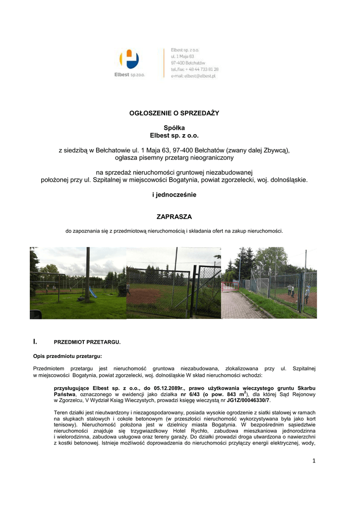 1 OGŁOSZENIE O SPRZEDAŻY Spółka Elbest sp. z oo z siedzibą w