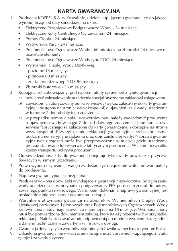 KARTA GWARANCYJNA 1. Producent KOSPEL S.A. w Koszalinie, udziela kupującemu gwarancji co do jakości wyrobu, licząc od daty sprzedaży, na okres: • Elektryczne Przepływowe Podgrzewacze Wody - 24 miesiące. • Elektryczne Kotły Centralnego Ogrzewania - 24 miesiące. • Pompy Ciepła - 24 miesiące. • Wytwornice Pary - 24 miesiące. • Pojemnościowe Ogrzewacze Wody - 60 miesięcy na zbiornik i 24 miesiące na pozostałe elementy. • Pojemnościowe Ogrzewacze Wody typu POC- 24 miesiące. • Wymienniki Ciepłej Wody Użytkowej, - poziome 48 miesięcy, - pionowe 60 miesięcy. - ze stali nierdzewnej INOX 96 miesięcy • Zbiorniki buforowe - 36 miesięcy. 2. Kupujący jest zobowiązany, pod rygorem utraty uprawnień z tytułu gwarancji: a) powierzyć zainstalowanie urządzenia specjalistycznemu zakładowi usługowemu, b) zawiadomić autoryzowany punkt serwisowy (wykaz załączony do karty gwarancyjnej i dostępny na stronie: www.kospel.pl) o ujawnieniu się wady urządzenia w terminie 7 dni od daty tego zdarzenia. c) w przypadku pompy ciepła i wytwornicy pary należy zawiadomić producenta o ujawnieniu wady w ciągu 7 dni od daty tego zdarzenia. Dane kontaktowe serwisu fabrycznego są załączone do karty gwarancyjnej i dostępne na stronie www.kospel.pl. Przy zgłoszeniu reklamacji gwarancyjnej trzeba koniecznie podać numer seryjny urządzenia oraz opis zaistniałej wady. Naprawa gwarancyjna tych urządzeń może być przeprowadzona w miejscu gdzie urządzenie jest zainstalowane lub w serwisie fabrycznym producenta. W takim przypadku koszty transportu pokrywa producent. 3. Odpowiedzialność z tytułu gwarancji obejmuje tylko wady powstałe z przyczyn tkwiących w samym urządzeniu. 4. Prawo wyboru czy usunąć wadę czy dostarczyć urządzenie wolne od wad należy do producenta. 5. Naprawa gwarancyjna jest bezpłatna. 6. Producent wykona obowiązki wynikające z gwarancji niezwłocznie, po zgłoszeniu wady urządzenia (a w przypadku podgrzewaczy EPS po dostarczeniu) do autoryzowanego punktu serwisowego. Warunkiem dokonania naprawy gwarancyjnej jest posiadanie niniejszej karty i dokumentu zakupu. 7. Warunkiem utrzymania gwarancji na zbiornik w Wymiennikach Ciepłej Wody Użytkowej poziomych i pionowych oraz Pojemnościowych Ogrzewaczach Wody jest wymiana anody magnezowej co najmniej raz na 18 miesięcy. Wymiana anody musi być potwierdzona dokumentem zakupu, który należy przedstawić w przypadku reklamacji. Należy stosować anodę odpowiednią do modelu wymiennika, zgodnie z danymi technicznymi zawartymi w instrukcji obsługi. 8. Gwarancja dotyczy tylko wyrobów zakupionych i użytkowanych na terytorium Polski. 9. Udzielona gwarancja nie wyłącza, ani nie ogranicza uprawnień kupującego z tytułu rękojmi za wady fizyczne. f.559 numer seryjny urządzenia pieczęć i podpis sprzedawcy miejscowość i data pieczęć i podpis instalatora ADNOTACJE SERWISU Kospel S.A., ul. Olchowa 1, 75-136 Koszalin, Serwis Fabryczny infolinia 801011235 tel. +48 94 31 70 565; fax +48 94 31 70 561 e-mail: [email protected]