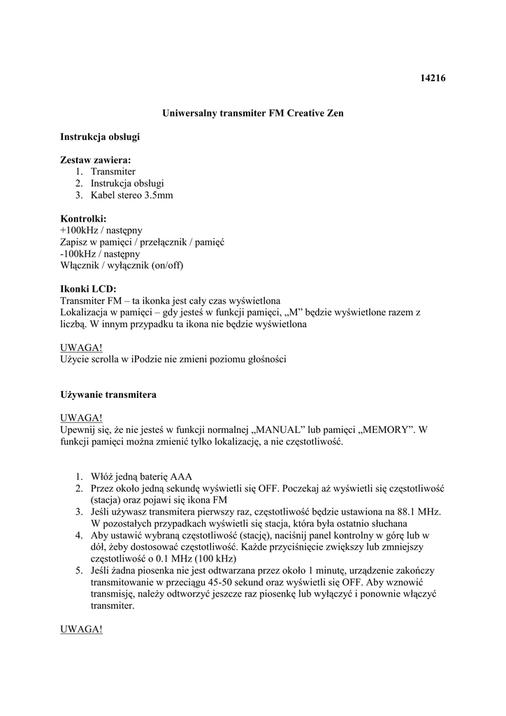 14216 Uniwersalny transmiter FM Creative Zen Instrukcja
