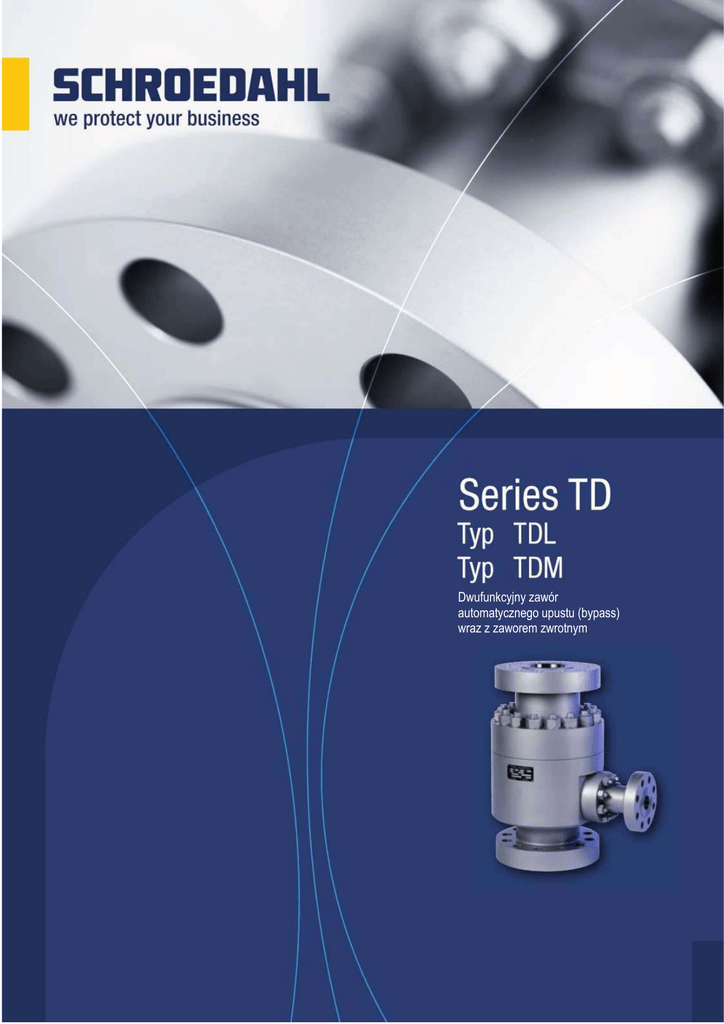 Dwufunkcyjny zawór automatycznego upustu (bypass) wraz z zaworem zwrotnym Seria Dwufunkcyjny zawór automatycznego upustu(bypass) wraz zaworem zwrotnym jest używany jako zabezpieczenie dla pomp odśrodkowych Wstęp SCHROEDAHL jest największym na świecie dostawcą automatycznych zaworów automatycznego upustu. Te zawory/systemy zabezpieczenia pomp są naszymi głównymi produktami. Przez ostatnie 45 lat dostarczyliśmy ponad 45,000 takich zaworów i usatysfakcjonowaliśmy klientów na całym świecie. Właściwości Automatyczne działanie by-pass Funkcja modulacji Tanie utrzymanie Łatwy w montażu Tłumienie pulsowania systemu Odpowiedni do wszystkich cieczy Samodzielne działanie Zmniejsza nakłady inwestycyjne i koszty eksploatacyjne Zastosowanie, przykład Z przykładowej charakterystyki pompy wynika, że: Punkt pracy:Q100=120m3/h dla słupa wody HQ100=280m Qmax=134 m3/h dla słupa wody HQmax =265 m Qmin=40 m3/h dla słupa wody HQmin=375 m Funkcjonowanie zaworu obrazuje następujący przykład: 1. Kiedy pompa pompuję do rurociągu głównego 120 m3/h, to by-pass jest zamknięty. 2. Kiedy pompa pompuję do rurociągu głównego 25 m3/h, to przez by-pass przepływa ca 15 m3/h. 3. Kiedy rurociąg główny jest zamknięty to pompa pompuje 40 m3/h przez by-pass. Zainstalowanie zaworu recyrkulacyjnego zapewnia samoczynne odprowadzenie minimalnego wydatku pompy zasilającej, kiedy rurociąg główny jest zamknięty lub pobór przez rurociąg główny jest mniejszy od minimalnego wydatku pompy co chroni pompę przed uszkodzeniem. Eksploatacja Przepływ w rurociągu głównym ustawia zawór zwrotny (grzybek) na odpowiedniej odległości od gniazda osadczego. Natomiast bypass poprzez dźwignię ustawiany jest w jednoznacznym, skorelowanym położeniu.. Całkowity minimalny przepływ jest recyrkulowane kiedy zawór zwrotny jest osadzony w gnieździe. Bypas jest całkowicie zamknięty gdy zawór zwrotny jest podniesiony (dla przepływu powyżej wartości minimalnej) tak aby umożliwić całkowicie przepływ z pompy do rurociągu. Fig.1: Rysunek zaworu automatycznego upustu typu TDM Funkcjonowanie Zaworu Automatycznego Upustu Czułość przepływu Typ TDM Zawór zwrotny podnosi się wraz ze wzrastającym przepływem i opada wraz ze spadkiem przepływu. Natomiast bypass TDM składa się z zaworu zwrotnego (Rys.2) z bypasem typu M (Rys.4). Ruch dźwigni jest przenoszony przez tłoczek do wielostopniowego VORTEX-trzpienia Minimalny przepływ jest modulowany przez kilka poziomów redukcji. Możliwość zastosowania dla ciśnień od 20 bar do 250bar. Standardowo z zabezpieczeniem przed cofaniem cieczy. poprzez dźwignię ustawiany jest w jednoznacznym, skorelowanym położeniu (Rys.3 i 4) Typ TDL Rys. 3: Bypas L TDL składa się z zaworu zwrotnego (Rys.2) z bypasem typu L (Rys.3). Dźwignia kontroluje pozycje przepustu, który przy przesuwie odsłania otwory w głowicy. Minimalny przepływ w ten sposób jest modulowany. Możliwość zastosowania dla ciśnienie do 40 bar. Standardowo z zabezpieczeniem przed cofaniem płynu. Rys. 4: Bypas M Rys. 2 . Opcja A ręcznego rozruchu lub rozgrzania może być dodana na życzenie. Rozmiary zaworów Materiały Standardowe rozmiary od DN25(1”) do DN 300 (12”). Standardowe materiały obudowy: ASTM A105 (stal węglowa), DIN 1,0460 ASTM 316L (stal nierdzewna), DIN 1,4404 Ciśnienie znamionowe Wielkości ciśnienia znamionowego zaczynają się od PN10 do PN 400 (150lbs do 2500lbs). Inne wielkości na życzenie. Połączenie Kołnierze standardowo są zgodne z DIN lub ASME, Kołnierze zgodne z pozostałymi standardami (DIN, ISO, BS, JIS, NF) są dostępne na życzenie. Połączenia wejściowe i wyjściowe mogą być równie przygotowane do spawania. Połączenie z bypasem jest zawsze kołnierzowe (do celów inspekcyjnych). Rozruch A ręczny na życzenie. Kod rozmiaru Kod klasy ciśnienia Detale zaworów TD są wykonane z stali nierdzewnej z minimalną zawartością chromu 13%. Inne kute materiały na korpusy i detali zaworu dostępne są na życzenie. Dobór materiału uszczelek jest dokonywany odpowiednio do rodzaju medium i temperatury pracy zaworu. Materiał korpusów jest dobierany odpowiednio do medium, ciśnienia i temperatury pracy. Kod połączenia Kod wykonania Kołnierz wg DIN Montaż pionowy Kołnierz wg ASME Montaż poziomy Rozruch ręczny Końce do spawania Większy bypas lub Połączenie rozruchowe Stal węglowa Stal nierdzewna Przykład: TDM116UVW-CS: Typ zaworu TDM DN100, PN 100, ASME- kołnierz, pionowy montaż, materiał korpusów- stal węglowa Lista części korpus Bypas L korpus Bypas L Poz. Poz. Opis Dolna część korpusu Górna część korpusu Tarcza prowadnika Prowadnik Sprężyna śrubowa Zawór zwrotny Grzybek zaworu Trzon zaworu TulejaVenturiego Korpus recyrkulacji Kołek ustalający Śruba dwustronna Śruba dwustronna Nakrętka sześciokątna Nakrętka sześciokątna O-Ring Opis Głowica sterująca Dźwignia Kołek łożyskowy Ramię dźwigni Tuleja sterująca Kolpak z otworami O-ring O-ring Sprężyna śrubowa Pierścień Bypas M Rozruch ręczny Bypass M Rozruch ręczny Poz. Opis Vortex - tuleja Vortex - stożek Obsada Zawleczka Tarcza z otworami O-ring O-ring O-ring Poz. Opis Vortex - tuleja Głowica sterująca Vortex - trzpień Dźwignia Kołek łożyskowy Tuleja odciążeniowa Tłok odciążeniowy Pierścień gwintowany Tarcza z otworami O-Ring O-Ring O-Ring Glyd-Ring O-Ring Glyd-Ring O-Ring Glyd-Ring O-Ring Dobór wielkości Uwagi Nominalna wielkość ciśnienia zaworu automatycznego upustu powinna zostać dobrana taka sama jak wyjściowa pompy Poniższa tabela służy tylko jako wskazówka. Inne wielkości bypasów dostępne na życzenie. Dla finalnego doboru zaworu prosimy skontaktować się z naszym biurem. Kod wielkości 05 06 07 08 09 10 11 12 13 15 16 17 DN P, R(mm) 25 32 40 50 65 80 100125 150200250 300 Dn P, (cale) 1 11/4 11/2 2 21/2 3 4 5 6 8 10 12 Główny przepływ P,R 17 28 45 68114178 270400 5308801380 2000 dla z