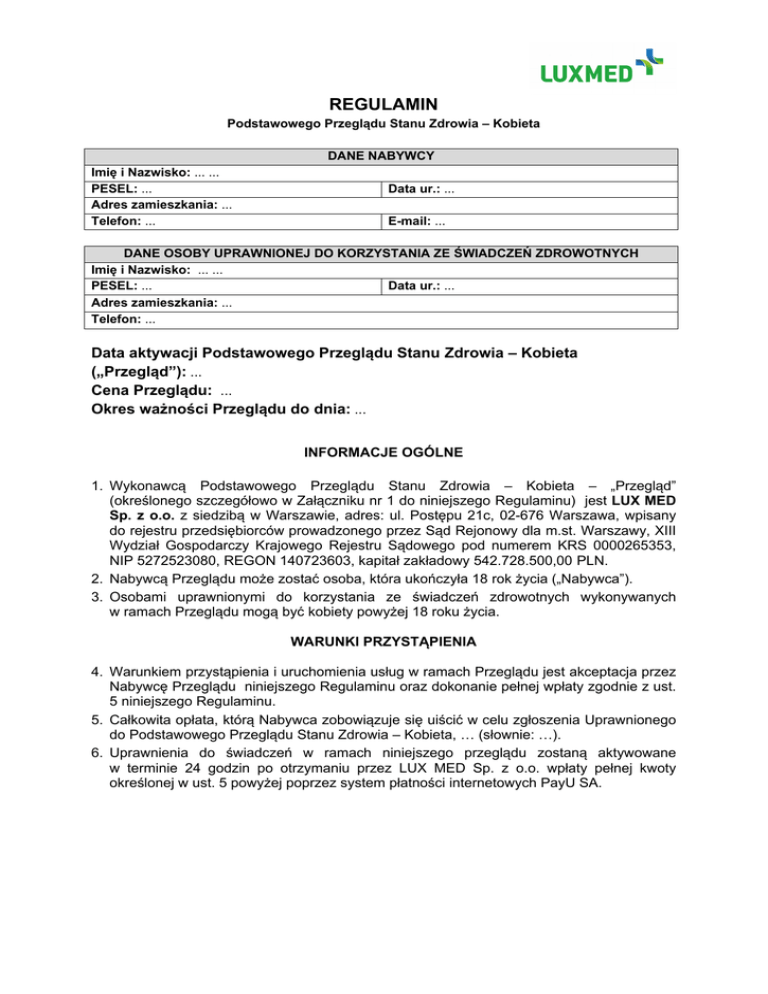 REGULAMIN Podstawowego Przeglądu Stanu Zdrowia – Kobieta DANE NABYWCY Imię i Nazwisko: ... ... PESEL: ... Adres zamieszkania: ... Telefon: ... Data ur.: ... E-mail: ... DANE OSOBY UPRAWNIONEJ DO KORZYSTANIA ZE ŚWIADCZEŃ ZDROWOTNYCH Imię i Nazwisko: ... ... PESEL: ... Data ur.: ... Adres zamieszkania: ... Telefon: ... Data aktywacji Podstawowego Przeglądu Stanu Zdrowia – Kobieta („Przegląd”): ... Cena Przeglądu: ... Okres ważności Przeglądu do dnia: ... INFORMACJE OGÓLNE 1. Wykonawcą Podstawowego Przeglądu Stanu Zdrowia – Kobieta – „Przegląd” (określonego szczegółowo w Załączniku nr 1 do niniejszego Regulaminu) jest LUX MED Sp. z o.o. z siedzibą w Warszawie, adres: ul. Postępu 21c, 02-676 Warszawa, wpisany do rejestru przedsiębiorców prowadzonego przez Sąd Rejonowy dla m.st. Warszawy, XIII Wydział Gospodarczy Krajowego Rejestru Sądowego pod numerem KRS 0000265353, NIP 5272523080, REGON 140723603, kapitał zakładowy 542.728.500,00 PLN. 2. Nabywcą Przeglądu może zostać osoba, która ukończyła 18 rok życia („Nabywca”). 3. Osobami uprawnionymi do korzystania ze świadczeń zdrowotnych wykonywanych w ramach Przeglądu mogą być kobiety powyżej 18 roku życia. WARUNKI PRZYSTĄPIENIA 4. Warunkiem przystąpienia i uruchomienia usług w ramach Przeglądu jest akceptacja przez Nabywcę Przeglądu niniejszego Regulaminu oraz dokonanie pełnej wpłaty zgodnie z ust. 5 niniejszego Regulaminu. 5. Całkowita opłata, którą Nabywca zobowiązuje się uiścić w celu zgłoszenia Uprawnionego do Podstawowego Przeglądu Stanu Zdrowia – Kobieta, … (słownie: …). 6. Uprawnienia do świadczeń w ramach niniejszego przeglądu zostaną aktywowane w terminie 24 godzin po otrzymaniu przez LUX MED Sp. z o.o. wpłaty pełnej kwoty określonej w ust. 5 powyżej poprzez system płatności internetowych PayU SA. ODSTĄPIENIE I REZYGNACJA Z PRZEGLĄDU 7. W ciągu 14 dni od dnia zaakceptowania niniejszego Regulaminu Nabywca może odstąpić od Umowy o udzielanie świadczeń zdrowotnych na podstawie niniejszego Regulaminu bez podania przyczyny, składając LUX MED sp. z o.o. oświadczenie na piśmie i przesyłając je na adres: [email protected]. 8. Prawo odstąpienia od umowy zawartej na odległość nie przysługuje Nabywcy, który rozpoczął wykonywanie usług w ramach Przeglądu przed upływem 14 dni od dnia zawarcia umowy. WARUNKI REALIZACJI PRZEGLADU 9. Udzielanie świadczeń zdrowotnych w ramach Przeglądu odbywa się w placówkach własnych podmiotu leczniczego LUX MED sp. z o.o. działających pod nazwą LUX MED i Medycyna Rodzinna szczegółowo wymienionych w Załączniku nr 2 do niniejszego Regulaminu. 10. W celu prawidłowego przygotowania się do badań w ramach Przeglądu należy zapoznać się z Załącznikiem nr 3 do niniejszego Regulaminu. 11. Usługi w ramach Przeglądu można zrealizować w ciągu 3 miesięcy od dnia aktywowania uprawnień do Przeglądu. 12. Warunkiem udzielenia świadczenia zdrowotnego w ramach Przeglądu jest uprzednie uzgodnienie jego terminu. Termin udzielenia świadczenia uzgodnić należy z personelem odpowiedniej recepcji osobiście lub telefonicznie pod numerem ogólnopolskiej rezerwacji wizyt i badań: ( 22 ) 33 22 888. KONTAKT I REKLAMACJE 13. Reklamacje przyjmowane są wyłącznie w formie pisemnej. 14. Reklamacje dotyczące obsługi rozpatrywane są w ciągu 5 dni roboczych, reklamacje dotyczące kwestii medycznych rozpatrywane są w ciągu 14 dni roboczych od daty wpływu wszystkich danych niezbędnych do rozpatrzenia reklamacji na adres: LUX MED Sp. z o.o. Departament Obsługi Klienta Dział Zarządzania Reklamacjami ul. Postępu 21c 02-676 Warszawa lub na adres poczty elektronicznej: [email protected] POSTANOWIENIA KOŃCOWE 15. Nie ma możliwości dokonania cesji uprawnień przysługujących w ramach Przeglądu na inną osobę. 16. Zakup Przeglądu oraz korzystanie ze świadczeń zdrowotnych w ramach Przeglądu nie łączy się z żadnymi innymi promocjami ani rabatami na jakiekolwiek usługi. 17. Integralną część Regulaminu stanowi Załącznik nr 1, 2 i 3. Załącznik nr 1: Wykaz usług Podstawowego Przeglądu Stanu Zdrowia – Kobieta Badania laboratoryjne: Badania z krwi wraz z pobraniem materiału (krew) do badania Morfologia + płytki + rozmaz automatyczny OB/ESR Transaminaza ALT Transaminaza AST Lipidogram (cholesterol całkowity, cholesterol HDL, cholesterol LDL, trójglicerydy) Glukoza na czczo Kreatynina TSH Badania moczu wraz z pobraniem materiału (mocz) do badania: Badanie ogólne moczu Badania diagnostyki obrazowej: EKG spoczynkowe USG jamy brzusznej USG piersi Konsultacje: Konsultacja internisty lub lekarza medycyny rodzinnej z omówieniem wyników i wydaniem zaleceń na przyszłość. Załącznik nr 2: Lista placówek biorących udział w Podstawowym Przeglądzie Stanu Zdrowia Kobieta. Możliwość realizacji usługi objętej Przeglądem jest uwarunkowana jej dostępnością w danej placówce. BYDGOSZCZ LX Chołoniewskiego 46 BIAŁYSTOK LX Komisji Edukacji Narodowej 50 LX Mickiewicza 39 LX Al. Tysiąclecia Państwa Polskiego 10 GDAŃSK LX Jana Pawła II 7 LX Zwycięstwa 49 MR Pomorska 96 GDYNIA LX Morska 127 MR Porębskiego 9 GORZÓW WIELKOPOLSKI LX Górczyńska 17 KATOWICE LX Karłowicza 11 MR Sowińskiego 46 MR Bogucicka 14 LX Sokolska 29 KRAKÓW LX Lublańska 38 LX Słowackiego 64 LX Mehoffera 10 LX Wadowicka 6 LX Puszkarska 7H MR Lubelska 29 MR Frycza Modrzewskiego 2 MR Wadowicka 8W ŁÓDŹ LX Dowborczyków 30/34 LX Milionowa 2G MR Milionowa 21 OLSZTYN LX Głowackiego 28 OPOLE MR Fieldorfa 2 POZNAŃ LX Półwiejska 42 LX Roosevelta 18 LX Wichrowa 1A MR Serbska 11 RZESZÓW LX Al. Kopisto 1 SZCZECIN LX Al. Niepodległości 44 MR Mickiewicza 128A MR Odzieżowa 12A TORUŃ LX Kościuszki 71 TYCHY MR Damrota 47 A WARSZAWA LX Bobrowiecka 1 LX 17 Stycznia 49 LX 17 Stycznia 39 LX Domaniewska 41B / LX Wołoska 7 LX Al. Jana Pawła II 78 LX Al. Jerozolimskie 65/79 LX Al. Jerozolimskie 162 LX Chmi