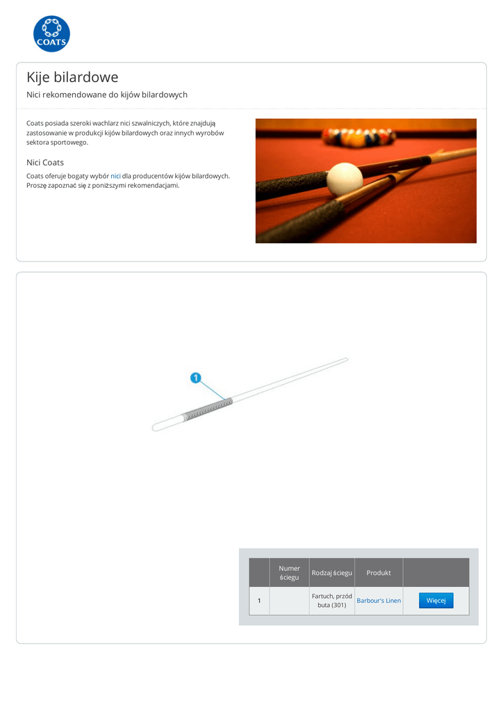 Kije bilardowe Nici rekomendowane do kijów bilardowych Coats posiada szeroki wachlarz nici szwalniczych, które znajdują zastosowanie w produkcji kijów bilardowych oraz innych wyrobów sektora sportowego. Nici Coats Coats oferuje bogaty wybór nici dla producentów kijów bilardowych. Proszę zapoznać się z poniższymi rekomendacjami. Numer ściegu 1 Rodzaj ściegu Fartuch, przód buta (301) Produkt Barbour's Linen Więcej Premium Nici przemysłowe Coats dostępne są w szerokiej gamie rodzajów włókien i wykończeń, z których każdy opracowany jest pod kątem konkretnych potrzeb naszych klientów. Zapraszamy do zapoznania się z naszą bogatą ofertą poniżej. W przypadku dostępności innych opcji, proszę wybrać odpowiednią opcję z listy. Wygląd szwu 1 - Rodzaj ściegu Fartuch, przód buta (301) Numer ściegu - Górna nitka Dolna nitka Produkt Tex Tkt Produkt Tex Tkt Barbour's Linen 276 lub 368 lub 460 - - - - Ponieważ rodzaje produktów i warunki zastosowania nici znacznie się między sobą różnią, Coats ani jego poszczególne oddziały nie mogą zagwarantować jednolitych rezultatów. Niniejsze zalecenia udzielone są w dobrej wierze, jednak bez gwarancji i odpowiedzialności ze strony firmy lub jej pracowników. Nie możemy zagwarantować, że produkt jest odpowiedni do określonego zastosowania. Klienci zawsze powinni przeprowadzić własne testy. W przypadku wątpliwości prosimy o odwołanie się do warunków użytkowania serwisu.