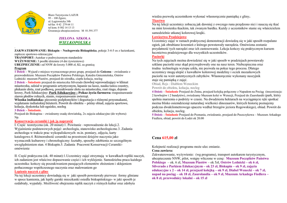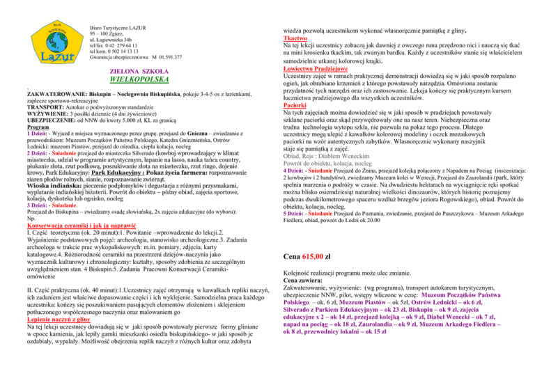 Biuro Turystyczne LAZUR 95 – 100 Zgierz, ul. Łagiewnicka 34b tel/fax 0 42 279 64 11 tel kom. 0 502 14 13 13 Gwarancja ubezpieczeniowa M 01.591.377 ZIELONA SZKOŁA WIELKOPOLSKA . ZAKWATEROWANIE: Biskupin – Noclegownia Biskupińska, pokoje 3-4-5 os z łazienkami, zaplecze sportowo-rekreacyjne TRANSPORT: Autokar o podwyższonym standardzie WYŻYWIENIE: 3 posiłki dziennie (4 dni żywieniowe) UBEZPIECZENIE: od NNW do kwoty 5.000 zł, KL za granicą Program 1 Dzień: - Wyjazd z miejsca wyznaczonego przez grupę. przejazd do Gniezna – zwiedzanie z przewodnikiem: Muzeum Początków Państwa Polskiego, Katedra Gnieznieńska, Ostrów Lednicki: muzeum Piastów, przejazd do ośrodka, ciepła kolacja, nocleg 2 Dzień: - Śniadanie przejazd do miasteczka Silverado (kowboj wprowadzający w klimat miasteczka, udział w programie artystycznym, łapanie na lasso, nauka tańca country, płukanie złota, rzut podkową, poszukiwanie złota na miasteczku, rzut ringo, dojenie krowy, Park Edukacyjny: Park Edukacyjny : Pokaz życia farmera: rozpoznawanie ziaren płodów rolnych, sianie, rozpoznawanie zwierząt. Wioska indiańska: pieczenie podpłomyków i degustacja z różnymi przysmakami, wyplatanie indiańskiej biżuterii. Powrót do obiektu – późny obiad, zajęcia sportowe, kolacja, dyskoteka lub ognisko, nocleg 3 Dzień: - Śniadanie. Przejazd do Biskupina – zwiedzamy osadę słowiańską, 2x zajęcia edukacyjne (do wyboru): Np. Konserwacja ceramiki i jak ją naprawić I. Część teoretyczna (ok. 20 minut):1. Powitanie –wprowadzenie do lekcji.2. Wyjaśnienie podstawowych pojęć: archeologia, stanowisko archeologiczne.3. Zadania archeologa w trakcie prac wykopaliskowych: m.in. pomiary, zdjęcia, karty katalogowe.4. Różnorodność ceramiki na przestrzeni dziejów-naczynia jako wyznacznik kulturowy i chronologiczny: kształty, sposoby zdobienia ze szczególnym uwzględnieniem stan. 4 Biskupin.5. Zadania Pracowni Konserwacji Ceramikiomówienie II. Część praktyczna (ok. 40 minut):1.Uczestnicy zajęć otrzymują w kawałkach repliki naczyń, ich zadaniem jest właściwe dopasowanie części i ich wyklejenie. Samodzielna praca każdego uczestnika: kończy się poszukiwaniem pasujących elementów złożeniem i sklejeniem potłuczonego współczesnego naczynia oraz malowaniem go Lepienie naczyń z gliny Na tej lekcji uczestnicy dowiadują się w jaki sposób powstawały pierwsze formy gliniane w epoce kamienia, jak lepiły garnki mieszkanki osiedla biskupińskiego- w jaki sposób je ozdabiały, wypalały. Możliwość obejrzenia replik naczyń z różnych kultur oraz zdobyta wiedza pozwolą uczestnikom wykonać własnoręcznie pamiątkę z gliny. Tkactwo Na tej lekcji uczestnicy zobaczą jak dawniej z owczego runa przędzono nici i nauczą się tkać na mini krosienku tkackim, tak zwanym bardku. Każdy z uczestników stanie się właścicielem samodzielnie utkanej kolorowej krajki. Łowiectwo Pradziejowe Uczestnicy zajęć w ramach praktycznej demonstracji dowiedzą się w jaki sposób rozpalano ogień, jak obrabiano krzemień z którego powstawały narzędzia. Omówiona zostanie przydatność tych narzędzi oraz ich zastosowanie. Lekcja kończy się praktycznym kursem łucznictwa pradziejowego dla wszystkich uczestników. Paciorki Na tych zajęciach można dowiedzieć się w jaki sposób w pradziejach powstawały szklane paciorki oraz skąd przywędrowały one na nasz teren. Niebezpieczna oraz trudna technologia wytopu szkła, nie pozwala na pokaz tego procesu. Dlatego uczestnicy mogą ulepić z kawałków kolorowej modeliny i oczek mozaikowych paciorki na wzór autentycznych zabytków. Własnoręcznie wykonany naszyjnik staje się pamiątką z zajęć. Obiad, Rejs : Diabłem Weneckim Powrót do obiektu, kolacja, nocleg 4 Dzień: - Śniadanie Przejazd do Żnina, przejazd kolejką połączony z Napadem na Pociąg (inscenizacja: 2 kowbojów i 2 bandytów), zwiedzamy Muzeum kolei w Wenecji, Przejazd do Zaurolandii (park, który spełnia marzenia o podróży w czasie. Na dwudziestu hektarach na wyciągnięcie ręki spotkać można blisko osiemdziesiąt naturalnej wielkości dinozaurów, których historię poznajemy podczas dwukilometrowego spaceru wzdłuż brzegów jeziora Rogowskiego), obiad. Powrót do obiektu, kolacja, nocleg. 5 Dzień: - Śniadanie Przejazd do Poznania, zwiedzanie, przejazd do Puszczykowa – Muzeum Arkadego Fiedlera, obiad, powrót do Łodzi ok 20.00 Cena 615,00 zł Kolejność realizacji programu może ulec zmianie. Cena zawiera: Zakwaterowanie, wyżywienie: (wg programu), transport autokarem turystycznym, ubezpieczenie NNW, pilot, wstępy wliczone w cenę: Muzeum Początków Państwa Polskiego – ok. 6 zł, Muzeum Piastów – ok 5zł, Ostrów Lednicki – ok 6 zł, Silverado z Parkiem Edukacyjnym – ok 23 zł, Biskupin – ok 9 zł, zajęcia edukacyjne x 2 – ok 14 zł, przejazd kolejką – ok 9 zł, Diabeł Wenecki – ok 7 zł, napad na pociąg – ok 18 zł, Zaurolandia – ok 9 zł, Muzeum Arkadego Fiedlera – ok 8 zł, przewodnicy lokalni – ok 15 zł