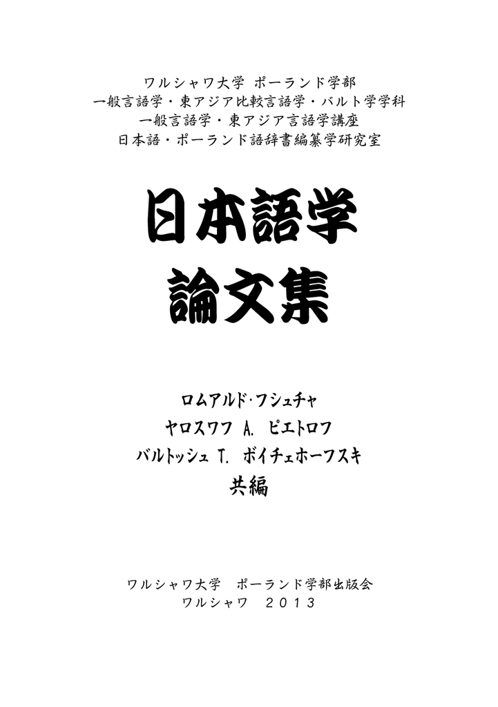 ワルシャワ大学 ポーランド学部 一般言語学・東アジア比較言語学・バルト学学科 一般言語学・東アジア言語学講座 日本語・ポーランド語辞書編纂学研究室 ロムアルド・フシュチャ ヤロスワフ A. ピエトロフ バルトッシュ T. ボイチェホーフスキ 共編 ワルシャワ大学 ポーランド学部出版会 ワルシャワ 2013 Uniwersytet Warszawski, Wydział Polonistyki Katedra Językoznawstwa Ogólnego, Wschodnioazjatyckiego Porównawczego i Bałtystyki Zakład Językoznawstwa Ogólnego i Wschodnioazjatyckiego Pracownia Leksykografii Polsko-Japońskiej Studia z językoznawstwa japońskiego Pod redakcją naukową Romualda Huszczy Jarosława A. Pietrowa Bartosza T. Wojciechowskiego Wydawnictwo Wydziału Polonistyki UW Warszawa 2013 Biblioteka Fundacji im. Takashimy Seria „Linguistica Asiatica Orientalia” Wydano nakładem Wydziału Polonistyki Uniwersytetu Warszawskiego e-mail: [email protected] Opracowanie redakcyjne, korekta i skład komputerowy zespół Projekt okładki Bartosz T. Wojciechowski Publikacja finansowana przez Fundację im. Takashimy RECENZENT TOMU Jerzy Bańczerowski © Copyright by Authors and Faculty of Polish Studies, University of Warsaw Warszawa 2013 ISBN 978-83-62100-75-0 Druk i oprawa Zakład Graficzny Uniwersytetu Warszawskiego. Zam. 1016/2013 Spis treści Od redaktorów ............................................................................................... 7 Jak południowi barbarzyńcy uczyli się języka japońskiego, czyli pierwsze kontakty językowe między Japonią a Europą Aleksandra Wąsowicz-Peinado ................................................................... 9 Fleksja typu aglutynacyjnego. Rozważania nad paradygmatem fleksyjnym czasownika japońskiego Jan Majewski .................................................................................................. 29 Kseniczność fonologiczna warstwy gairaigo we współczesnym języku japońskim Bartosz T. Wojciechowski ............................................................................ 47 Jeżeli chodzi o wa. Partykuła wa jako wykładnik tematu w zdaniu japońskim Zofia Stankiewicz .......................................................................................... 83 Kategoria causativum w języku japońskim Tomasz Majtczak ........................................................................................... 97 Semiotyka tak zwanych wyrażeń grzecznościowych języków naturalnych na przykładach z systemu keigo w języku japońskim oraz polskiego systemu honoryfikatywnego Arkadiusz Jabłoński ...................................................................................... 115 Sinojapońska odmiana pisma chińskiego – podstawy etymologii grafemicznej Jarosław A. Pietrow ....................................................................................... 139 JIS – systemy komputerowych kodowań ideogramów przeznaczonych do zapisu języka japońskiego Radosław Bolałek ........................................................................................... 167 Wschodnioazjatycka honoryfikatywność w katolickim stylu liturgicznym – przyczynek do dyskusji Jarosław A. Pietrow, Bartosz T. Wojciechowski ....................................... 179 Wybrane zagadnienia historycznej fonologii chińsko-japońskich kontaktów międzyjęzykowych Marek Sargalski ............................................................................................. 191 Językowy obraz pieniądza w japońskiej paremiologii i frazeologii Janusz Olszewski ........................................................................................... 249 Podstawowe pojęcia grafemiki języka japońskiego z perspektywy relatywizmu językowego Romuald Huszcza .......................................................................................... 281 Konceptualizacja przestrzeni emocji przy użyciu japońskiego leksemu ki. Próba naszkicowania mapy semantycznej Bartosz T. Wojciechowski ............................................................................ 315 Grafemiczno-fonetyczna asymilacja zapożyczanych do japońszczyzny choronimów (nazw krajów) – na wybranych przykładach Ewa Strebeyko ............................................................................................... 333 Typologiczne własności spójki w języku japońskim, koreańskim i chińskim Jarosław A. Pietrow, Bartosz T. Wojciechowski ....................................... 363 Seria Linguistica Asiatica Orientalia jest wydawana przez Zakład Językoznawstwa Ogólnego i Wschodnioazjatyckiego oraz Pracownię Leksykografii Polsko-Japońskiej Uniwersytetu Warszawskiego i obejmuje opracowania z dziedziny szeroko pojętego językoznawstwa wschodnioazjatyckiego. W szczególności interesuje nas sfera cywilizacji pisma chińskiego i najbliżej związane z nią języki, takie jak chiński, japoński, koreański, wietnamski i inne. Lingwistyka wschodnioazjatycka od dawna wnosi do językoznawstwa światowego innowacyjne teoretycznie obserwacje oraz analizy zjawisk językowych, wcześniej rzadko obecne w europejskiej refleksji nad językiem. Do zjawisk takich należy przede wszystkim chińskie pismo ideograficzne — fascynujący mechanizm semiotyczny, odzwierciedlający mało na ogół uświadamiane związki mowy i pisma. Mamy nadzieję, że tematyka kolejnych tomów w tej serii zachęci do lektury Czytelników zainteresowanych nie tylko językoznawstwem, ale również innymi dziedzinami współczesnej humanistyki oraz samą Azją Wschodnią, coraz wyraźniej wyrastającą na nowe centrum cywilizacji światowej. W serii dotychczas ukazały się: Romuald Huszcza, Gramatykalizacje japońszczyzny, 2012 Christoph Janasiak, Wczesna prasa koreańska – modernizacja pisma i języka, 2012 Jarosław A. Pietrow, Japońskie czasowniki mówienia. Językowy obraz aktywności komunikacyjnej w świecie rytuałów i zależnoś
