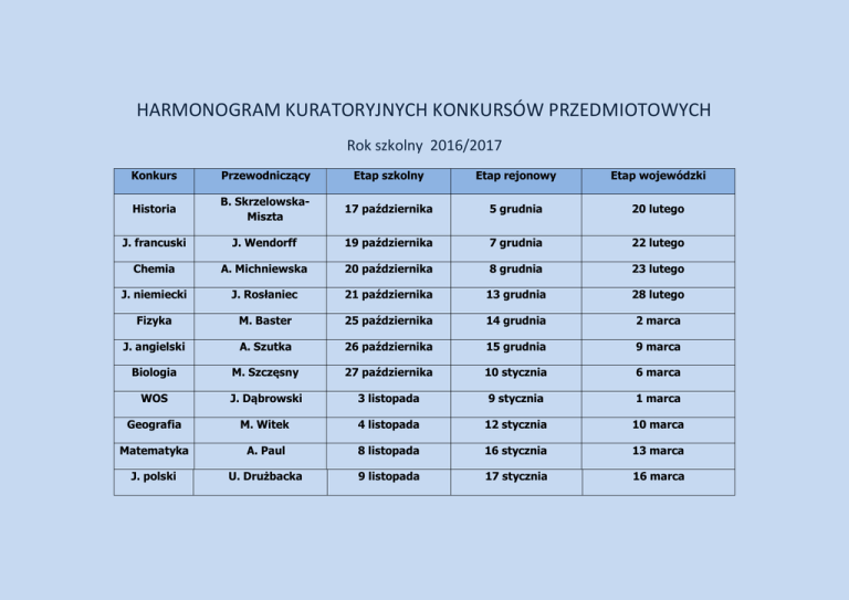 HARMONOGRAM KURATORYJNYCH KONKURSÓW PRZEDMIOTOWYCH Rok szkolny 2016/2017 Konkurs Przewodniczący Etap szkolny Etap rejonowy Etap wojewódzki Historia B. SkrzelowskaMiszta 17 października 5 grudnia 20 lutego J. francuski J. Wendorff 19 października 7 grudnia 22 lutego Chemia A. Michniewska 20 października 8 grudnia 23 lutego J. niemiecki J. Rosłaniec 21 października 13 grudnia 28 lutego Fizyka M. Baster 25 października 14 grudnia 2 marca J. angielski A. Szutka 26 października 15 grudnia 9 marca Biologia M. Szczęsny 27 października 10 stycznia 6 marca WOS J. Dąbrowski 3 listopada 9 stycznia 1 marca Geografia M. Witek 4 listopada 12 stycznia 10 marca Matematyka A. Paul 8 listopada 16 stycznia 13 marca J. polski U. Drużbacka 9 listopada 17 stycznia 16 marca