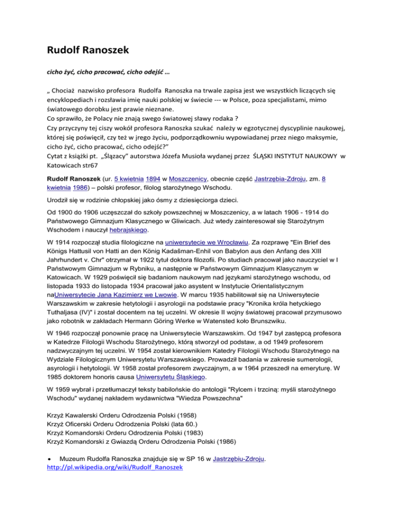 Rudolf Ranoszek cicho żyć, cicho pracować, cicho odejść … „ Chociaż nazwisko profesora Rudolfa Ranoszka na trwale zapisa jest we wszystkich liczących się encyklopediach i rozsławia imię nauki polskiej w świecie --- w Polsce, poza specjalistami, mimo światowego dorobku jest prawie nieznane. Co sprawiło, że Polacy nie znają swego światowej sławy rodaka ? Czy przyczyny tej ciszy wokół profesora Ranoszka szukać należy w egzotycznej dyscyplinie naukowej, której się poświęcił, czy też w jrego życiu, podporządkowniu wypowiadanej przez niego maksymie, cicho żyć, cicho pracować, cicho odejść?” Cytat z książki pt. „Ślązacy” autorstwa Józefa Musioła wydanej przez ŚLĄSKI INSTYTUT NAUKOWY w Katowicach str67 Rudolf Ranoszek (ur. 5 kwietnia 1894 w Moszczenicy, obecnie część Jastrzębia-Zdroju, zm. 8 kwietnia 1986) – polski profesor, filolog starożytnego Wschodu. Urodził się w rodzinie chłopskiej jako ósmy z dziesięciorga dzieci. Od 1900 do 1906 uczęszczał do szkoły powszechnej w Moszczenicy, a w latach 1906 - 1914 do Państwowego Gimnazjum Klasycznego w Gliwicach. Już wtedy zainteresował się Starożytnym Wschodem i nauczył hebrajskiego. W 1914 rozpoczął studia filologiczne na uniwersytecie we Wrocławiu. Za rozprawę "Ein Brief des Königs Hattusil von Hatti an den König Kadašman-Enhil von Babylon aus den Anfang des XIII Jahrhundert v. Chr" otrzymał w 1922 tytuł doktora filozofii. Po studiach pracował jako nauczyciel w I Państwowym Gimnazjum w Rybniku, a następnie w Państwowym Gimnazjum Klasycznym w Katowicach. W 1929 poświęcił się badaniom naukowym nad językami starożytnego wschodu, od listopada 1933 do listopada 1934 pracował jako asystent w Instytucie Orientalistycznym naUniwersytecie Jana Kazimierz we Lwowie. W marcu 1935 habilitował się na Uniwersytecie Warszawskim w zakresie hetytologii i asyrologii na podstawie pracy "Kronika króla hetyckiego Tuthaljasa (IV)" i został docentem na tej uczelni. W okresie II wojny światowej pracował przymusowo jako robotnik w zakładach Hermann Göring Werke w Watensted koło Brunszwiku. W 1946 rozpoczął ponownie pracę na Uniwersytecie Warszawskim. Od 1947 był zastępcą profesora w Katedrze Filologii Wschodu Starożytnego, którą stworzył od podstaw, a od 1949 profesorem nadzwyczajnym tej uczelni. W 1954 został kierownikiem Katedry Filologii Wschodu Starożytnego na Wydziale Filologicznym Uniwersytetu Warszawskiego. Prowadził badania w zakresie sumerologii, asyrologii i hetytologii. W 1958 został profesorem zwyczajnym, a w 1964 przeszedł na emeryturę. W 1985 doktorem honoris causa Uniwersytetu Śląskiego. W 1959 wybrał i przetłumaczył teksty babilońskie do antologii "Rylcem i trzciną: myśli starożytnego Wschodu" wydanej nakładem wydawnictwa "Wiedza Powszechna" Krzyż Kawalerski Orderu Odrodzenia Polski (1958) Krzyż Oficerski Orderu Odrodzenia Polski (lata 60.) Krzyż Komandorski Orderu Odrodzenia Polski (1983) Krzyż Komandorski z Gwiazdą Orderu Odrodzenia Polski (1986) Muzeum Rudolfa Ranoszka znajduje się w SP 16 w Jastrzębiu-Zdroju. http://pl.wikipedia.org/wiki/Rudolf_Ranoszek