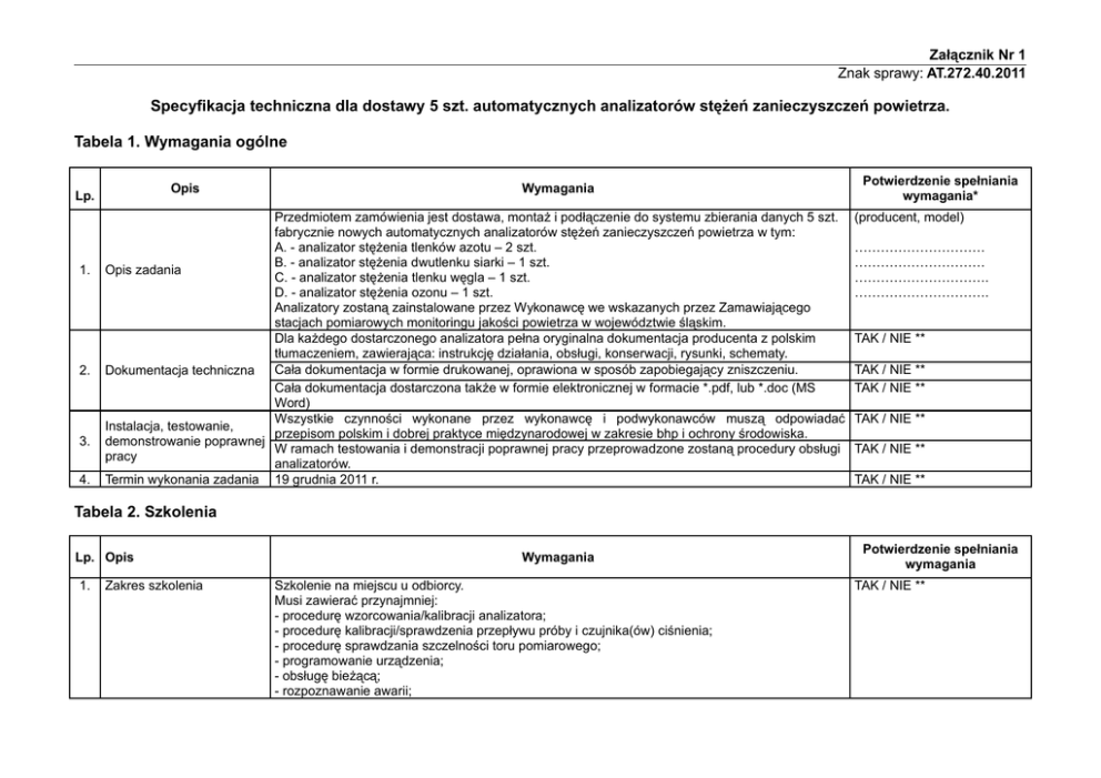 Załącznik Nr 1 Znak sprawy: AT.272.40.2011 Specyfikacja techniczna dla dostawy 5 szt. automatycznych analizatorów stężeń zanieczyszczeń powietrza. Tabela 1. Wymagania ogólne Opis Lp. 1. 2. 3. 4. Wymagania Przedmiotem zamówienia jest dostawa, montaż i podłączenie do systemu zbierania danych 5 szt. fabrycznie nowych automatycznych analizatorów stężeń zanieczyszczeń powietrza w tym: A. - analizator stężenia tlenków azotu – 2 szt. B. - analizator stężenia dwutlenku siarki – 1 szt. Opis zadania C. - analizator stężenia tlenku węgla – 1 szt. D. - analizator stężenia ozonu – 1 szt. Analizatory zostaną zainstalowane przez Wykonawcę we wskazanych przez Zamawiającego stacjach pomiarowych monitoringu jakości powietrza w województwie śląskim. Dla każdego dostarczonego analizatora pełna oryginalna dokumentacja producenta z polskim tłumaczeniem, zawierająca: instrukcję działania, obsługi, konserwacji, rysunki, schematy. Cała dokumentacja w formie drukowanej, oprawiona w sposób zapobiegający zniszczeniu. Dokumentacja techniczna Cała dokumentacja dostarczona także w formie elektronicznej w formacie *.pdf, lub *.doc (MS Word) Wszystkie czynności wykonane przez wykonawcę i podwykonawców muszą odpowiadać Instalacja, testowanie, przepisom polskim i dobrej praktyce międzynarodowej w zakresie bhp i ochrony środowiska. demonstrowanie poprawnej W ramach testowania i demonstracji poprawnej pracy przeprowadzone zostaną procedury obsługi pracy analizatorów. Termin wykonania zadania 19 grudnia 2011 r. Potwierdzenie spełniania wymagania* (producent, model) ………………………… ………………………… …………………………. …………………………. TAK / NIE ** TAK / NIE ** TAK / NIE ** TAK / NIE ** TAK / NIE ** TAK / NIE ** Tabela 2. Szkolenia Lp. Opis 1. Zakres szkolenia Wymagania Szkolenie na miejscu u odbiorcy. Musi zawierać przynajmniej: - procedurę wzorcowania/kalibracji analizatora; - procedurę kalibracji/sprawdzenia przepływu próby i czujnika(ów) ciśnienia; - procedurę sprawdzania szczelności toru pomiarowego; - programowanie urządzenia; - obsługę bieżącą; - rozpoznawanie awarii; Potwierdzenie spełniania wymagania TAK / NIE ** Załącznik Nr 1 Znak sprawy: AT.272.40.2011 Lp. Opis Potwierdzenie spełniania wymagania Wymagania - przygotowanie i przedstawienie harmonogramu prac obsługowych zapewniających wysoką jakość danych uzyskiwanych z analizatora; - inne zagadnienia zalecane przez producenta. Instalacja urządzenia musi być dokonana jako część programu szkolenia, aby umożliwić personelowi zleceniodawcy nabycie bezpośredniego doświadczenia w technikach instalacji. Tabela 3. Wymagania szczegółowe. A. Analizator stężenia tlenków azotu – 2 szt. Lp. 1. Opis Metoda pomiaru 2. Certyfikat 3. 5. 6. 7. 8. Zakres pomiarowy Dopuszczalna temperatura pracy Liniowość Granica wykrywalności (LDL) Dryft ZERO Dryft SPAN 9. Obudowa 4. Minimalne wymagania Ciągły pomiar automatyczny metodą chemiluminescencyjną zgodnie z normą PN-EN 14211:2005. Jakość powietrza atmosferycznego - Standardowa chemiluminescencyjna metoda pomiaru stężenia monotlenku i ditlenku azotu Raport z badań zgodności z normą PN-EN 14211:2005 wykonanych przez jednostkę autoryzowaną (posiadającą akredytację dotyczącą wykonania tego zadania zgodnie z EN ISO/IEC 17025). Do oferty należy załączyć całość raportu w języku polskim lub angielskim w formie pliku pdf lub doc oraz część zawierającą wnioski w formie drukowanej: - w języku polskim (gdy całość raportu dostarczono w formie pliku w języku polskim) lub w języku angielskim i przetłumaczone na język polski. Programowalny minimum od 0..200 ppb do 0..1 ppm Oferowane parametry TAK / NIE ** TAK / NIE ** co najmniej + 15.. + 35 °C ≤ 1% zakresu pomiarowego ≤ 0,5 ppb ≤ 0,5 ppb/24h ≤ 1 % pomiaru/24h - zewnętrzne wymiary obudowy muszą umożliwiać montaż analizatora w standardowym stojaku 19” TAK / NIE ** Załącznik Nr 1 Znak sprawy: AT.272.40.2011 Lp. 10. Opis Filtr wejściowy w torze poboru próby 11. Sposób kontroli Zero-Span 12. 13. 14. 15. Pompa poboru próby Zasilanie Wyposażenie dodatkowe Materiały eksploatacyjne 16. Wyjścia/wejścia sygnałowe Minimalne wymagania - filtr PTFE o średnicy 47 mm - przełączanie wejścia Pomiar-Zero-Span za pomocą zdalnie sterowanych elektrozaworów - zewnętrzna 230V AC 50Hz - jednofazowe 230V AC 50Hz - zdalnie sterowane elektrozawory Pomiar-Zero-Span - filtry PTFE 5 o średnicy 47 mm – 25 szt. 1. Cyfrowe szeregowe – wartość mierzona NO, NO2 i NOX, status, parametry pracy, zdalne sterowanie zaworów PomiarZero-Span Łącze szeregowe musi obsługiwać przynajmniej jeden z niżej wymienionych protokołów transmisji: - Environnement SA - Thermo Environmental Instruments - Fag - Monitor Labs - Ruprecht & Patashnick - Protocole JBUS - AKA Protocol - Horiba Protocol - API Protocol - Extended Environnement SA 2. Analogowe – wartość mierzona 0-1V lub 0-10V lub 4-20 mA dla NO,NO2 i NOX, status wartości mierzonej (normalny, awaria, ZERO, SPAN), zdalne sterowanie zaworów PomiarZero-Span Oferowane parametry TAK / NIE ** TAK / NIE ** TAK / NIE ** TAK / NIE ** TAK / NIE ** TAK / NIE ** 1. TAK / NIE ** 2. Załącznik Nr 1 Znak sprawy: AT.272.40.2011 Lp. 17. Opis Dostawa, instalacja, uruchomienie 18. Warunki gwarancji 19. Serwis pogwarancyjny Minimalne wymagania Dostawca zainstaluje i uruchomi analizator we wskazanej TAK / NIE ** przez Zamawiającego lokalizacji w stacji pomiarowej monitoringu jakości powietrza w województwie śląskim. Przy współpracy Zamawiającego uruchomi transmisję danych z analizatorów do istniejących dataloggerów typ Argopol SAMEX V3+1 CPU30 za pośrednictwem złącza szeregowego wykorzystując jeden z protokołów łączności: - Environnement SA - Thermo Environmental Instruments - Fag - Monitor Labs - Ruprecht & Patashnick - Protocole JBUS - AKA Protocol - 