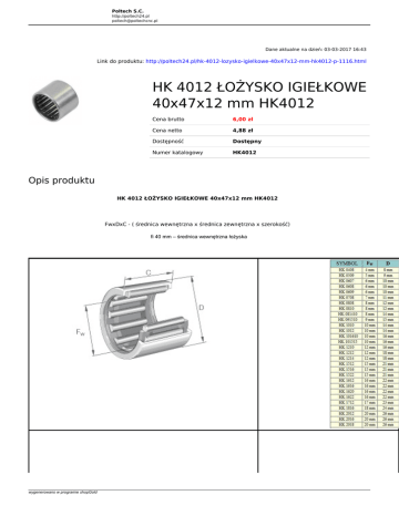 Poltech S.C. http://poltech24.pl [email protected] Dane aktualne na dzień: 03-03-2017 16:43 Link do produktu: http://poltech24.pl/hk-4012-lozysko-igielkowe-40x47x12-mm-hk4012-p-1116.html HK 4012 ŁOŻYSKO IGIEŁKOWE 40x47x12 mm HK4012 Cena brutto 6,00 zł Cena netto 4,88 zł Dostępność Dostępny Numer katalogowy HK4012 Opis produktu HK 4012 ŁOŻYSKO IGIEŁKOWE 40x47x12 mm HK4012 FwxDxC - ( średnica wewnętrzna x średnica zewnętrzna x szerokość) fi 40 mm – średnica wewnętrzna łożyska wygenerowano w programie shopGold Poltech S.C. http://poltech24.pl [email protected] Łożyska igiełkowe cienkościenne Łożyska igiełkowe cienkościenne składają się z pierścienia zewnętrznego z specjalnej blachy głębokotłocznej, igiełek i zamontowanego w pierścieniu zewnętrznym koszyka, którego bieżnia została poddana obróbce cieplnej. Z wszystkich łożysk z pierścieniem zewnętrznym ten typ wykazuje najcieńszy przekrój poprzeczny, co umożliwia kompaktową konstrukcję. W normalnym przypadku łożysko igiełkowe cienkościenne zaprojektowane jest tak, że wał służy bezpośrednio jako bieżnia, pierścień wewnętrzny nie jest potrzebny. Pierścień zewnętrzny tego łożyska jest tak skonstruowany, że igiełki i wieniec są nierozłączne. Ułatwia to wciskanie do sztywnego osadzenia łożyska z odpowiednią siłą. Ten typ łożyska nie potrzebuje żadnego segmentu zabezpieczającego itd. dla osiowego pasowania ciasnego, co ułatwia manipulowanie łożyskiem i montaż wygenerowano w programie shopGold Poltech S.C. http://poltech24.pl [email protected] wygenerowano w programie shopGold Powered by TCPDF (www.tcpdf.org)